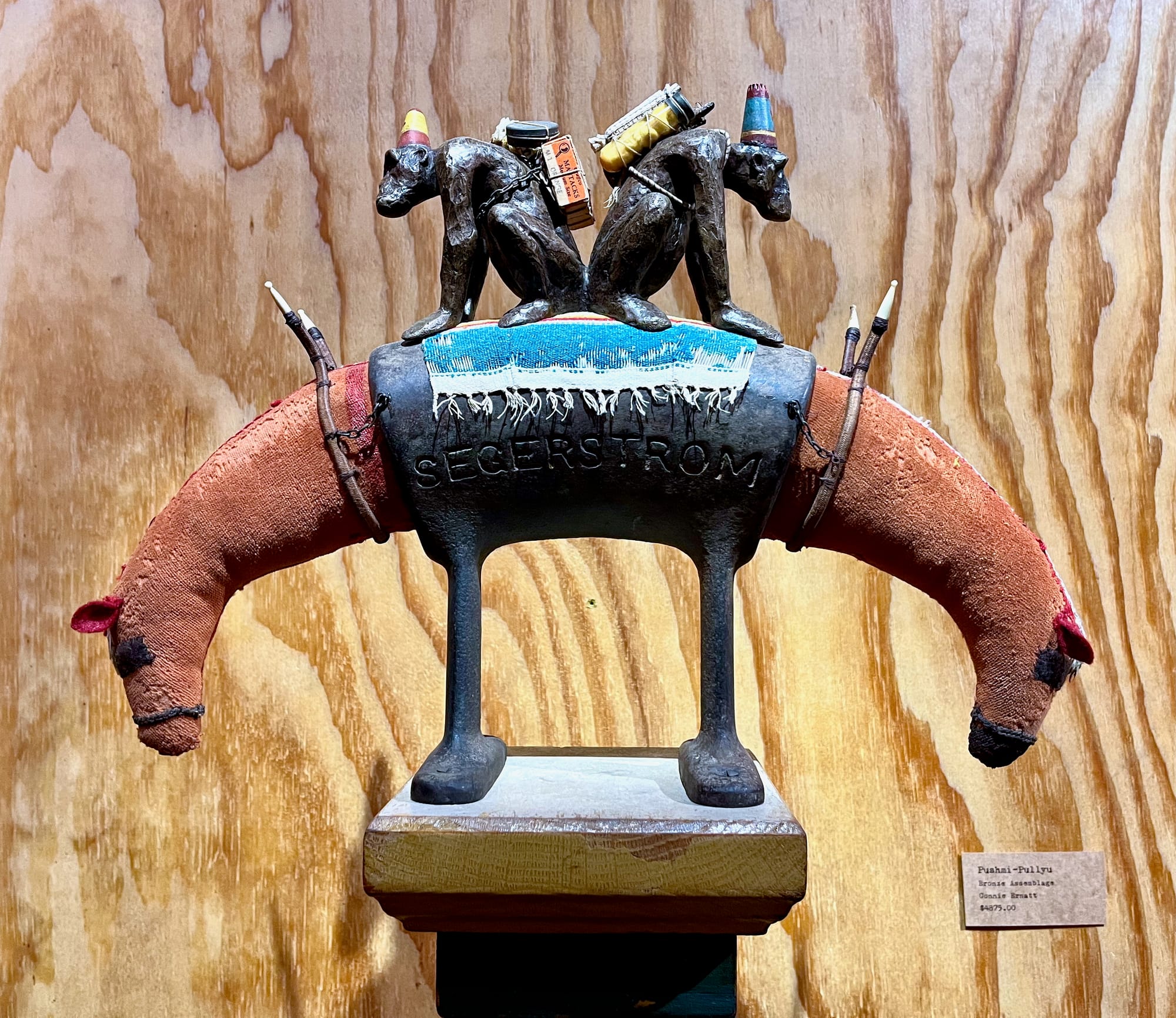 The whole thing indeed works, from the 14 new collaborations to the array of individual pieces that include John’s brilliantly colored and patterned "Sodbuster Series" of totem pole-like works in fiberglass, concrete, and paint, to Connie’s "Pushmi-Pullyu" bronze assemblage with two chimps, back-to-back, on blanketed horse figures with lowered heads — a work that somehow echoes the line and shape of James Earle Fraser’s sculpture "End of the Trail."