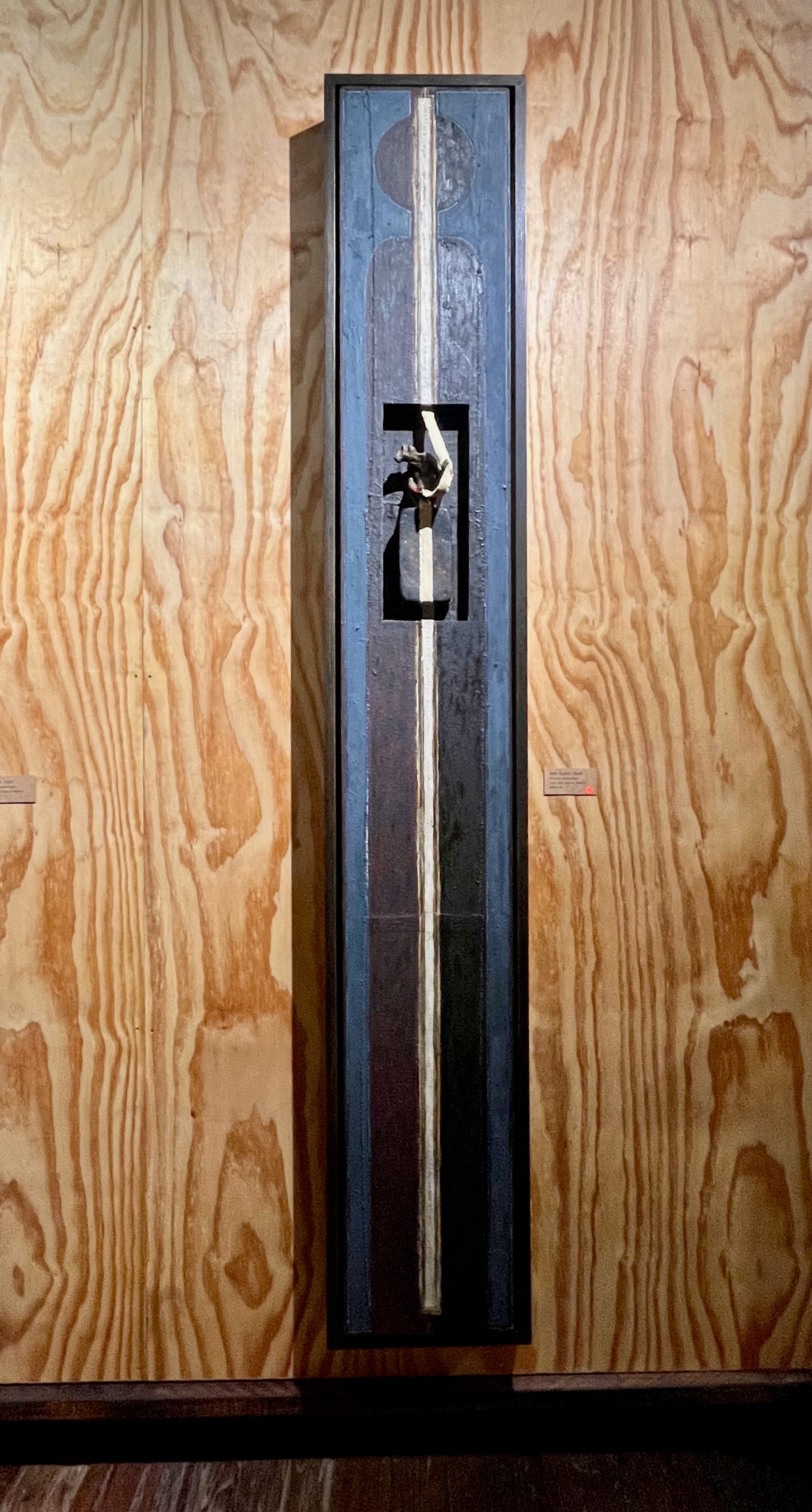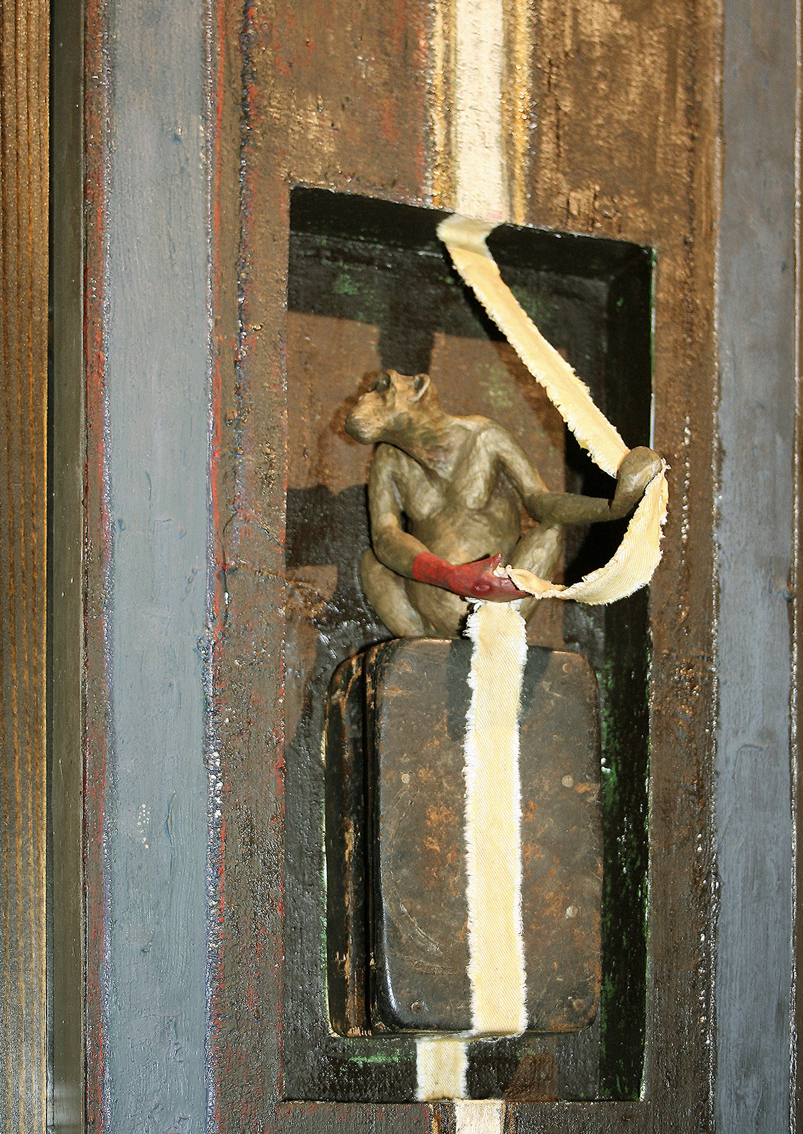 "Red Right Hand" is painted in the darkest hues of blue with an abstracted human figure in black divided in half by a central white stripe and rectangular inset found object (a tool of some sort?) atop which a bronze chimp with a red right hand sits. The chimp breaks out of the work’s linear front-surface boundary, although it still tied into the scene with a strip of white fabric. "Red Right Hand" is the first fully collaborative work that both Connie and John liked. “I think it’s just kind of a quiet, elegant piece,” he says, while she adds: “I knew we were off and running after that — this whole thing is going to work!”