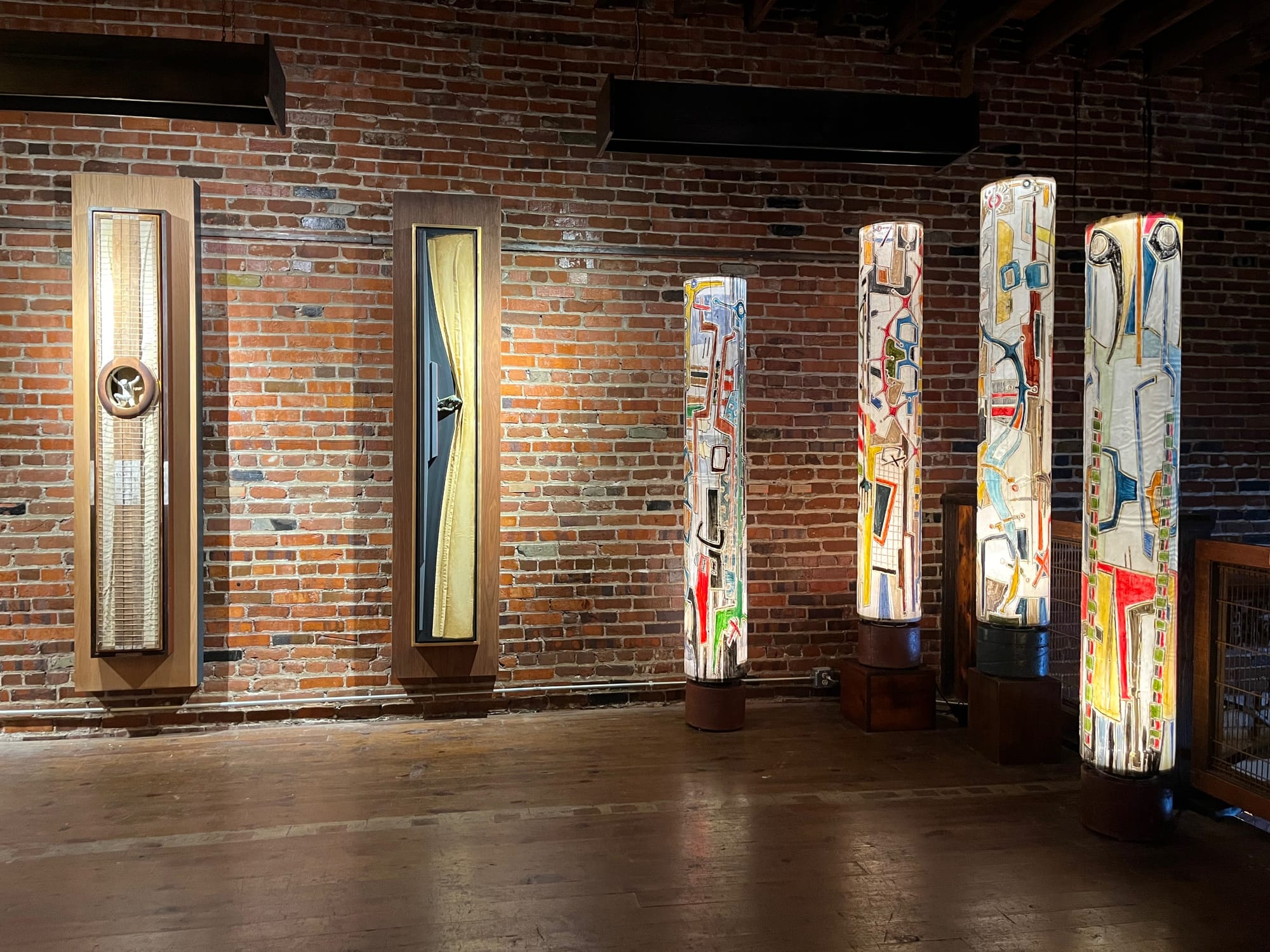 While Connie and John’s new collaborative works — 14 monolithic columns that are each part painting and part sculpture — provide the exhibition with its name, “The Collaborators” also includes individual works by each artist. Displayed on the first floor of the gallery, for example, (before ascending stairs to the main exhibition area) are two such pieces: Connie’s bronze assemblage titled "Brain Swap" and John’s "Green Press". The former features two cast bronze chimpanzee figures connected by wires passing through a miniature transmission tower that sparks to life when a red button is pushed, and the latter is a uniquely framed oil on panel work that’s the smallest of John’s pieces in the exhibition.