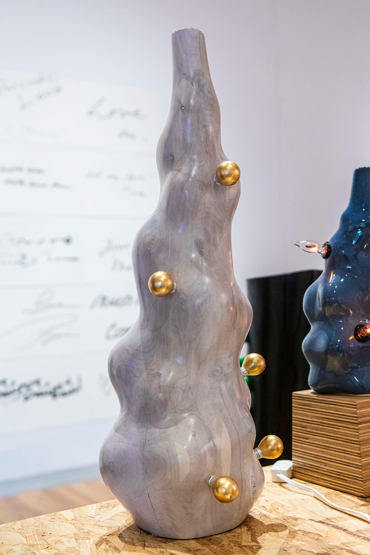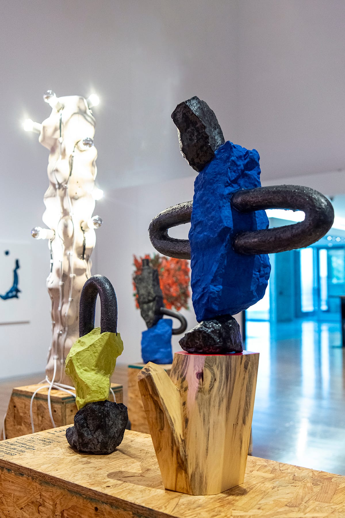 Mark Cowardin occupies most of the floor space in the exhibition with his work “Chat Fields,” made up of a collection of sculptural assemblages large and small. For years, Cowardin has explored unusual juxtapositions of natural and human-made materials — for instance, wooden beams joined with fluorescent lights. He also crafts materials so that they mimic the appearance of other things, like slip-cast ceramics that take on the look of brightly colored plastic.