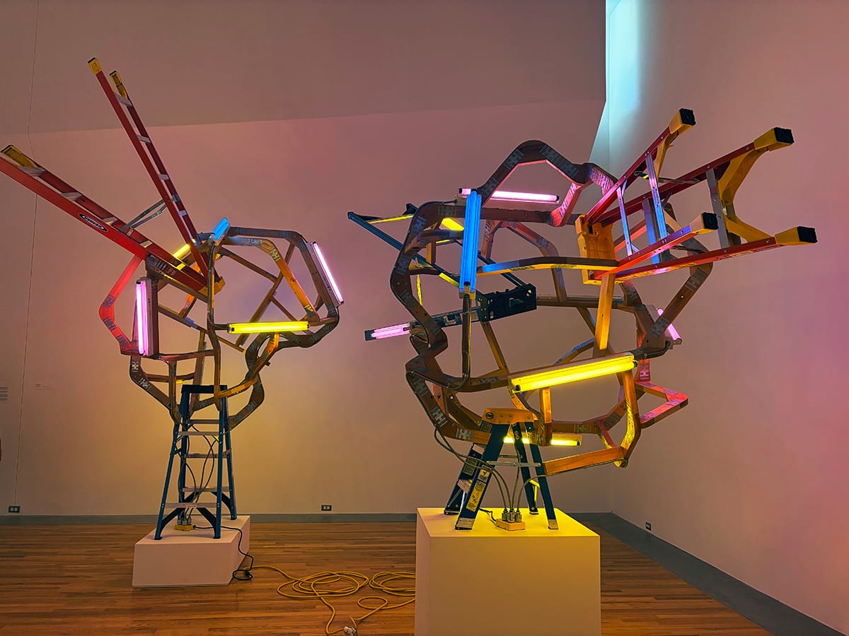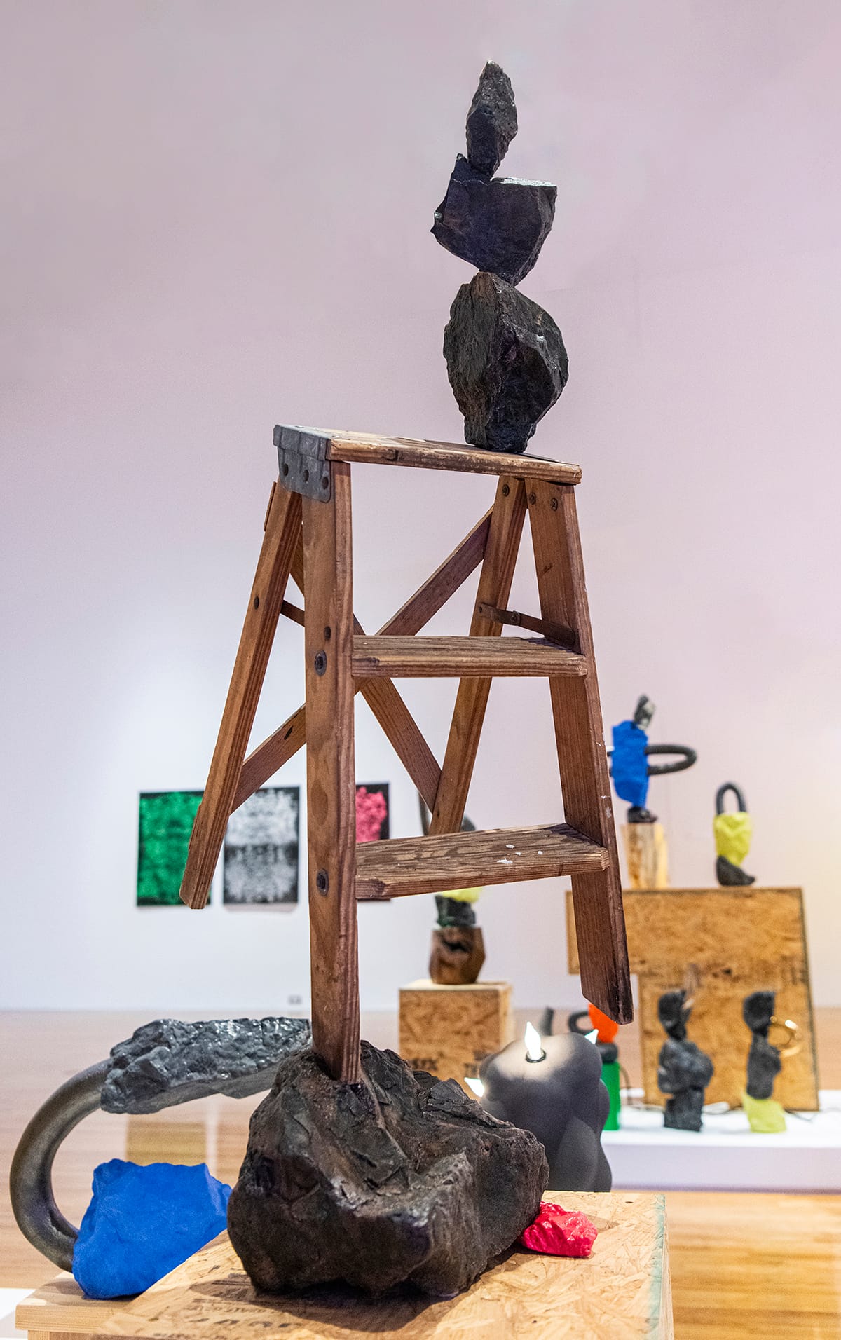 The accompanying label for his piece in the “Kansas Triennial 25/26” show eloquently frames Cowardin’s sculptures as an elegy to environmental extraction, mapping the arrangement of the elements to the mining sites of lead and zinc that surrounded his childhood home. If the sculptures meditate on the devastating impacts wrought by humans’ extraction of natural resources, we should not discount the whimsy that they also convey. Ladders become sculptural building blocks and Cowardin renders functional objects useless in a delightful, Duchampian tradition. Of course, one reading of the work does not refute the other. Whimsically upending these objects from the built environment feels like an absurdist response entirely appropriate to the current state of the world.