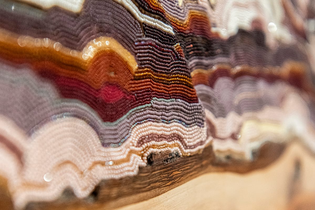 If woven baskets are a collective tradition shared by many cultures, Cliff’s beadwork speaks to a more specific cultural practice. As a member of the Gros Ventre (A’aninin) tribe, Cliff learned to bead from her grandmother as part of a tradition that has been passed through generations of maternal relations within the tribe. Using such beadwork to conjure a landscape is an insistent marking of presence, in this moment and in this place, and a material claiming of this place as well.
