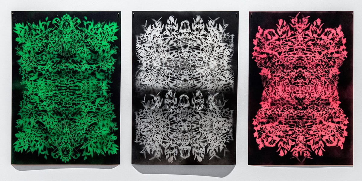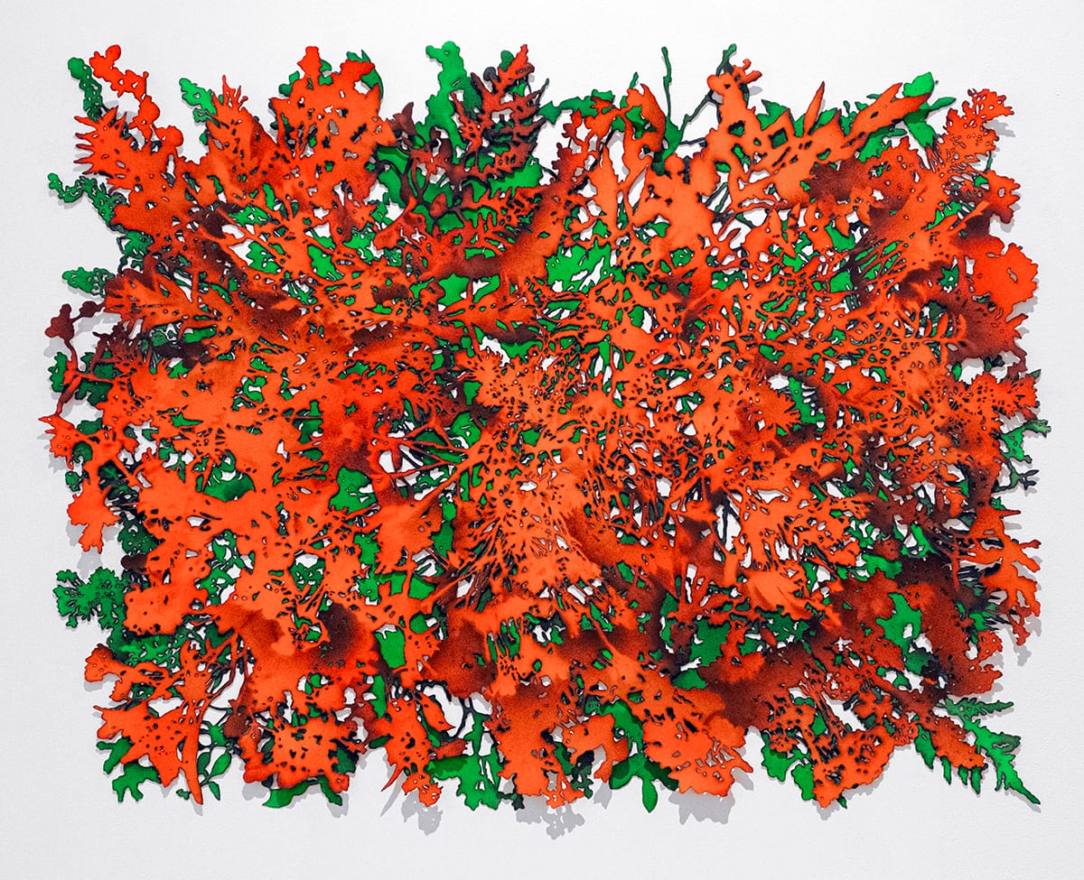 In “Untitled 1-3,” Resnick spray-paints stenciled images onto mylar that appear fleeting and transient. The irregular silhouettes prompted me to imagine how the fragile stencils must have fluttered against the force of the spray, lifting off the ground and threatening to disappear. In “Cenotaph (Orange/Green),” Resnick affixes two layers of burnt and painted paper directly to the wall. With bits of greens showing through the burnt areas of orange, it has an organic feeling of autumn, yet the title suggests that it is a memorial to those buried elsewhere.