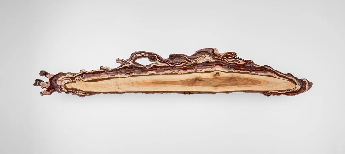 Mona Cliff’s works occupy the least amount of real estate in the show, but her materials speak loudly, nonetheless. In “Conjured Topography,” a cross-section of smooth maple wood stretches nine feet across the wall in an unframed evocation of landscape. The rough, live edge of the wood offers a dynamic foundation for the thousands of seed beads she builds up into forms that call to mind rolling hills or clouds hanging low above the horizon.