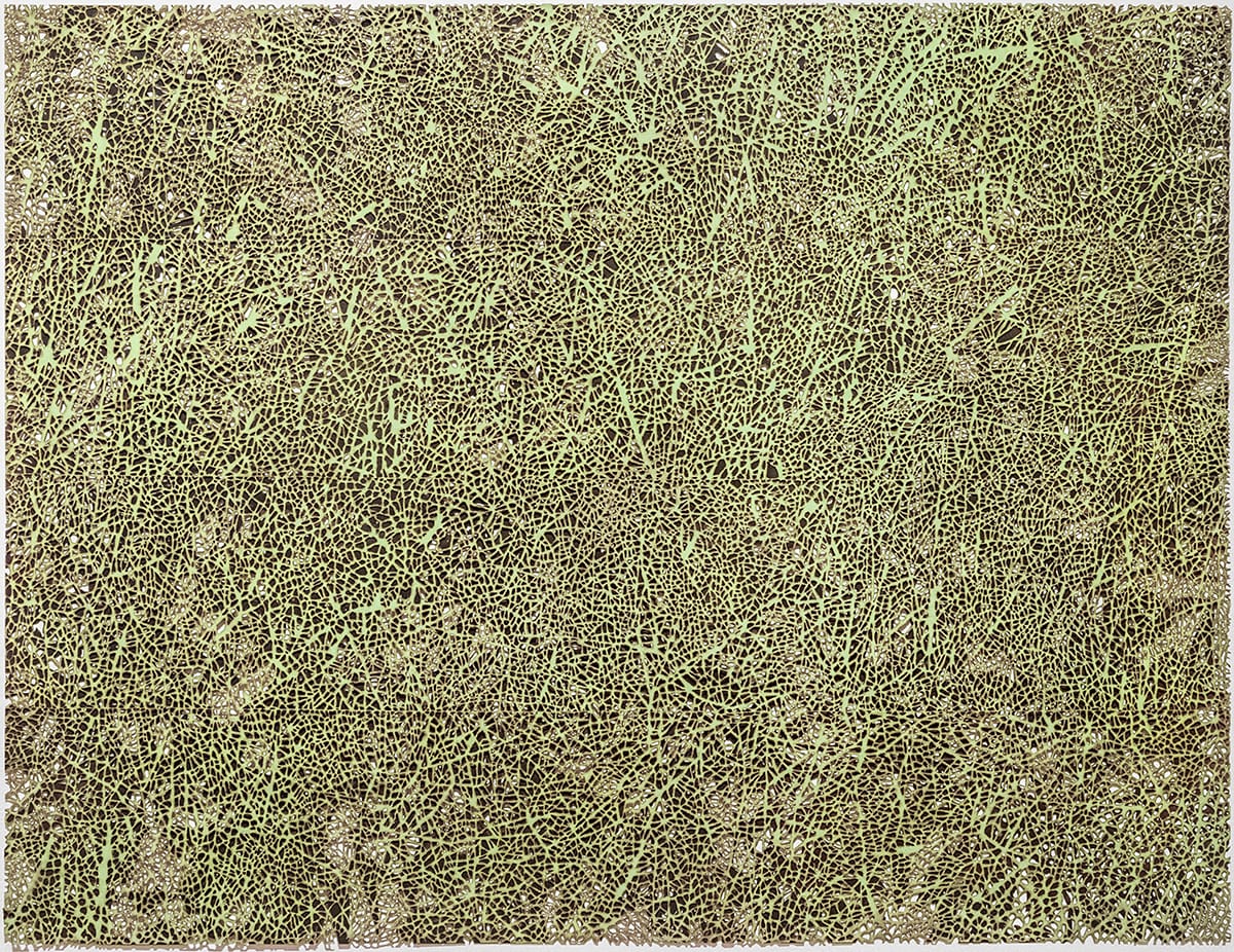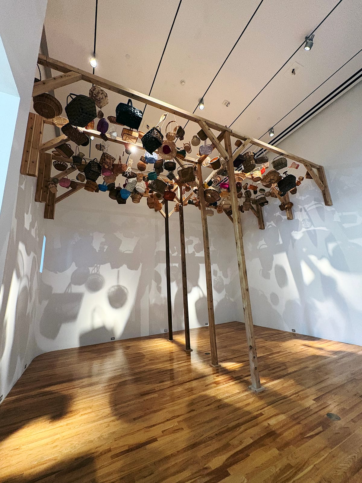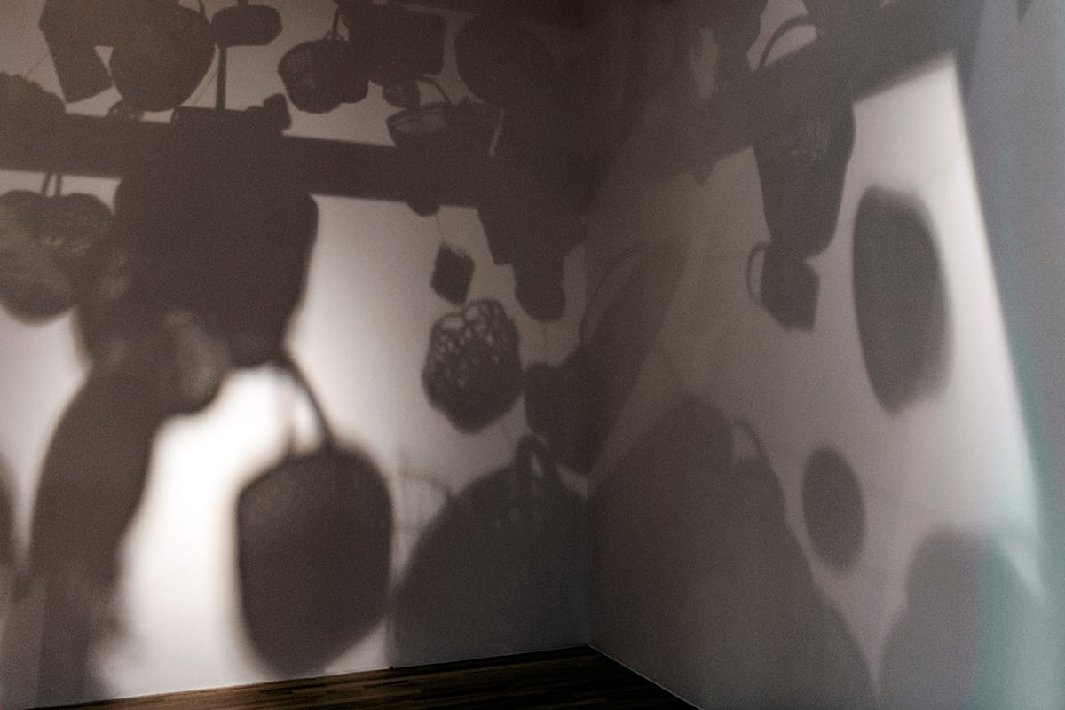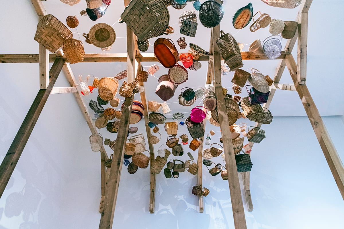Poppy DeltaDawn opens the exhibition with “Woven,” a room-sized installation of weaving — an act that evokes the importance of collective making. Hundreds of woven baskets hang from wooden beams high in the air, in a celebration of traditions shared by many cultures. The artist wove some of the baskets; others she selected, collected, and assembled for this work. Installed together, far out of reach, they create a woven ceiling that casts a spray of dappled light, as if filtered through tree leaves, with their patterned shadows covering the walls.