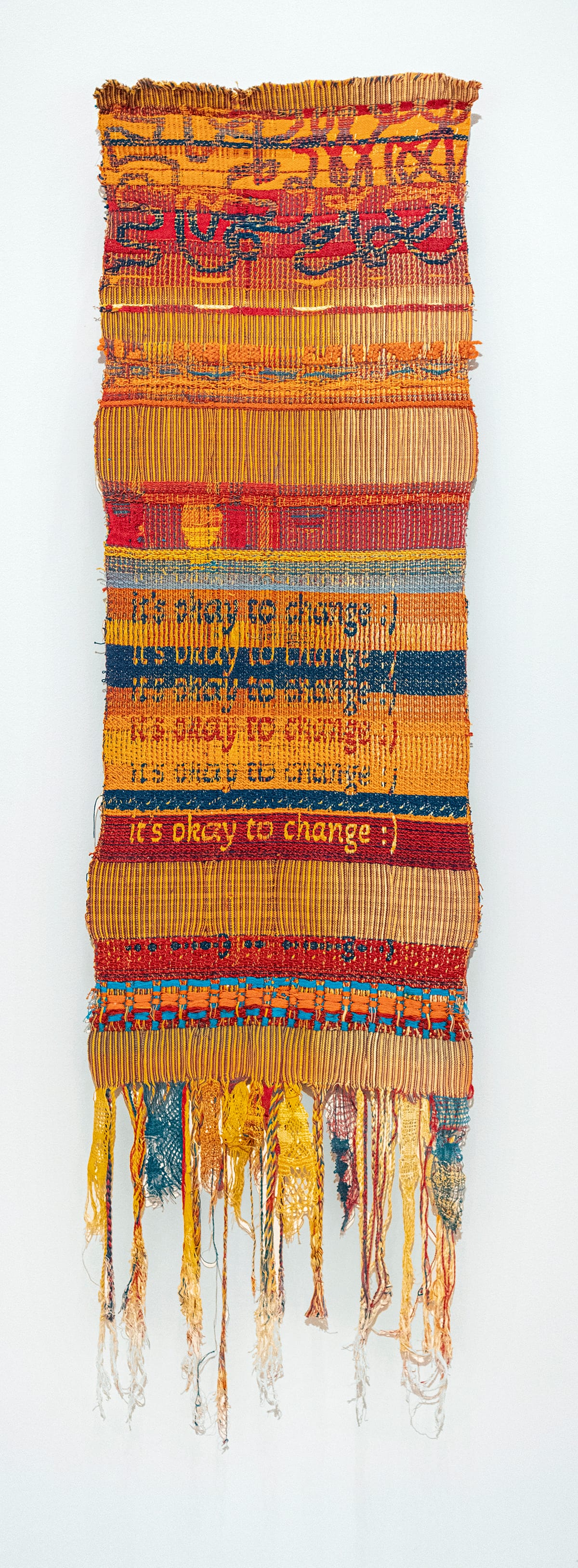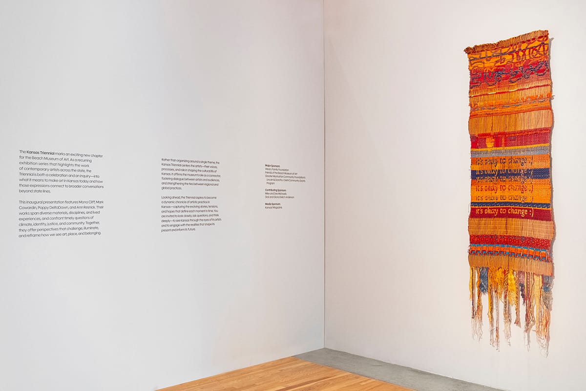 Poppy DeltaDawn, “It’s Okay to Change,” 2025, handwoven cotton thread. Photo courtesy of the Marianna Kistler Beach Museum of Art, Kansas State University.