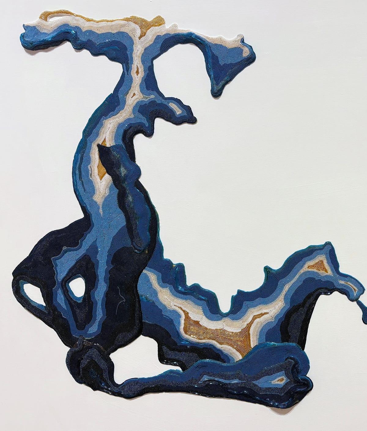 Cliff strings tiny seed beads and elongated bugle beads onto thread that she affixes to canvas with beeswax and resin. There is a tension between this evidence of repetitive, methodical labor and the visual dynamism of the beads across the surface. Cliff’s title evokes the wind, but the forms also bring to my mind ocean waves or the elegant movements of a painter mid-stroke. Maybe I can revise my earlier observation about the absence of painting in this exhibition. Mona Cliff seems to paint with beads, delighting our eyes with the illusion of colors side by side and offering up a moment of materials frozen in time.