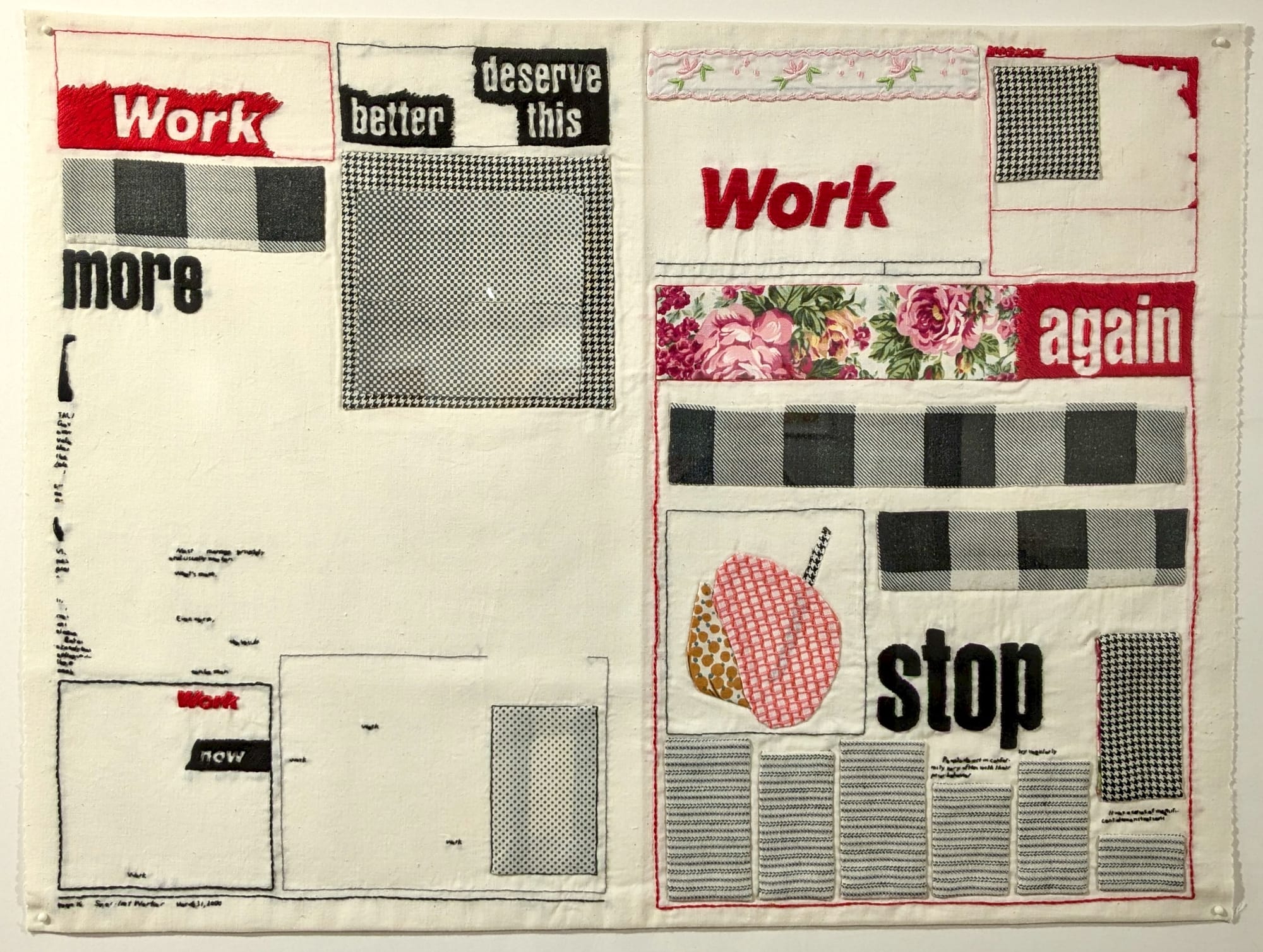 “Made for you by a professional seamstress,” an exhibition of fiber works, is on view through October 27.