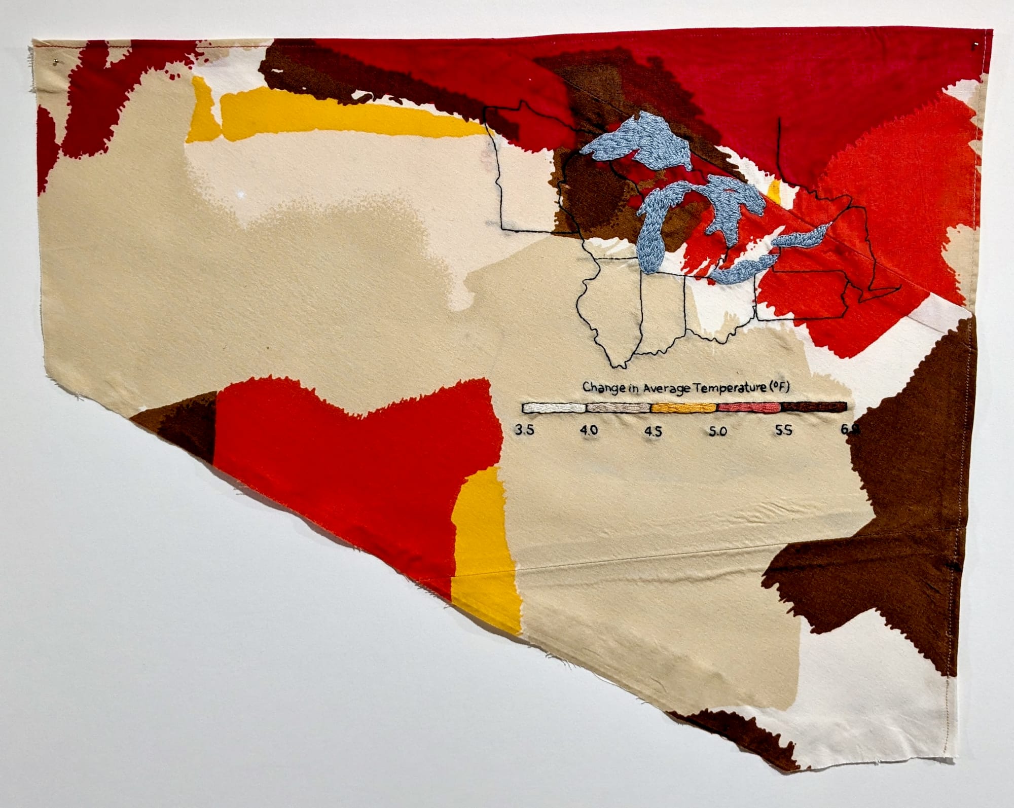 The series that resonated with me most strongly is “Sea Change,” an expression of the artist’s climate grief wherein Reimer embroiders real data visualizations of aspects of human-made climate change — including the all too close to home rapid shrinking of Great Plains aquifers — atop highly patterned pieces of fabric. The resulting visual clashes and echoes make one more aware of both the disturbing data and the way we take nature, that most common referent of fabric design, for granted as a cheerful background to human passions rather than a living world that our species is actively damaging and destroying.