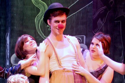 Left: Taurean Everett, Emily Therrian, and Alex Stoll who starred in "The Wild Party," which they went on to perform at the Kennedy Center. Right: Stoll, pictured at center, plays the character Burrs. Photos courtesy of Wichita State University.
