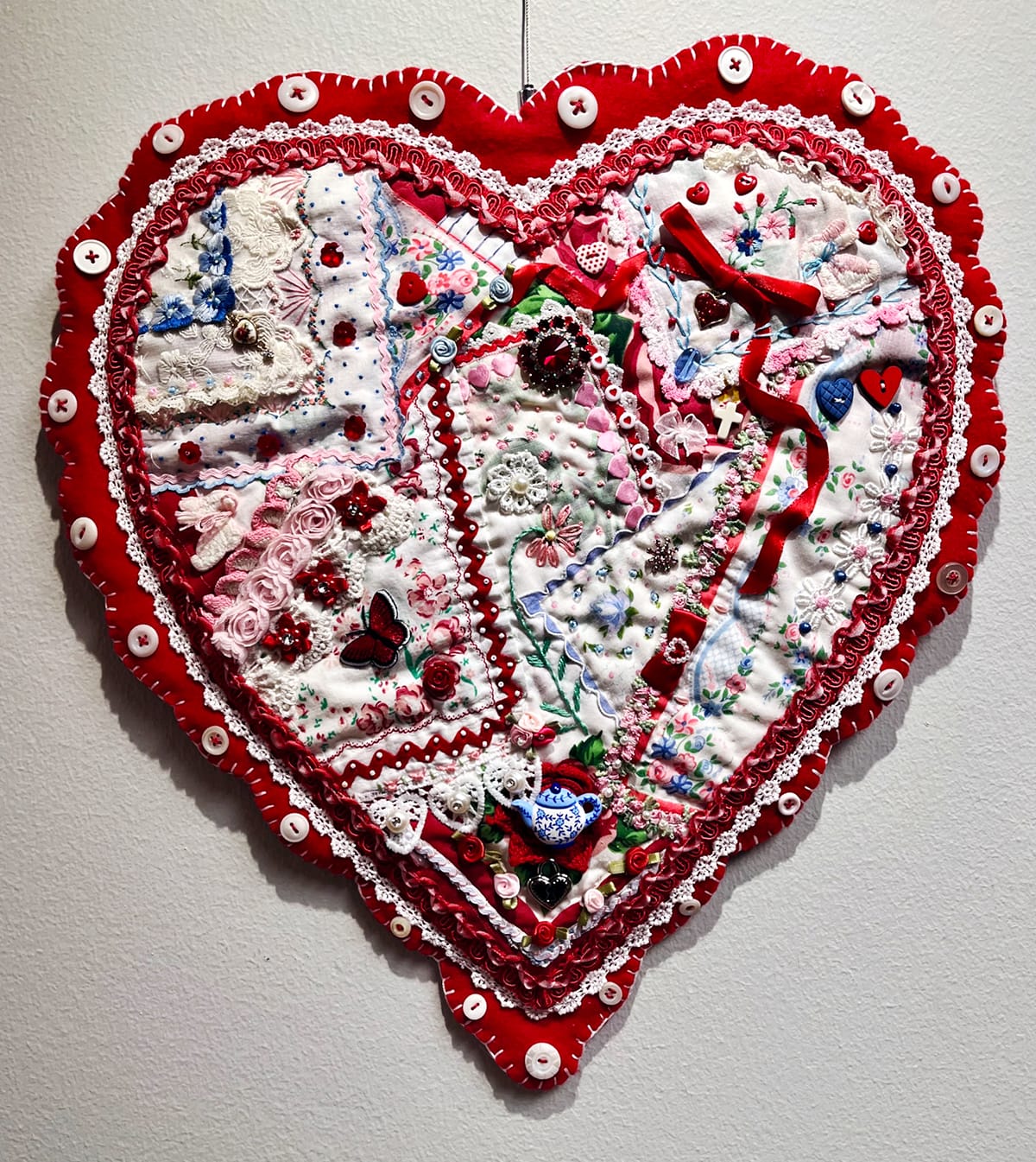 From left: Anita Martz, “My Sweet Heart Art,” collage; Judy Thompson, “Friendship Crazy Quilt,” mixed media. Photos by Emily Christensen for the SHOUT.