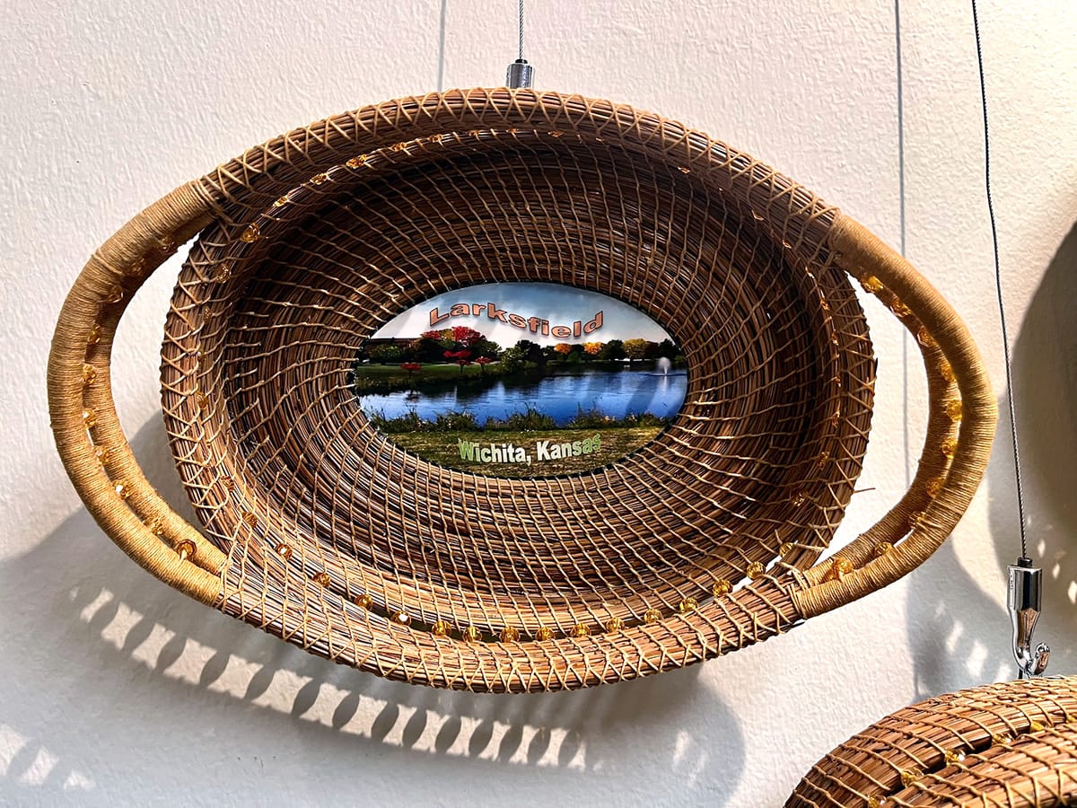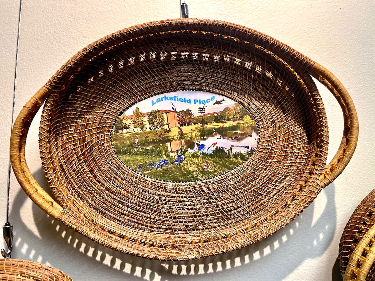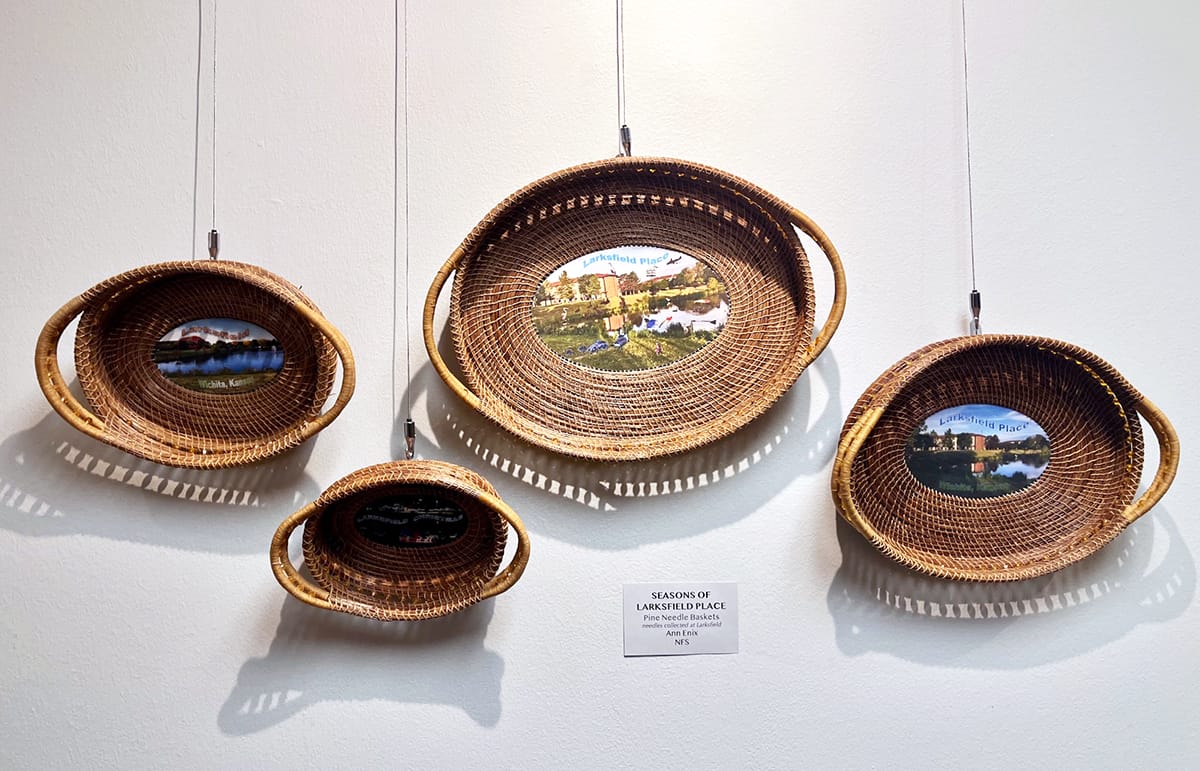 Ann Enix, “Seasons of Larksfield Place,” pine needle baskets made from needles collected on the Larksfield Place grounds. Photos by Emily Christensen for the SHOUT.