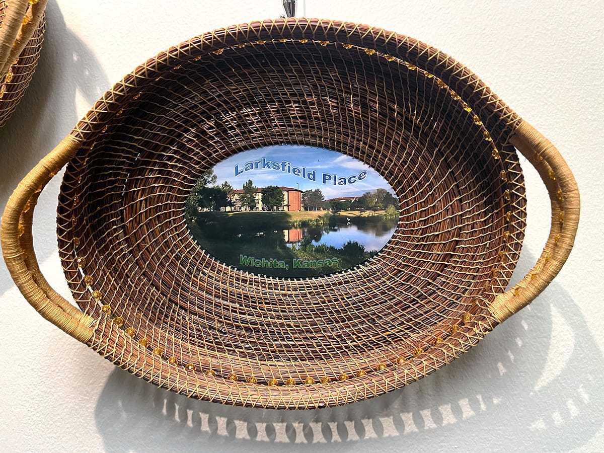 For the base of each finely woven basket Enix uses a photo of a different season at the community, embellishing the image with text and clip art using a desktop publishing program. (Often, the base of a pine needle basket is ceramic or stone.) I was delighted by this laborious process in combination with an old-school version of a newfangled publishing method. I heard more than one resident narrate the story of their creation to a family member who was, I imagine, enjoying the shadows they cast on the wall just as much as I.
