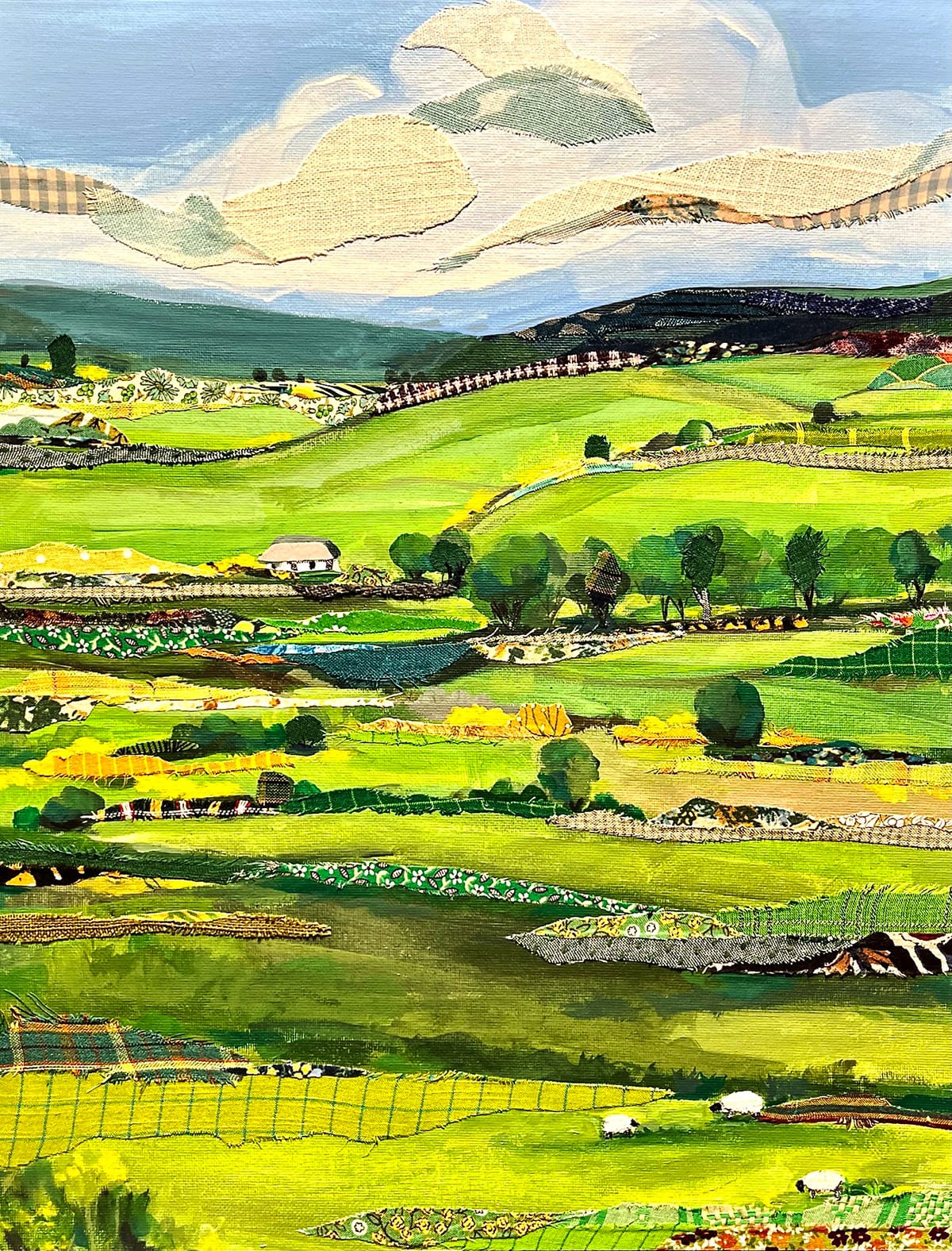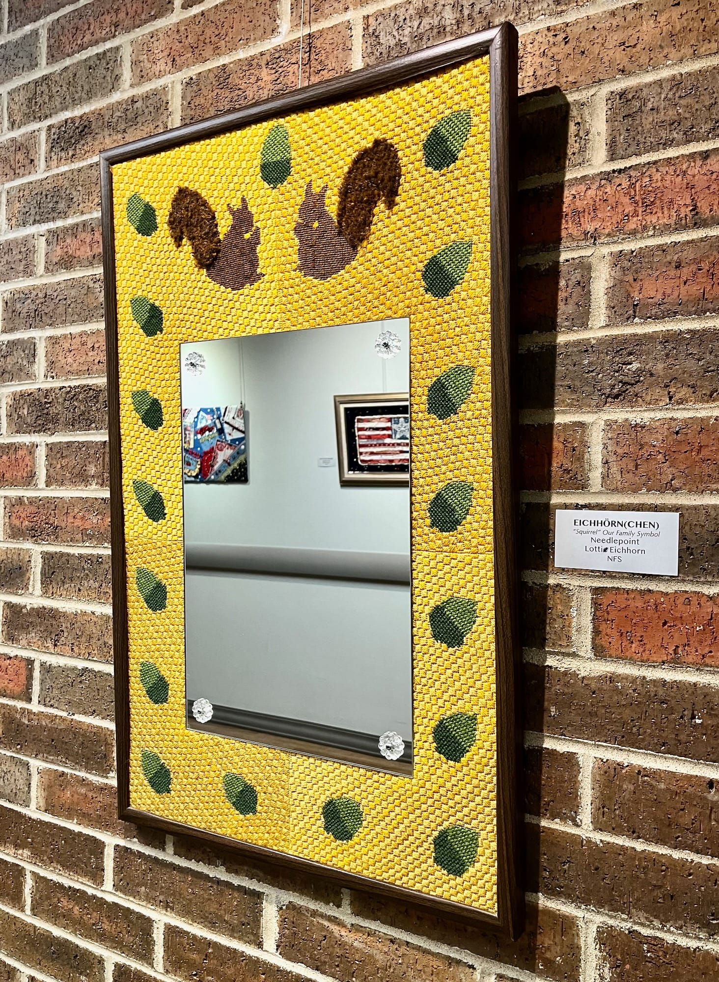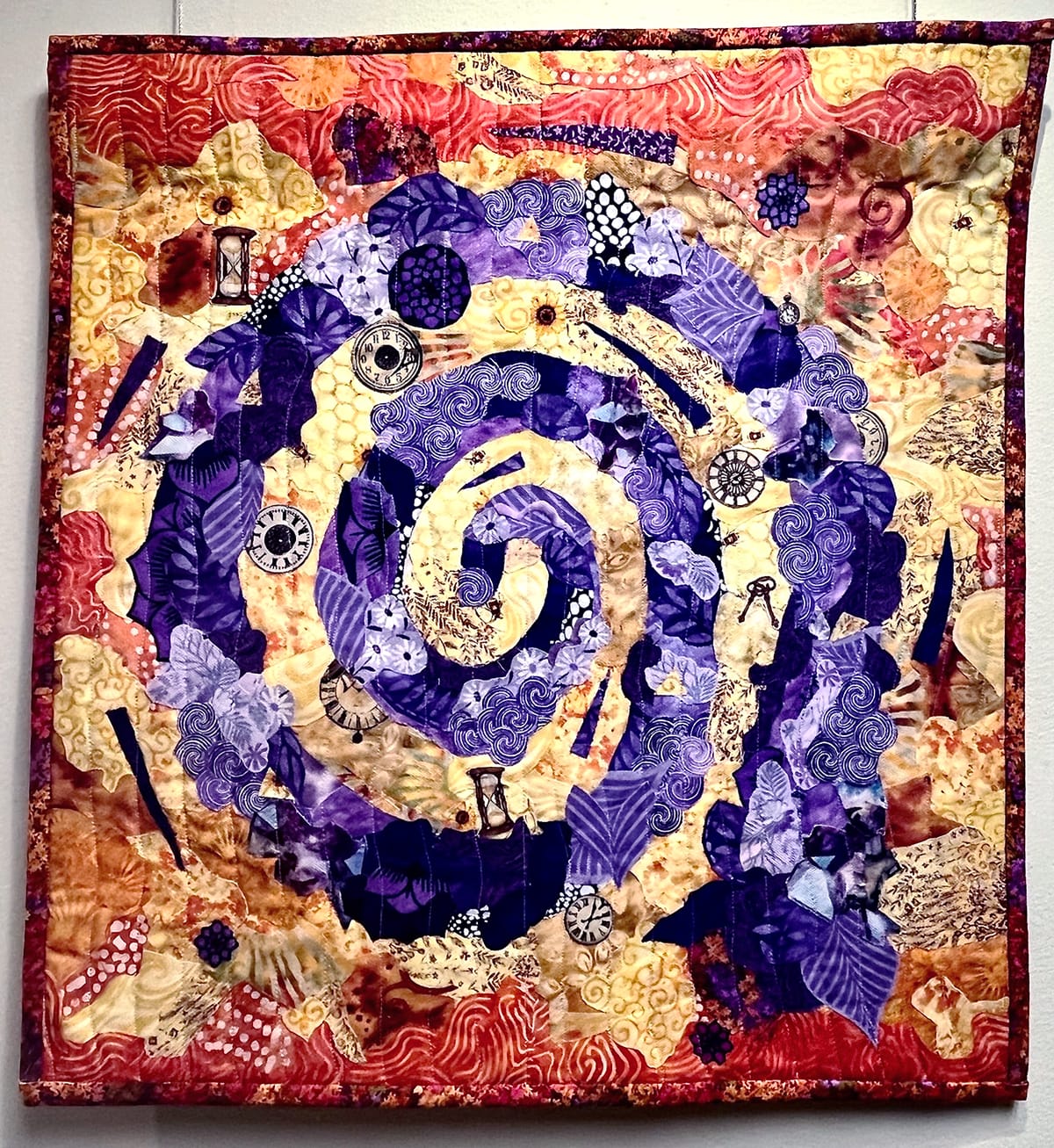 A handful of the many notable works on view in the fiber art show at Larksfield Place. From top left: Gallery Director Carlene Williams contributed three pieces to the show, including “Spring in the Wicklow Mountains, Ireland,” acrylic, fabric. The exhibition includes two stunning quilts by Charlene Van Walleghen: the modernist-inspired “Colors of Florida #1" and the dreamy, nostalgic "Hand Dyed #1." Judy Dove's fabric landscape “Twilight" is one of the pieces accompanied by a sold sticker. Necia Rillema's “The Journey,” fabric collage, is one of the many pieces preoccupied with time. The title card for Lotti Eichhorn's needlepoint-bordered mirror “Eichhörn(chen)" notes that the squirrel is the family symbol. Ernie Kind's mixed media wool piece "I Can't Believe I Just Said That" is both shocking and hilarious at once. Photos by Emily Christensen for the SHOUT.
