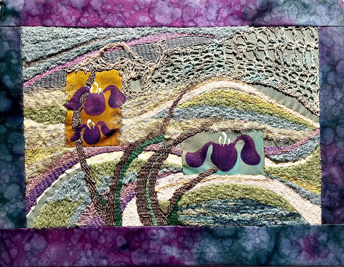 From left: Carol Hill, “Iris Garden,” needle weaving with acrylic; Diane Moreno, “Bee Happy,” fabric, thread, beads. Photos by Emily Christensen for the SHOUT.