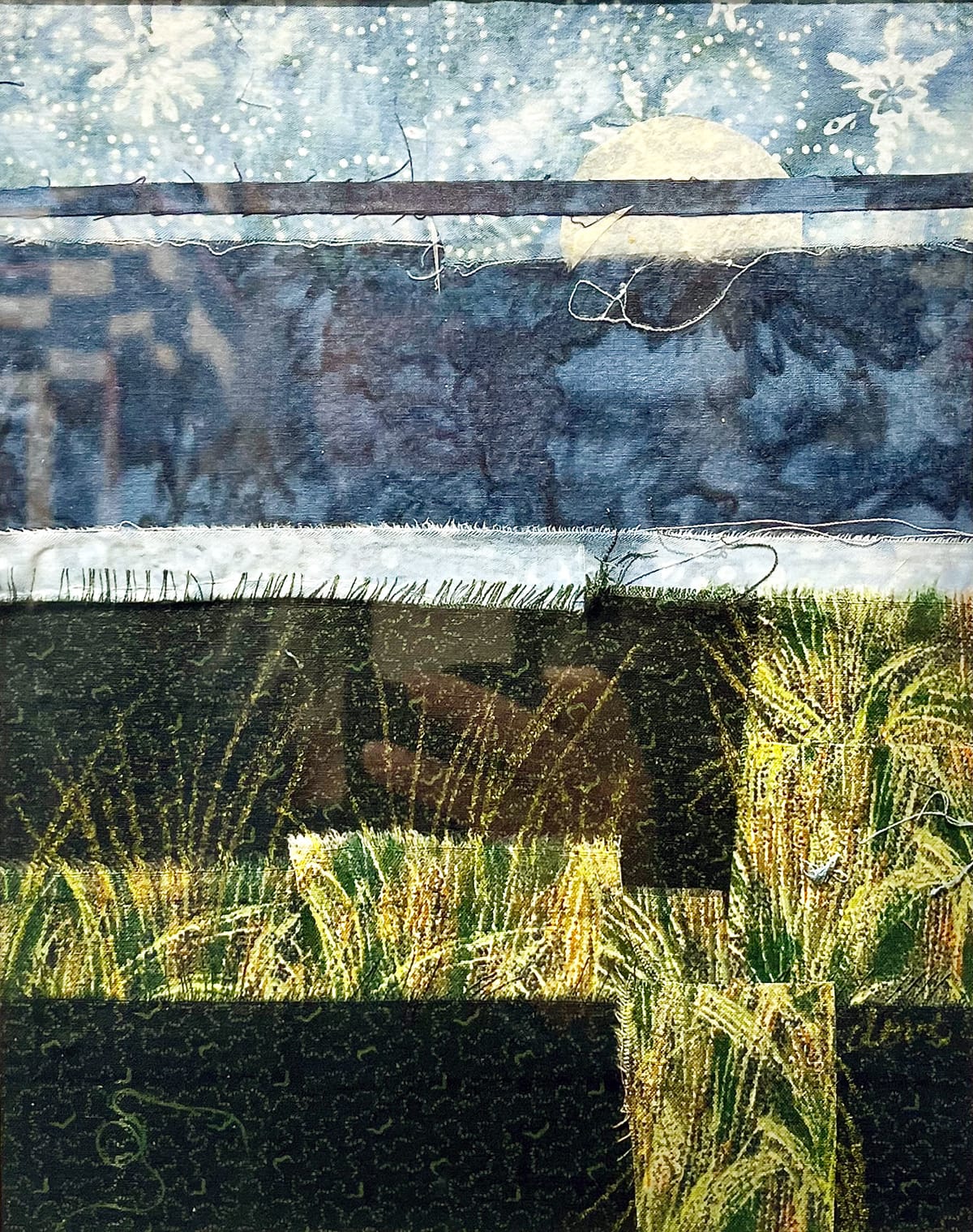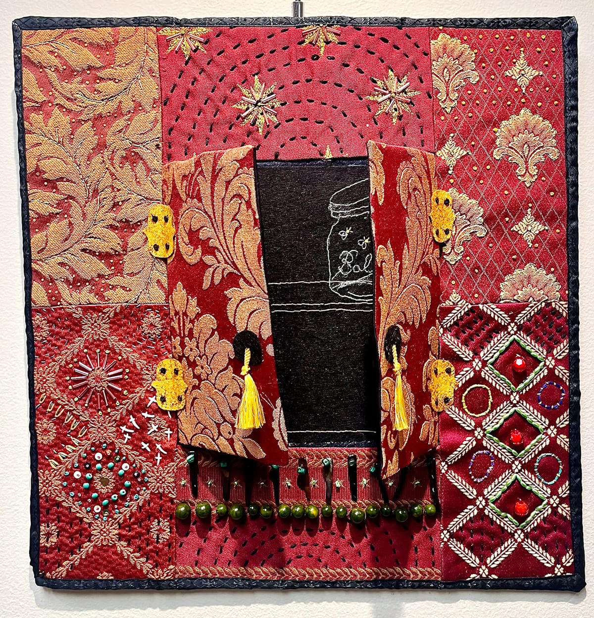 Still wilder are mixed media works by Carol Hill and another by Moreno. In “Iris Garden,” Hill throws everything she’s got at her small canvas: needle weaving, embroidery, and illustration with a batik border. In “Bee Happy,” Moreno assembles a puzzling fabric cabinet. On the outside, sumptuous fabrics in rich colors, beading, embroidery, and even gold tassel pulls and fabric hinges evoke a superb bazaar. But the inside is simply a black field populated by a couple of shelves and a mason jar, each formed with a simple white embroidered line. The contrast is both jarring and appealing.