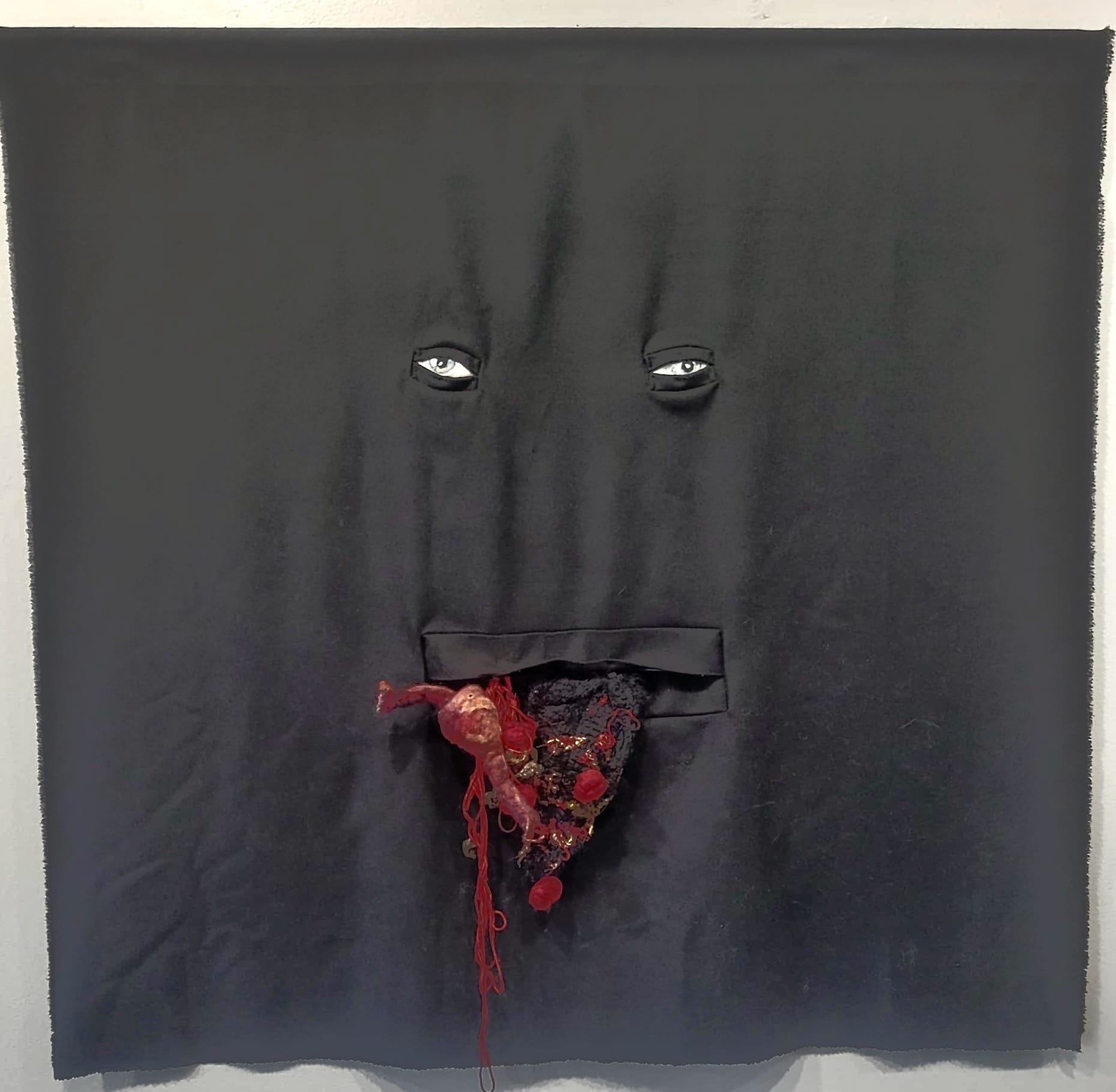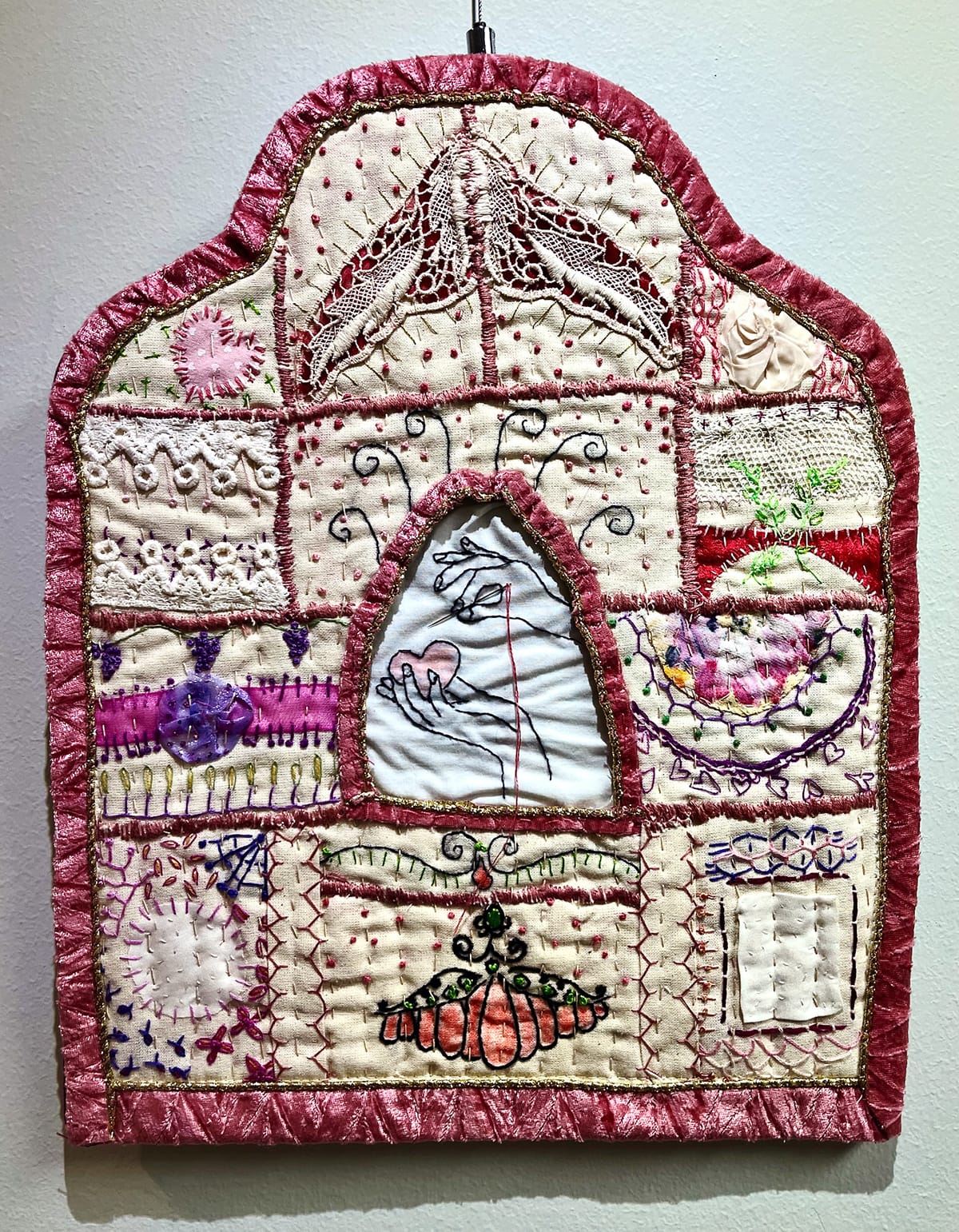 The piece combines multiple fiber techniques into a pink and white, feminine package. But if you look closer, it’s clear that Moreno is going her own way. While she employs different stitches — a nod to the tradition of embroidery samplers — this is not the sedate resume of Victorian girlhood, but a wild romp across a quilt-y canvas studded with scraps. In its form and design, “Stitch By Stitch” resembles a stained glass window honoring needlework. In the center, a pair of embroidered hands deftly completes an embroidered heart, punctuated by a real needle — a reminder of what a small, sharp thing can do.