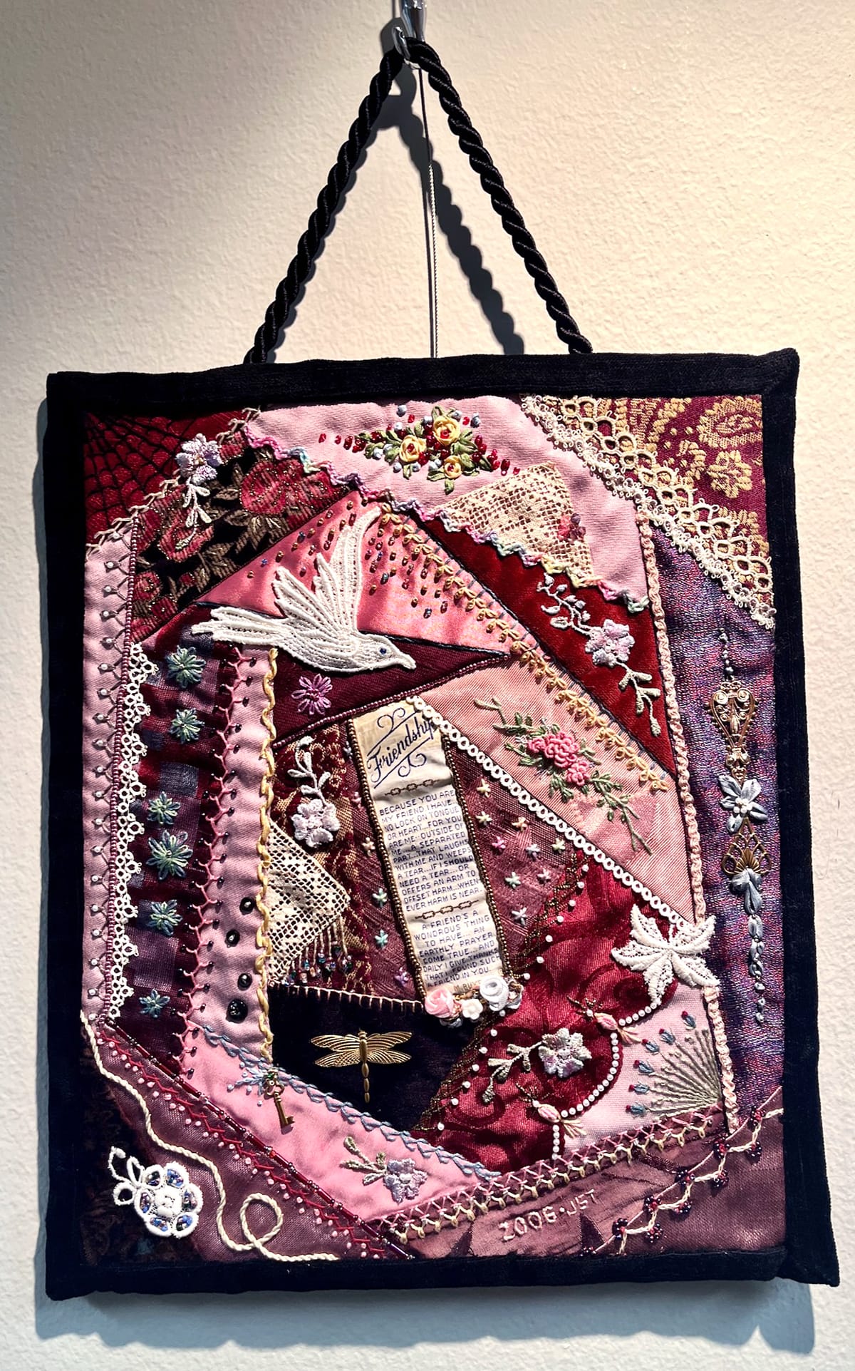 Many of the works I most enjoyed in this exhibition share a certain ethos with “Stitch By Stitch,” getting wilder and wilder as they spiral out from this centerpiece. Quite a few share its “I used all the scraps” aesthetic. They include Anita Martz’ “My Sweet Heart Art” and Judy Thompson’s “Friendship Crazy Quilt.”