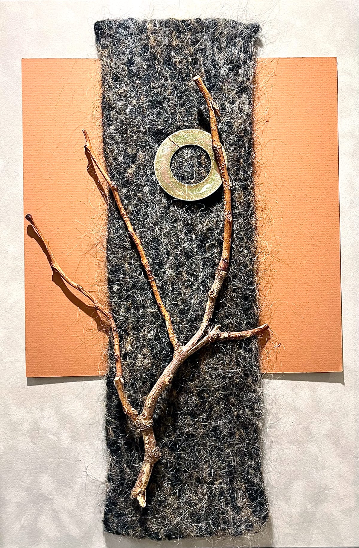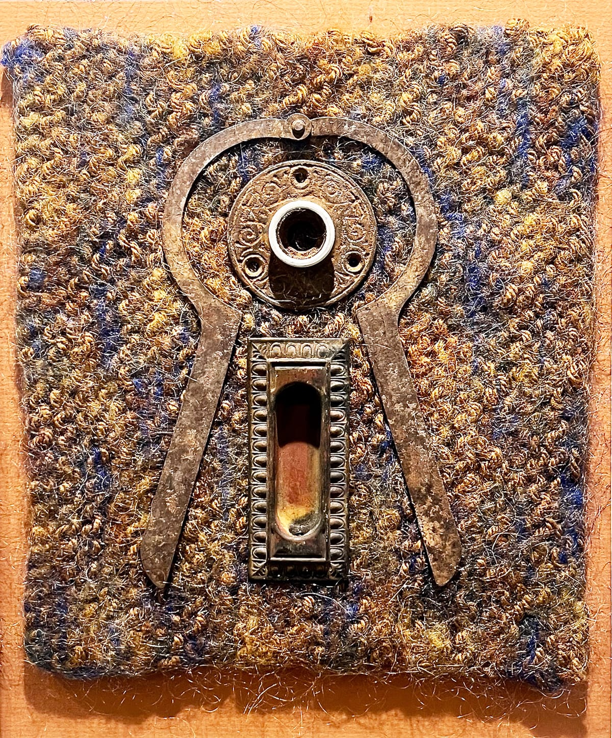 Kaye Abbott’s mixed media works center on surprising combinations. She pairs felted wool backdrops with found objects, creating juxtapositions that appear at once deliberate and improvisational. In “Imagination Station,” the wool background picks up some of the rust in the found metal objects Abbott chose as pairings. They’re unrecognizable as their past selves — something entirely new in the world Abbott creates.