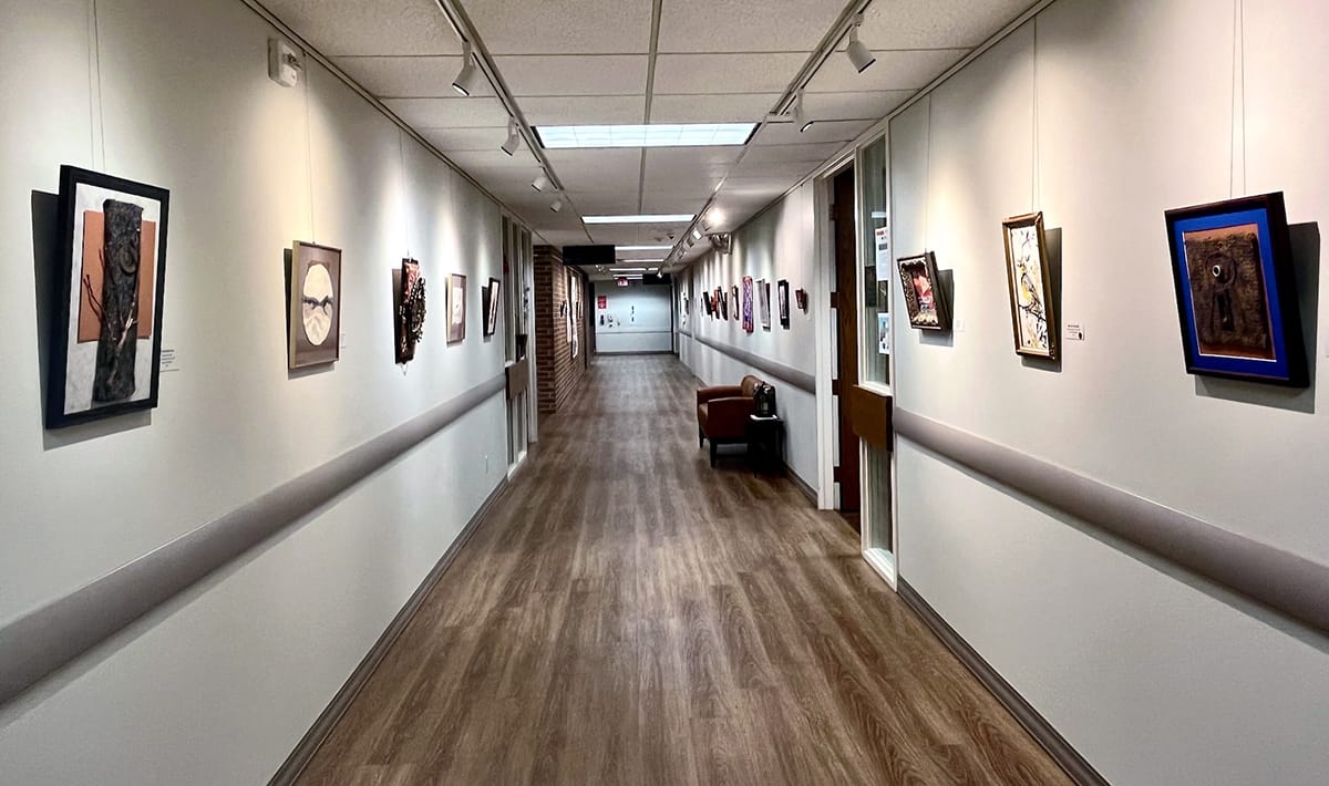 The Gallery at Larksfield Place, 7373 E. 29th St. N., isn’t a white-cube-style art space, but rather one very long hallway and a shorter, intersecting one on the first floor of the building. But during my hour-long weekend sojourn there, I had to wonder if it’s one of the busiest galleries in town. I took in the exhibition alongside residents, staff members, and guests, overhearing multiple comments — all positive — about the pieces on display. A couple of people spoke to me directly about what we were both looking at, which almost never happens in an art exhibition space.