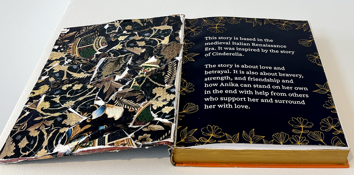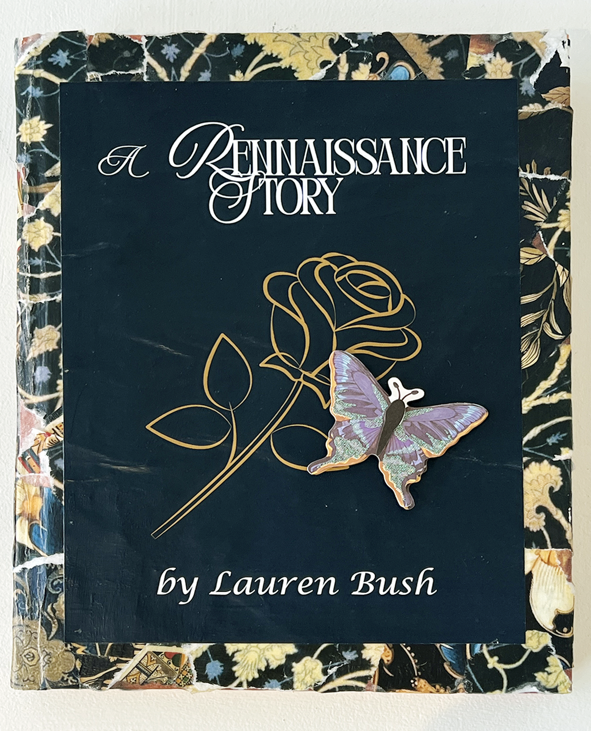 Wichita-based multimedia artist Lauren Bush’s installation, “A Renaissance Story,” is a quirky deep dive into the fantastical figures and themes of courtly romance. The show’s eponymous work, a mixed-media collage book with typed text and Braille, opens with the introduction: “This story is based in the medieval Italian Renaissance Era. It was inspired by the story of Cinderella. The story is about love and betrayal. It is also about bravery, strength, and friendship.”