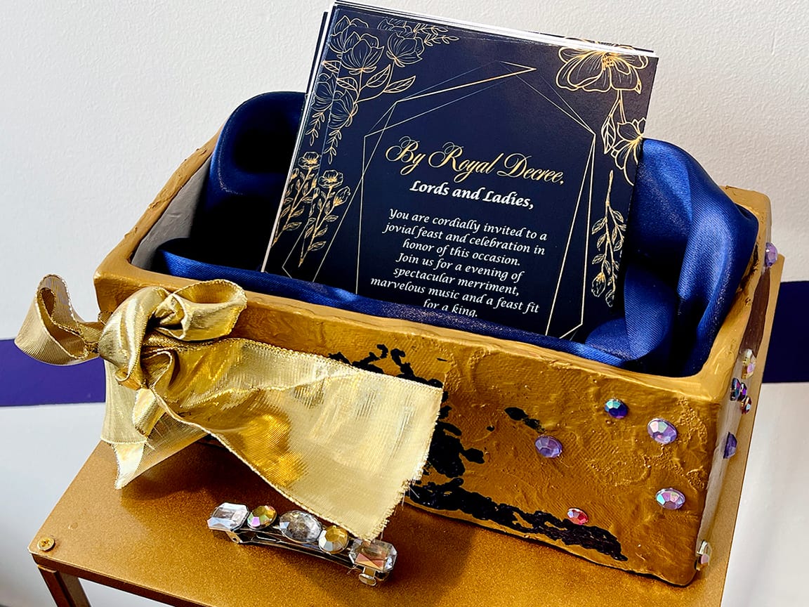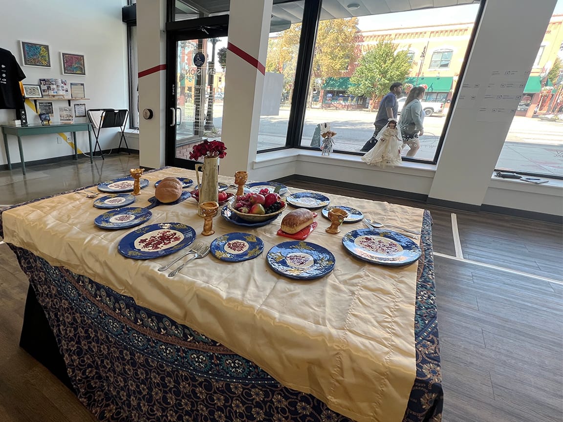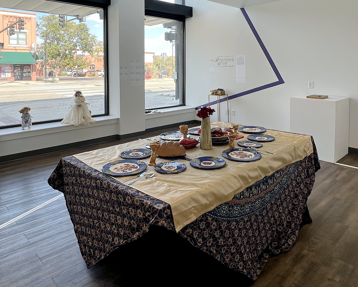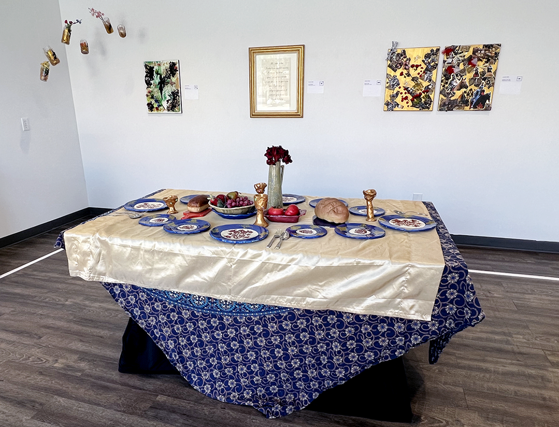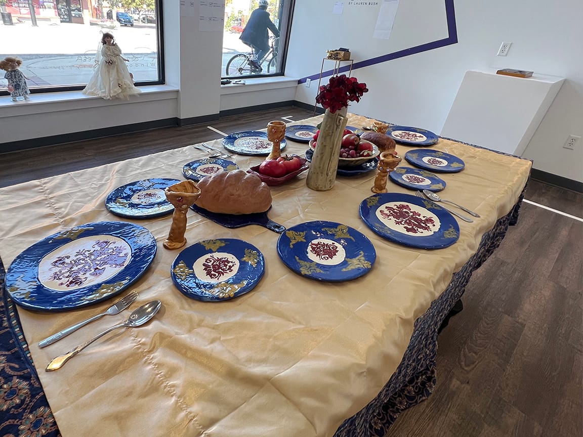 The show’s introductory artwork is “Trinket Box,” a painted ceramic piece with ribbons and glass beads. The keepsake box holds invitations to the wedding feast for Anika and Luca. More ceramic works serve as the exhibition’s central focus. Set out on a table opulently covered in multiple layers of deep blue- and gold-colored fabrics, Bush’s ceramics feature a plate setting with patterns reminiscent of coats of arms and other heraldic designs, as well as goblets, charcuterie boards, a pie plate and casserole dish, bowl, and “Flower Vase Pitcher.”