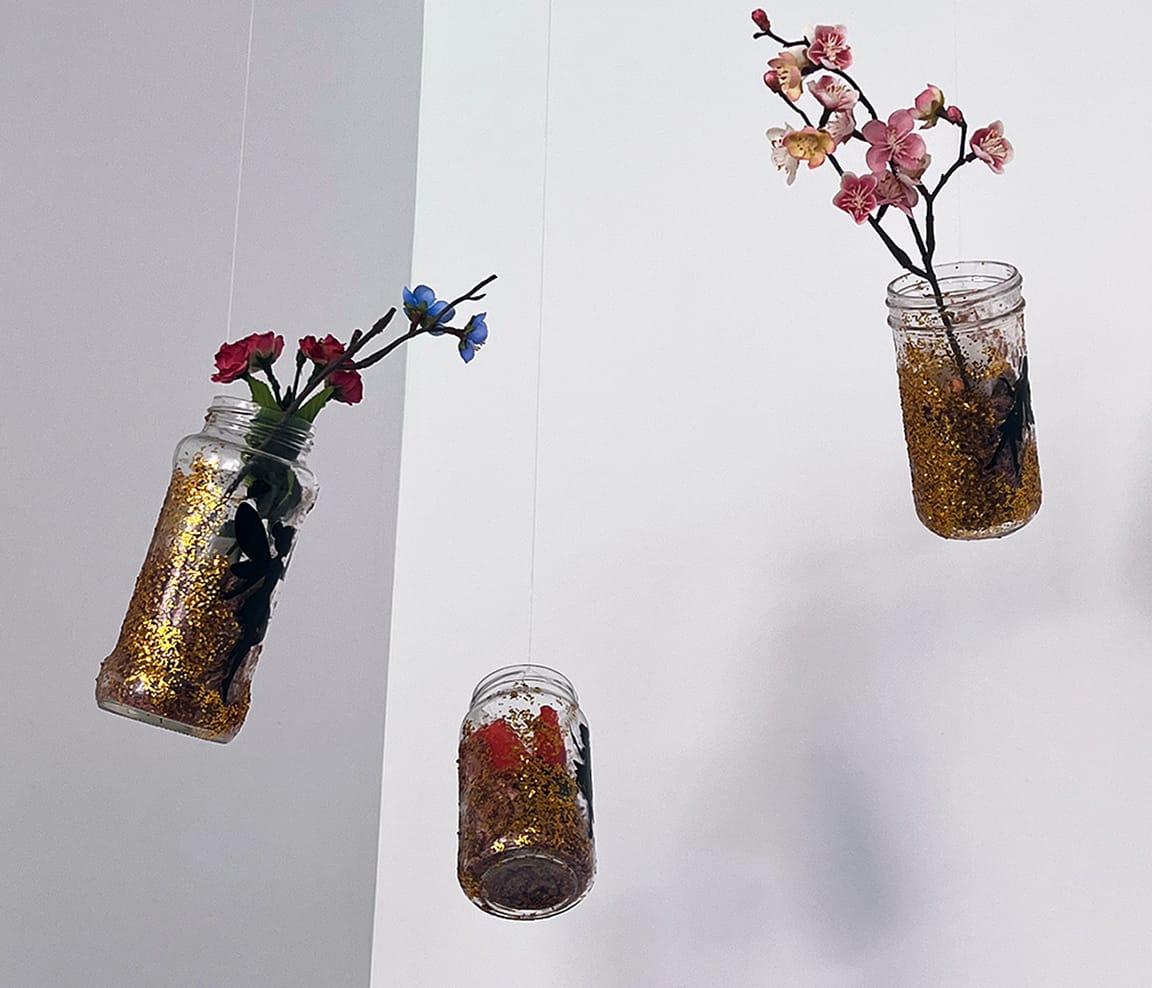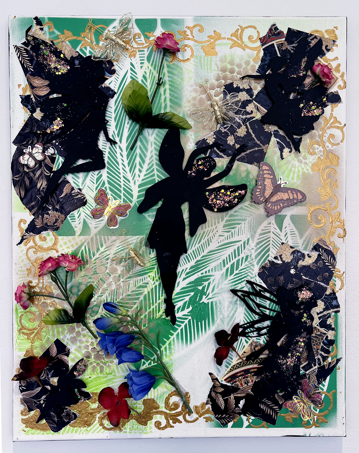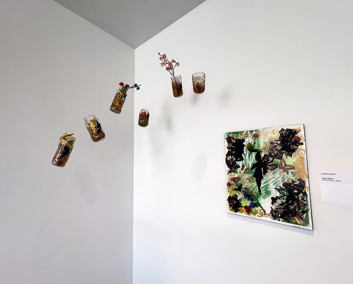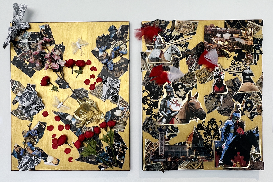 Her enjoyment is evident in her latest “A Renaissance Story” creations, including the six small glass jar mobiles each titled “Fairy Jar” and variously decorated with vinyl and filled with glitter and mixed plastic floral and moss. “Fairy Galore,” a mixed media collage with a dominant green background and cut-paper images, carries on the flowers and storybook fairy motifs. Two other collages, “Roses to Be” and “Knights in the City,” expand Bush’s mixed media narrative with images of red roses and jousting knights. She crafts these from cut paper and an array of found objects — plastic red rose petals, ribbons, feathers, bows, and sparkly, white fabric-and-net butterflies, among other things — all anchored and set off by royal gold backgrounds.