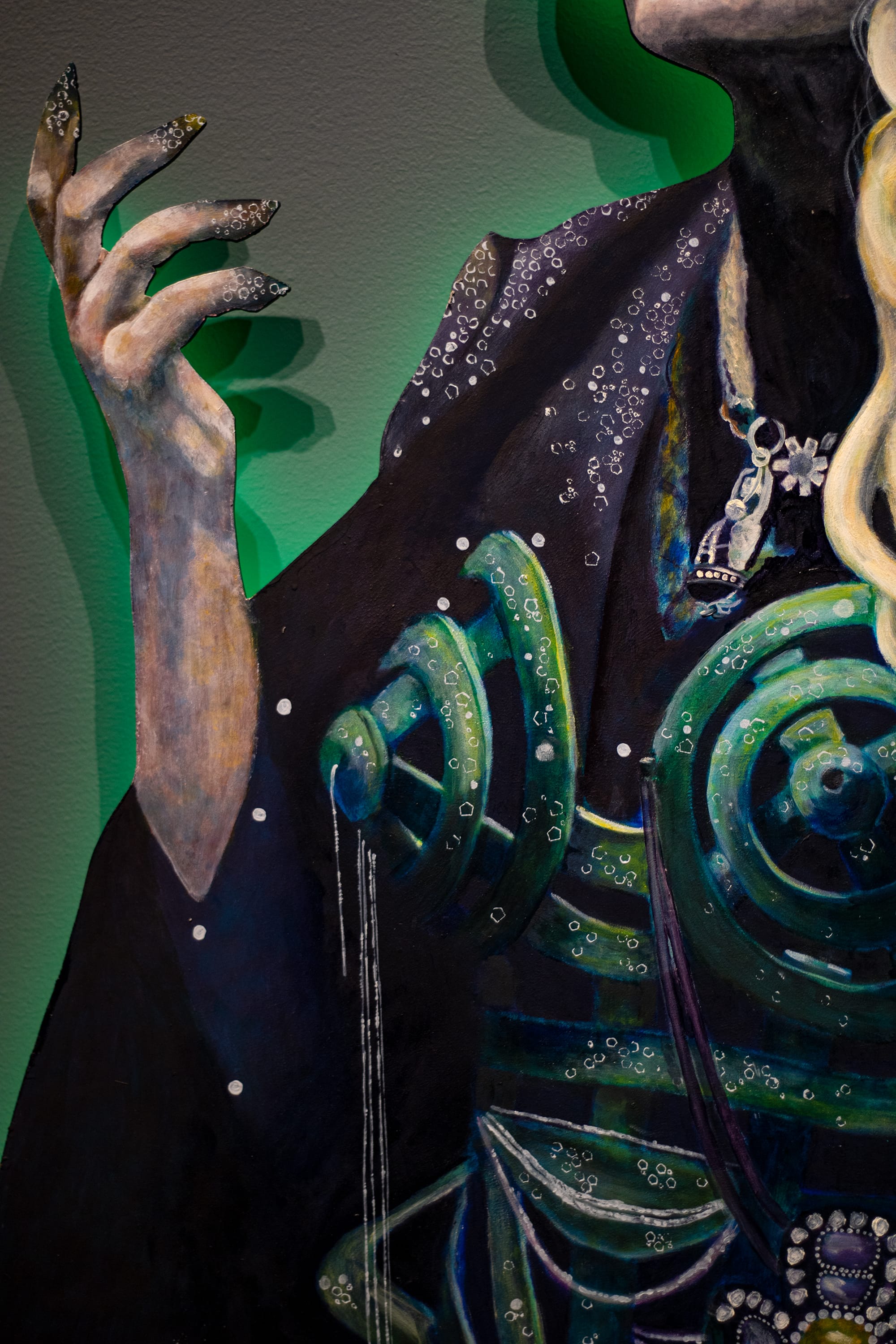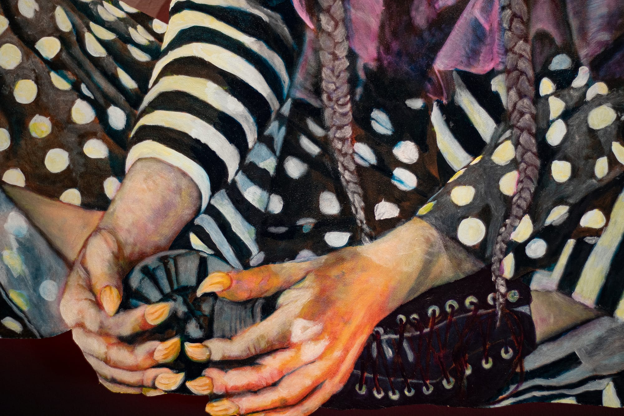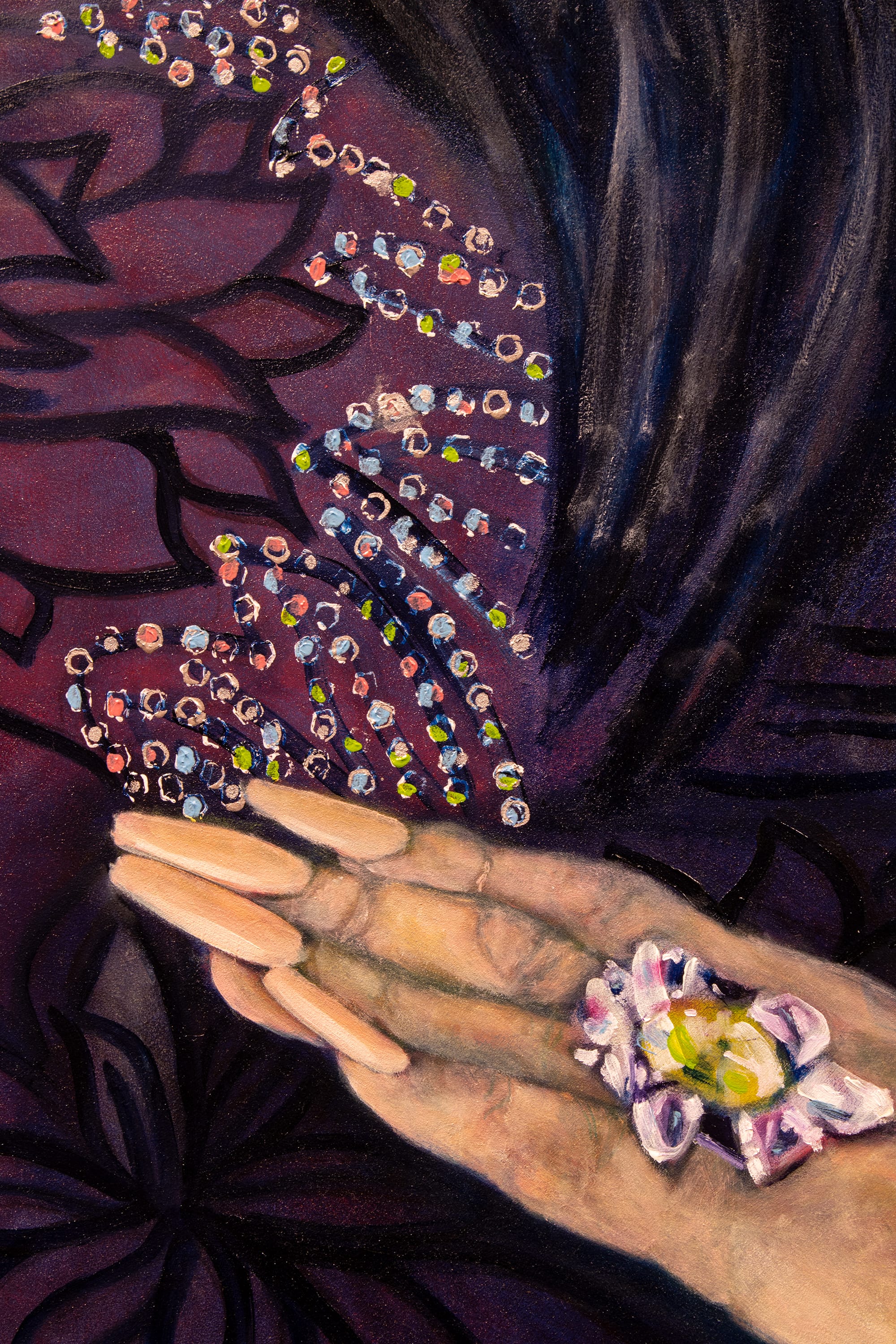 From left: Lydia Humphreys, “Reign Regalia,” 2024, oil on panel, 57 by 36 inches; detail of “Reign Regalia." Photos by Olivia D'Laine Schawe for The SHOUT.