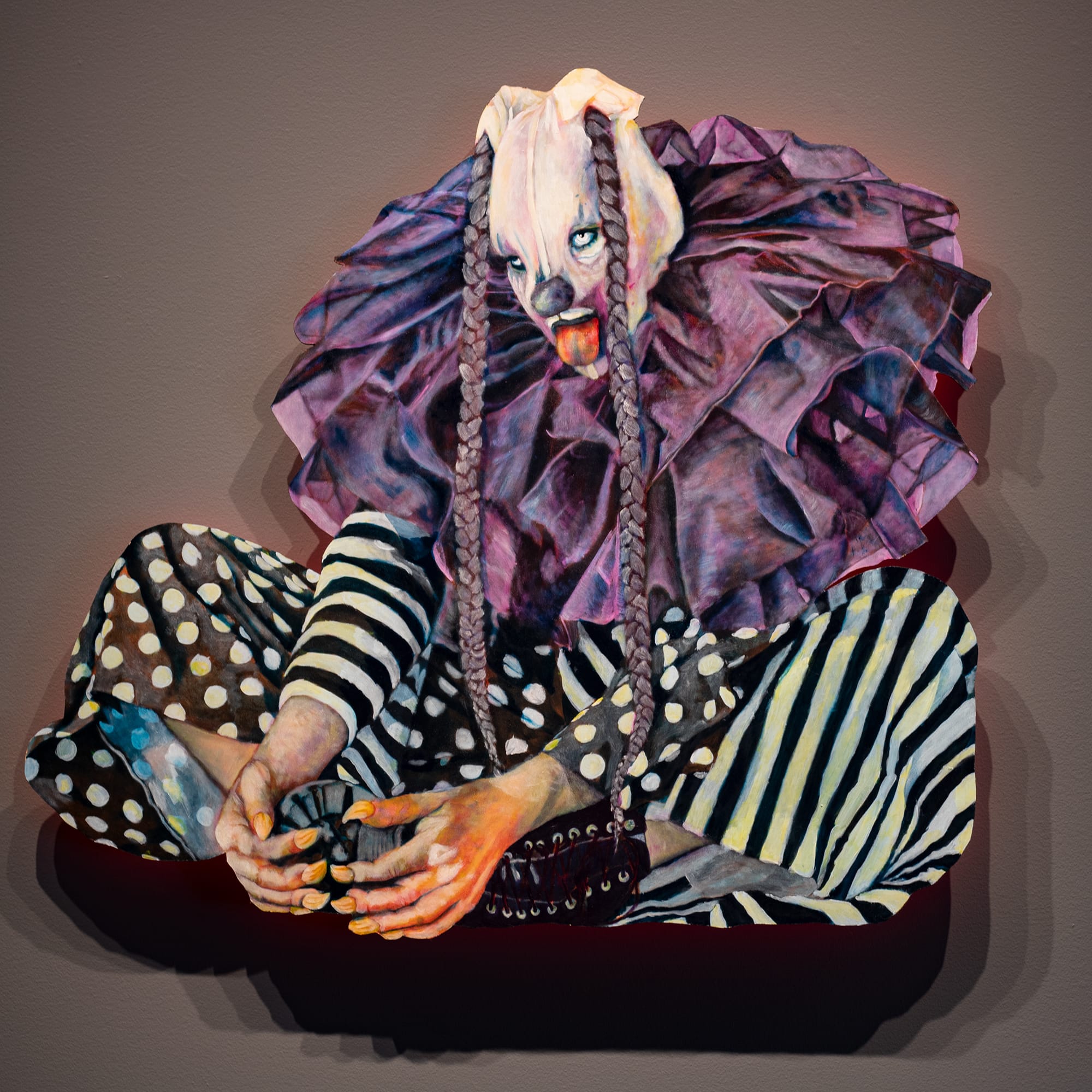 In these works, Humphreys applies oil paint on the panel in translucent layers, rendering each portrait using a glowing interplay of colors. The piece “Aero Decay” depicts the performer in stripes and polka dots, seated with their legs bent in a butterfly stretch. One of the figure’s hands holding their combat boot seems to glow with vivacity, while their collar’s many layers in shades of purple shimmer between the colors. Spotlights shine on “Lounixa Cadaver." Here the subject poses on a pedestal in platform high heels, a black corset at the waist, nipple tassels, and little else. The painting shows off the shine of her heels and the luminescence of her flesh and the pearls she wears.