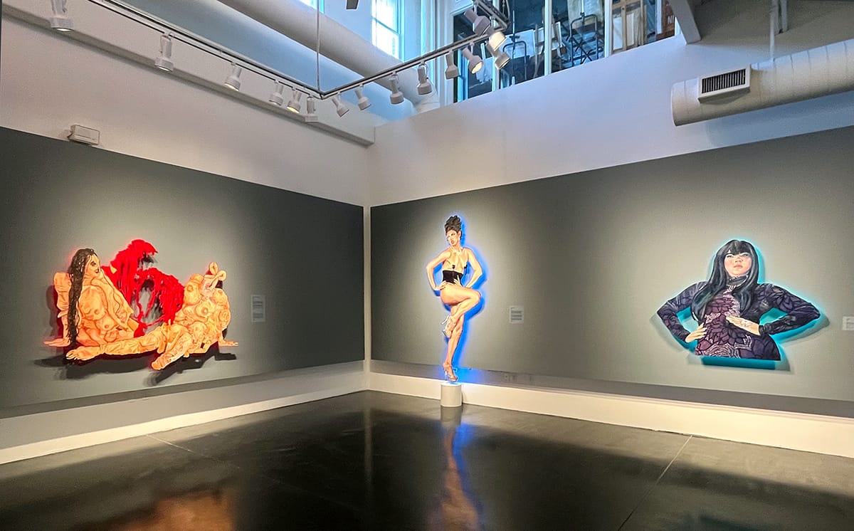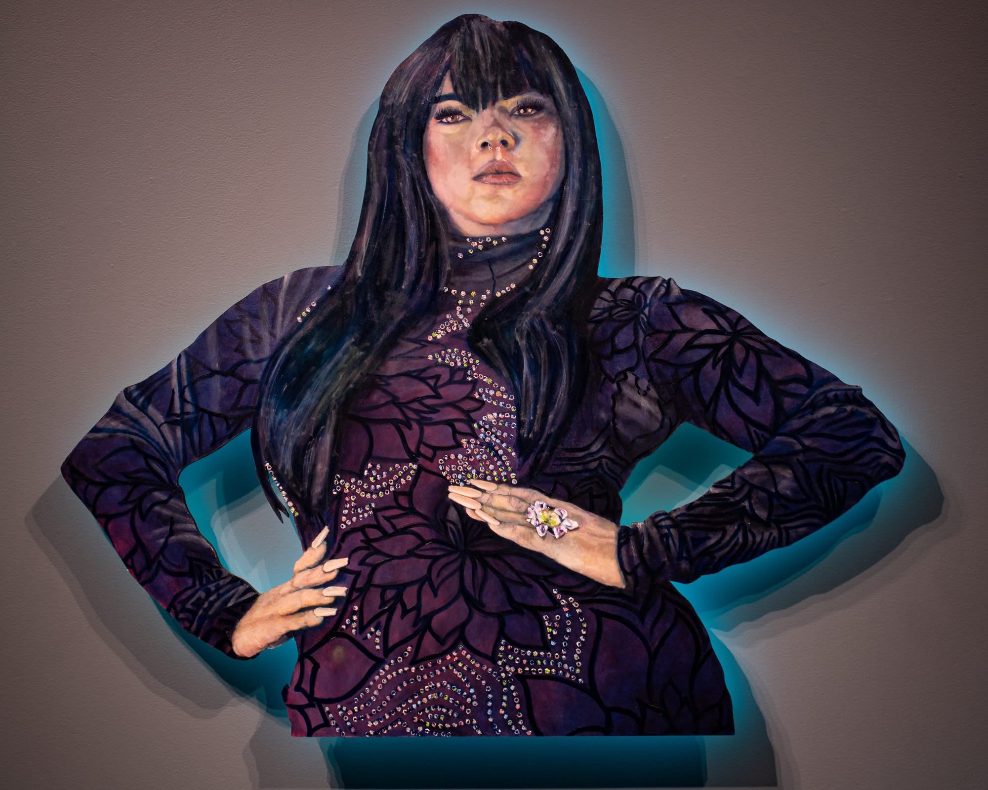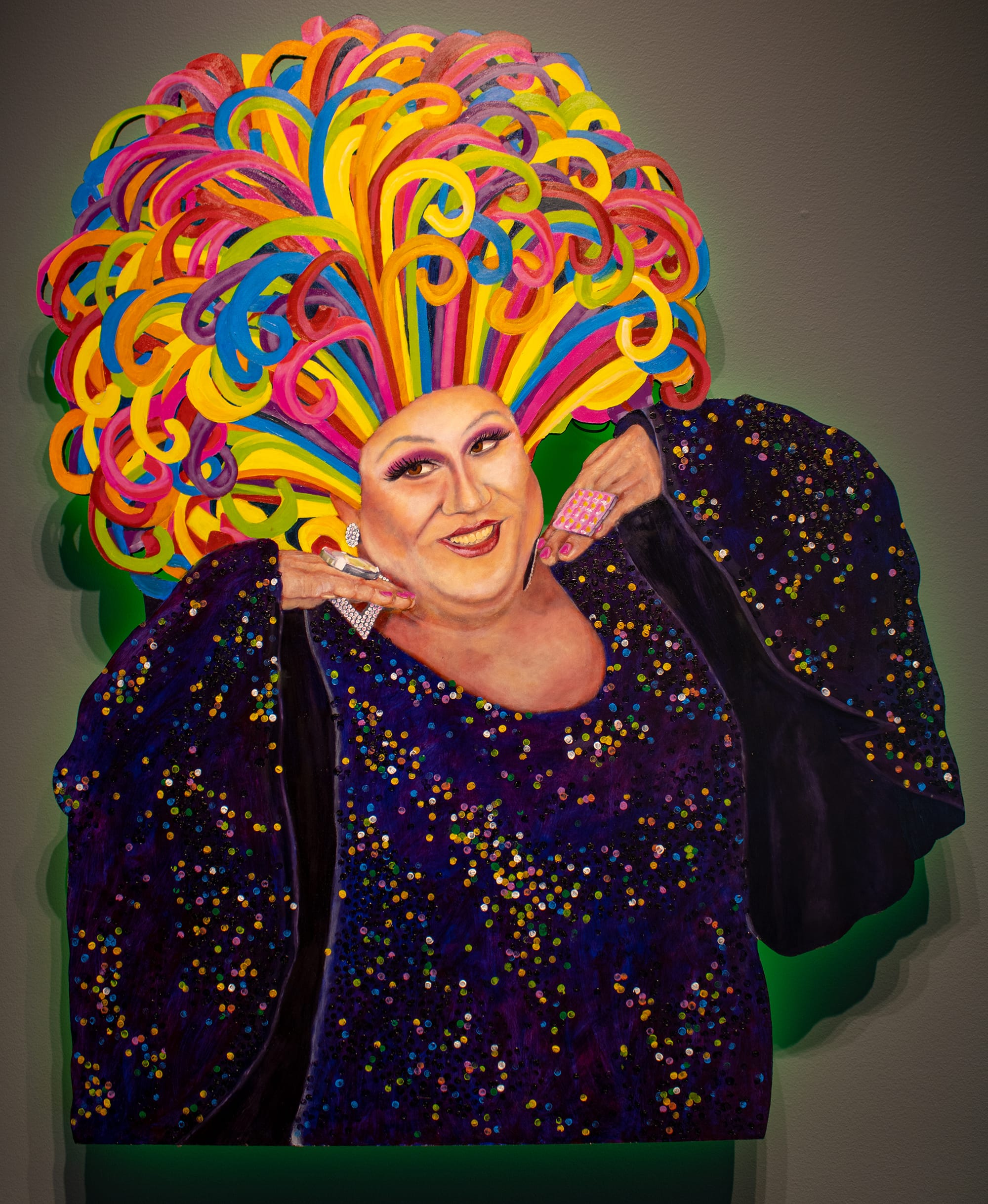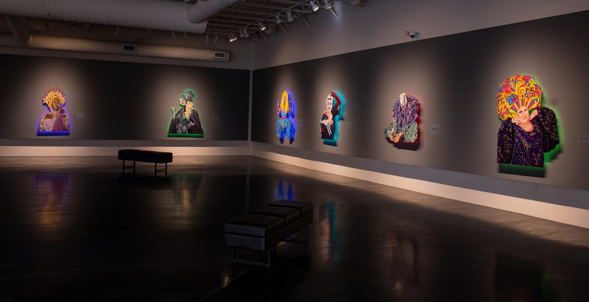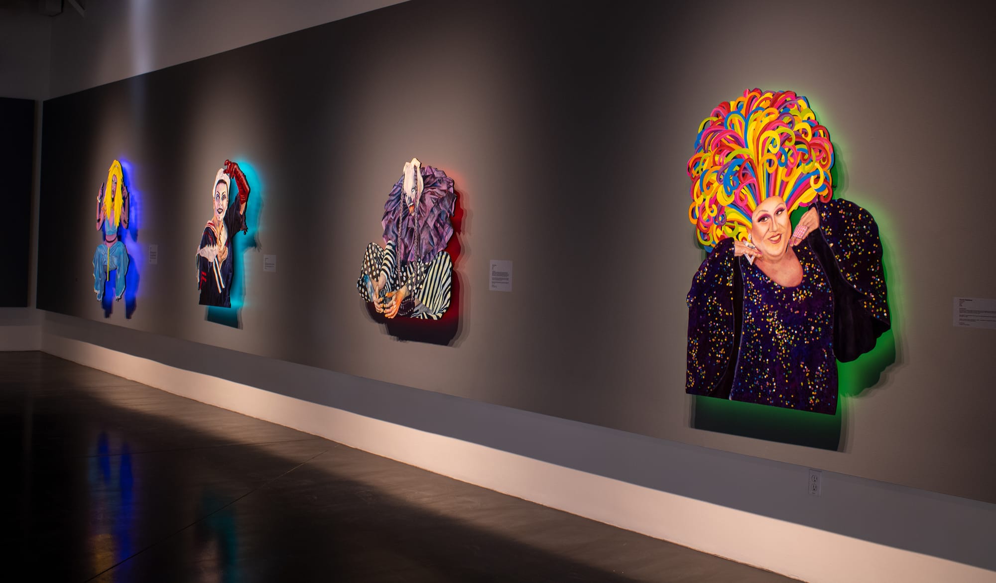 The artist also gives each portrait in the show its own halo of light. Humphreys suspends the shaped paintings on wood slightly away from the wall and attaches LED lights behind them. The light provides an ambience for the individual drag artists, adding to the otherworldly feeling of each persona and setting them apart from one another while unifying the show.
