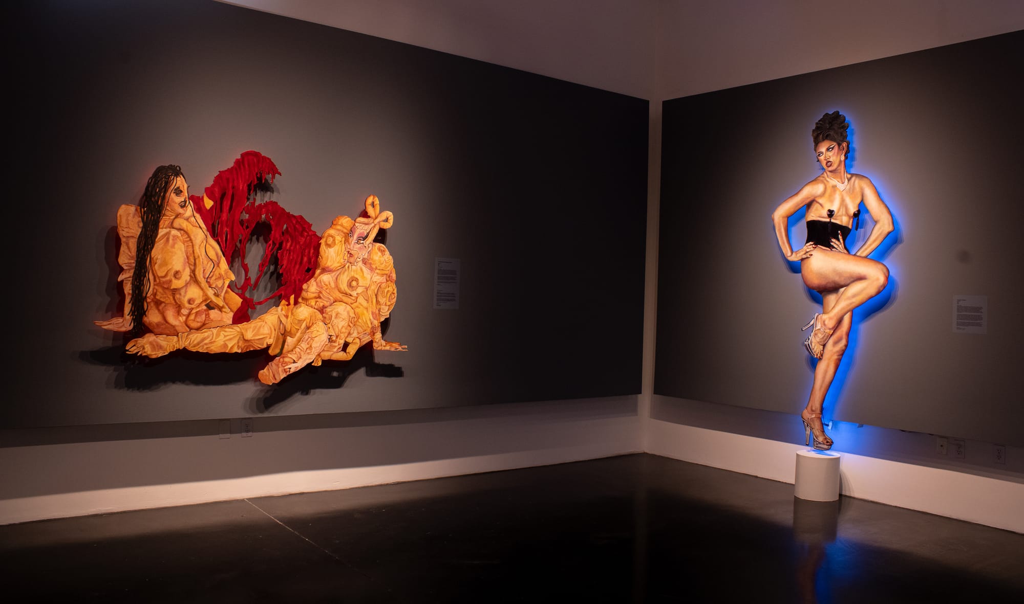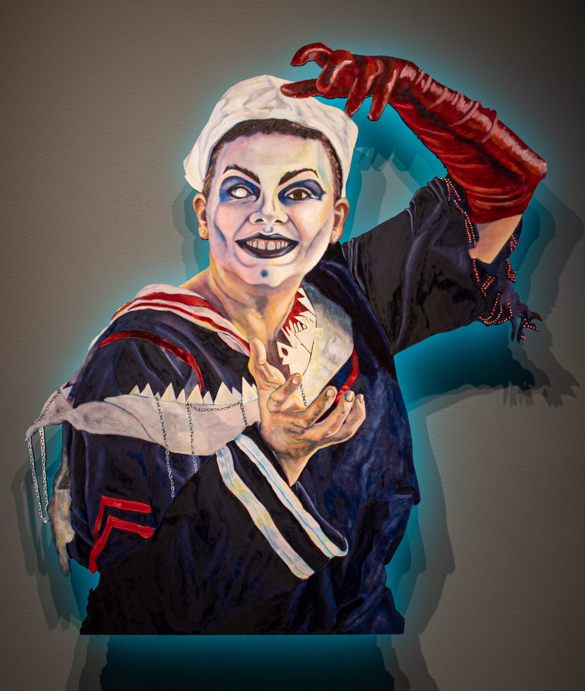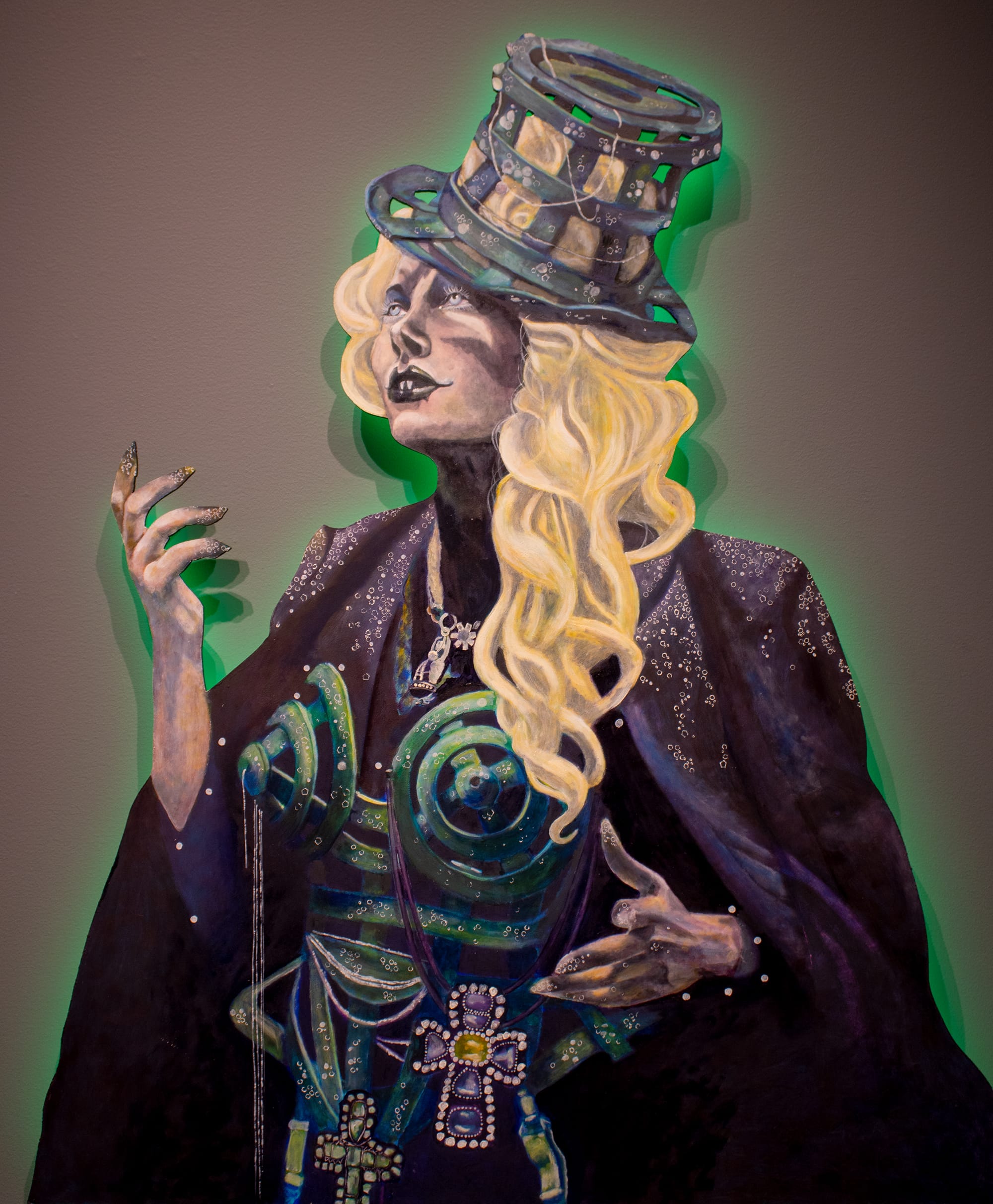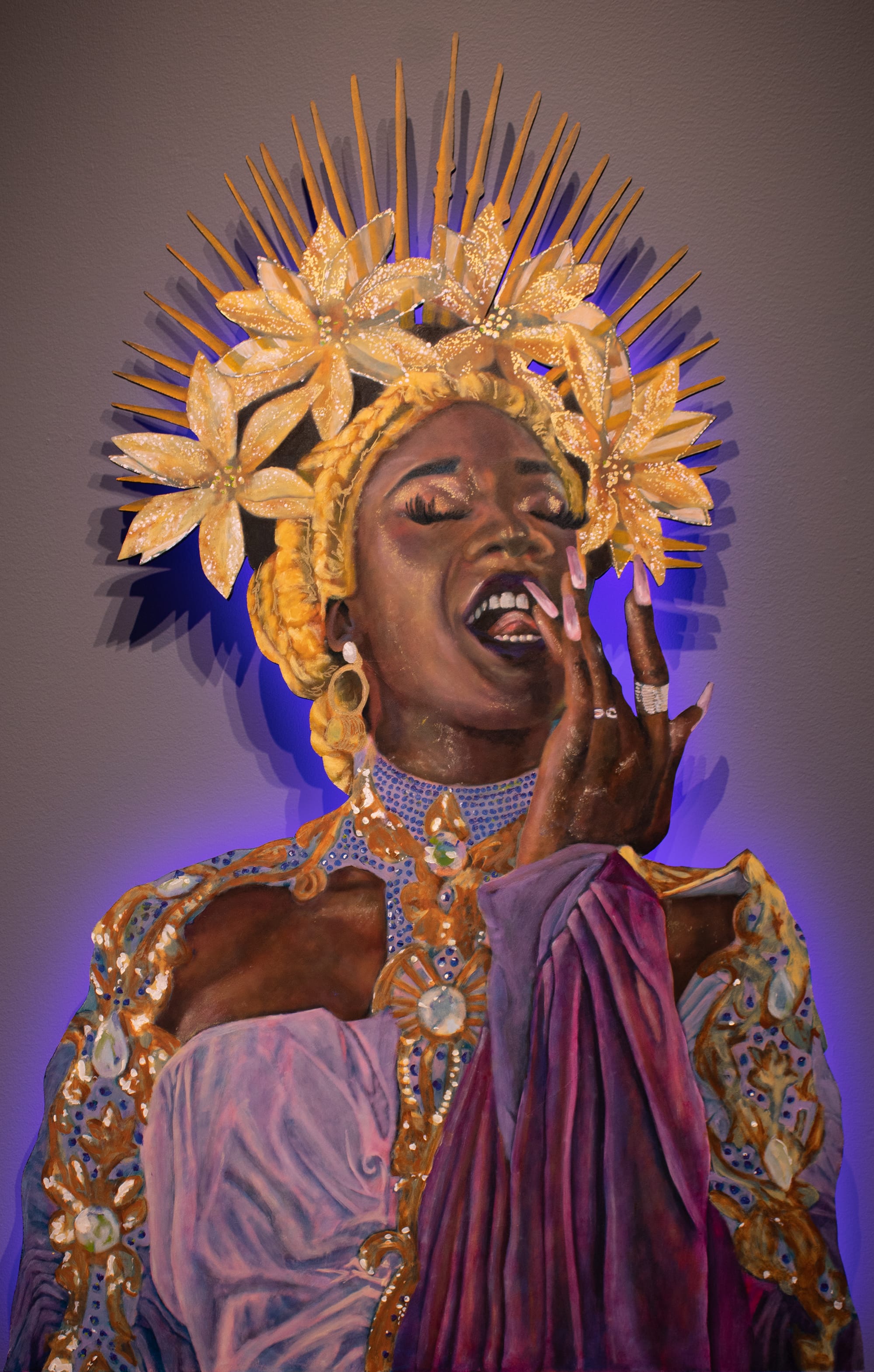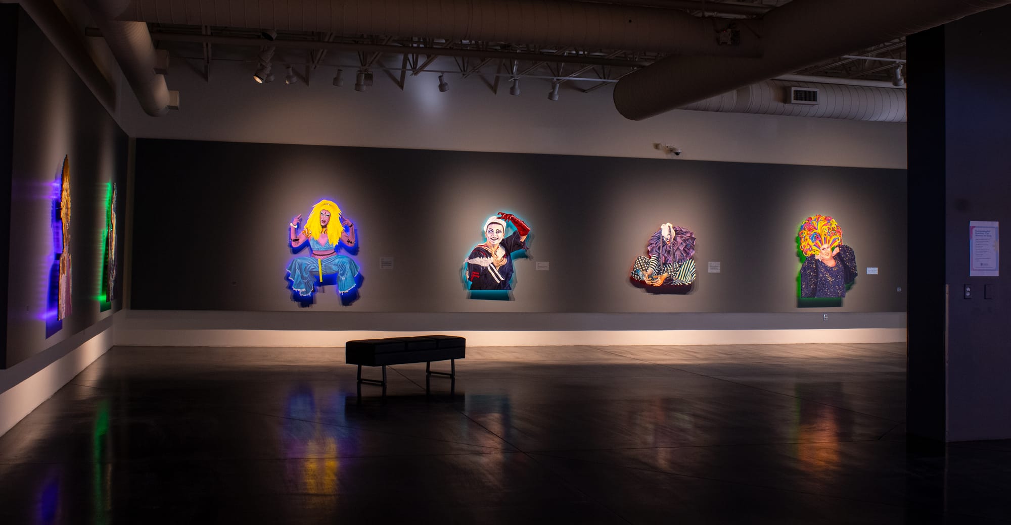 The artist also gives each portrait in the show its own halo of light. Humphreys suspends the shaped paintings on wood slightly away from the wall and attaches LED lights behind them. The light provides an ambience for the individual drag artists, adding to the otherworldly feeling of each persona and setting them apart from one another while unifying the show.