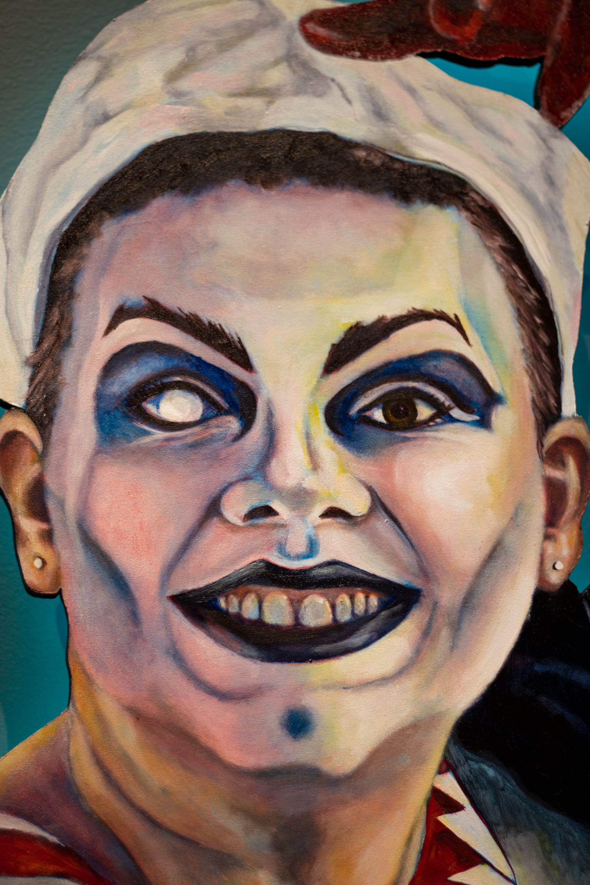 To many, drag is defined by a person parodying or “impersonating” a gender along opposite or opposing gender lines — but that’s not always so! Several of the subjects demonstrate the diversity of the performance genre through their use of "monster drag," a term I learned from none other than the performer named Deadnettle. In the exhibition, Deadnettle appears alongside Aero Decay, Pseudocidal, Suspicious Glaze, Effi Darling, and Dougie No-Nuts, demonstrating the spectrum of monstrous-meets-glamorous. Through these paintings, Humphreys legitimizes and shows off the range of possibility within drag, all of which is present in Wichita.