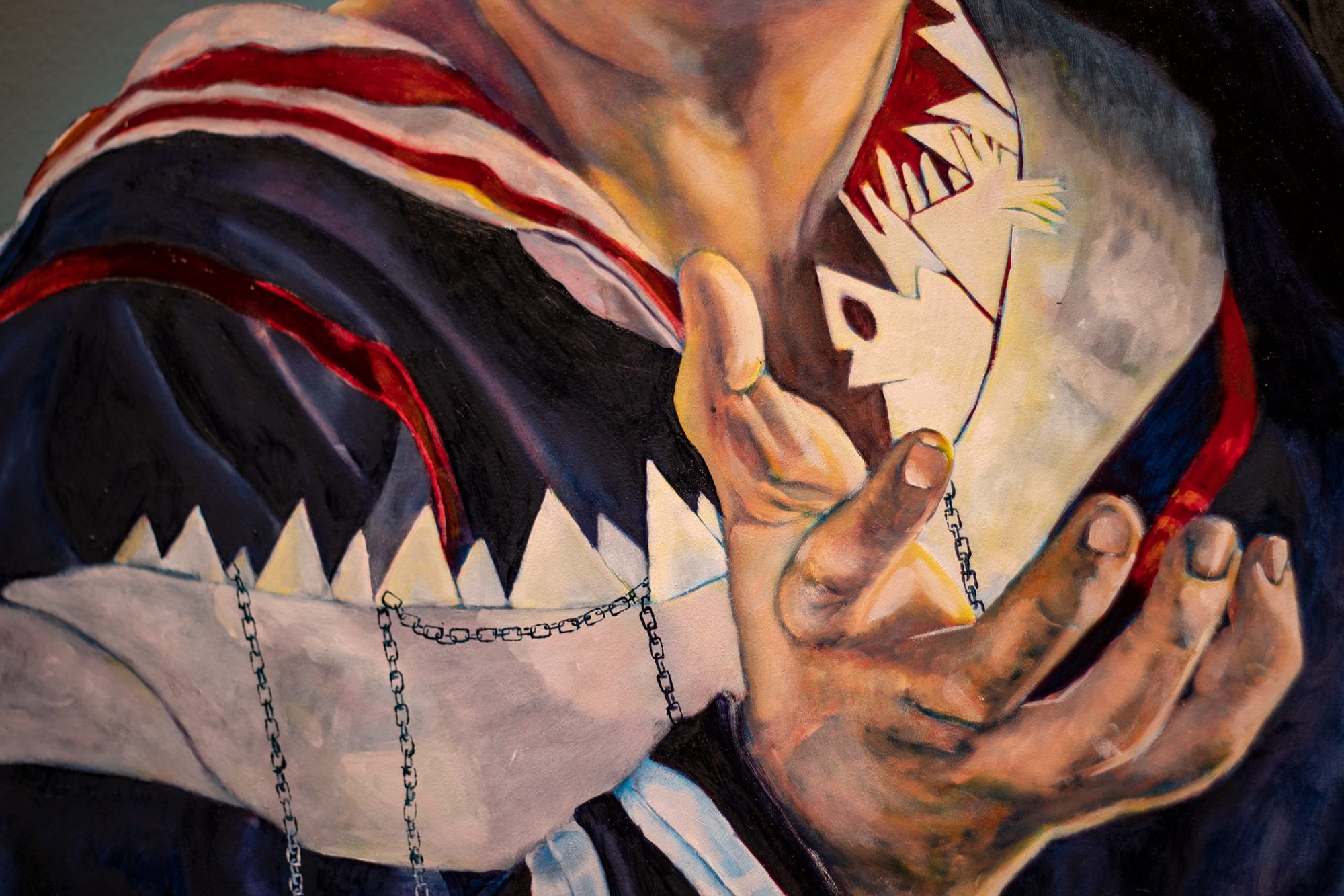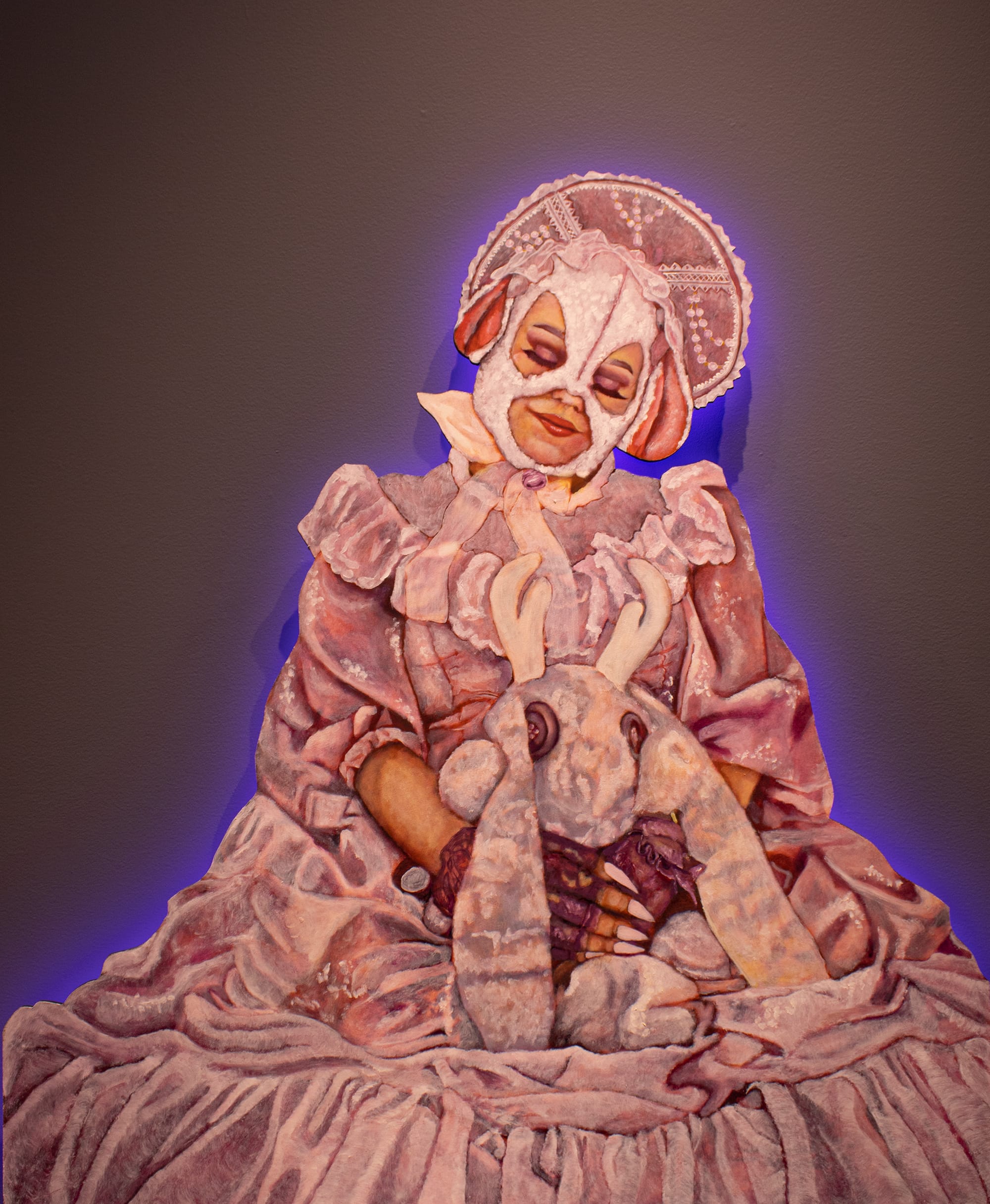 On another wall the masked "FaeTality KO Kotoure" sits in demure reflection wreathed in voluminous, Lolita-inspired frills. Elsewhere, "Dougie No-Nuts" embodies the spirit of a sailor, a monstrous jaw with delicate chains draped around their shoulders, their face painted a ghostly white, and one eye covered with a pale fog.