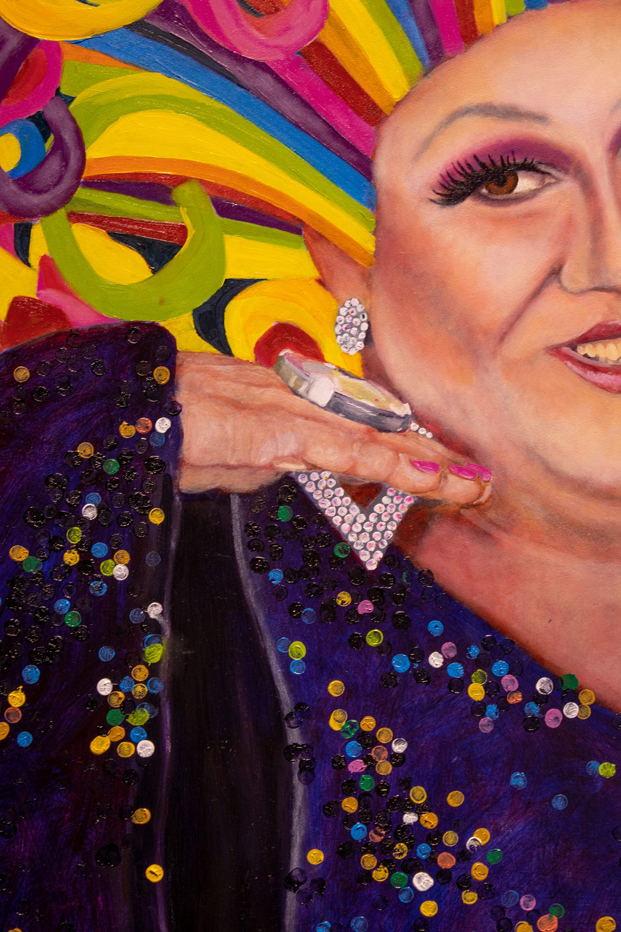 The scale of Humphreys’ oil paintings contributes to the sensation of reverence they impart. Roughly life-size or larger, they allow the viewer to get in close and admire the details of the clothing and accoutrements, both in the painting itself and in the craftsmanship of the drag artists (many of whom construct their own outfits). In the portrait "Juju Noir" you can practically hear the click of Noir’s thick acrylic nails against the rhinestones on her bodysuit.