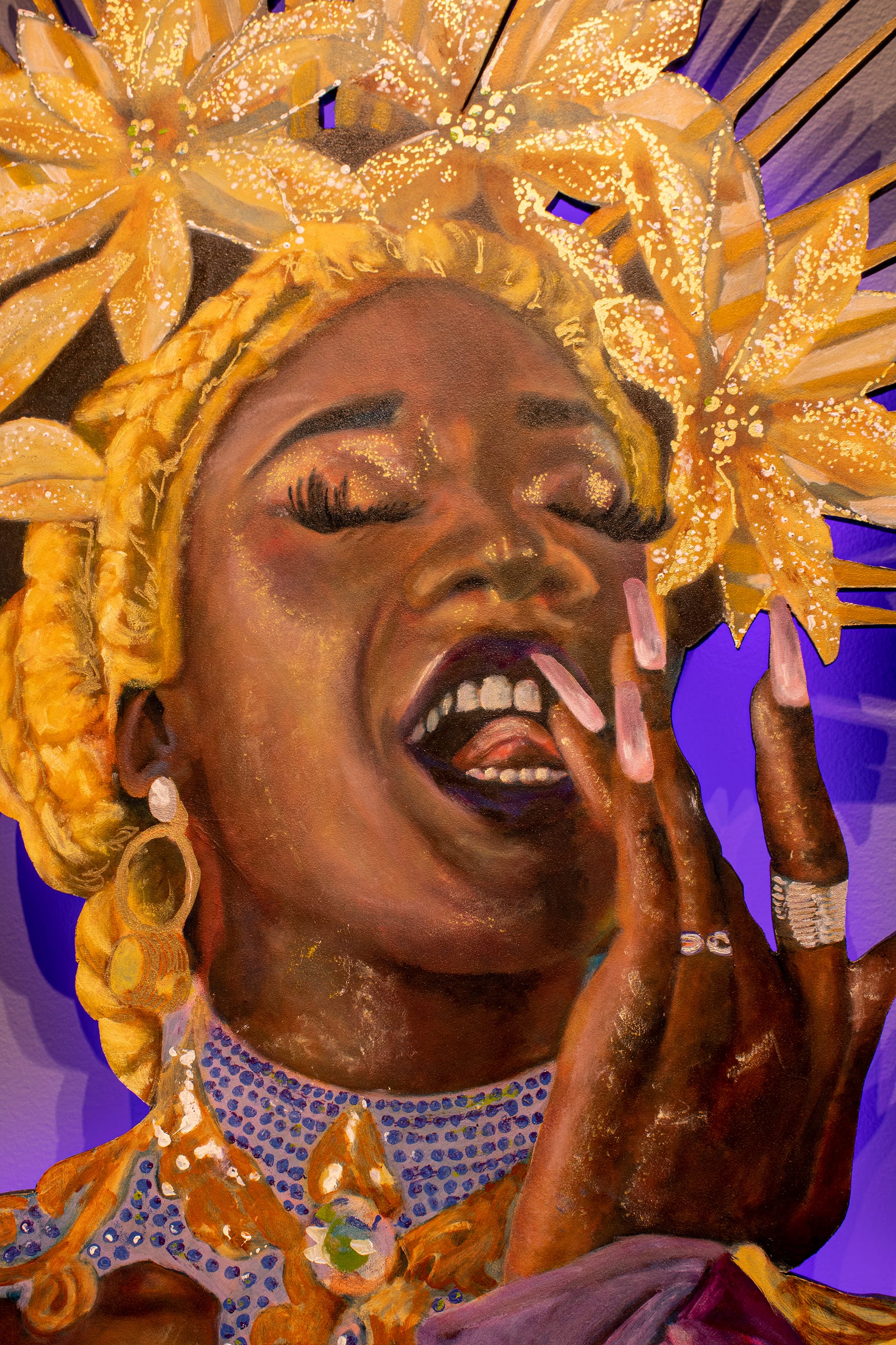 Humphreys’ attention to depicting the performers’ outfits is a key part of these portraits. Much of drag artistry lies in contemporary understandings of fashion and how it can be magnified, exaggerated, challenged, broken down, and rebuilt. For example, the subject in "Reign Regalia" lives up to her royal title through her dramatic, mandorla-like crown of gold lilies and outfit of lush fabrics and plaits of embroidery encrusted with gems. The portrait conveys a sense of regality — a savoring of the self. What I imagine the figure is tasting as she puts her finger to her tongue is a dribble of the nectar fallen from her crown of lilies, the aura of purple perfuming the space with the scent, and the fallout of pollen sprinkling her cheeks.