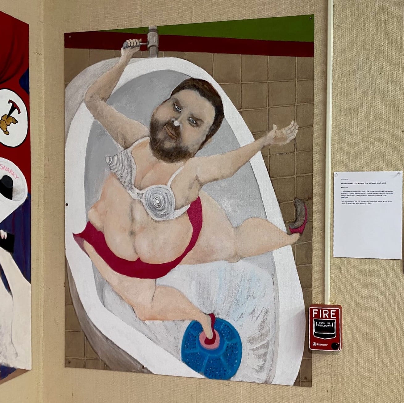 His work has always been narrative and figural, but since 2015 and coinciding with the rise of Trump, the stories and bodies are honed to an eloquent edge. Sen. Roger Marshall sports a smeary, off-center Hitler mustache in the poster image. Vice President J.D. Vance dances inside a urinal wearing a bra and toe shoes in “Inspirational Testimonial for Aspiring Rent Boys.”