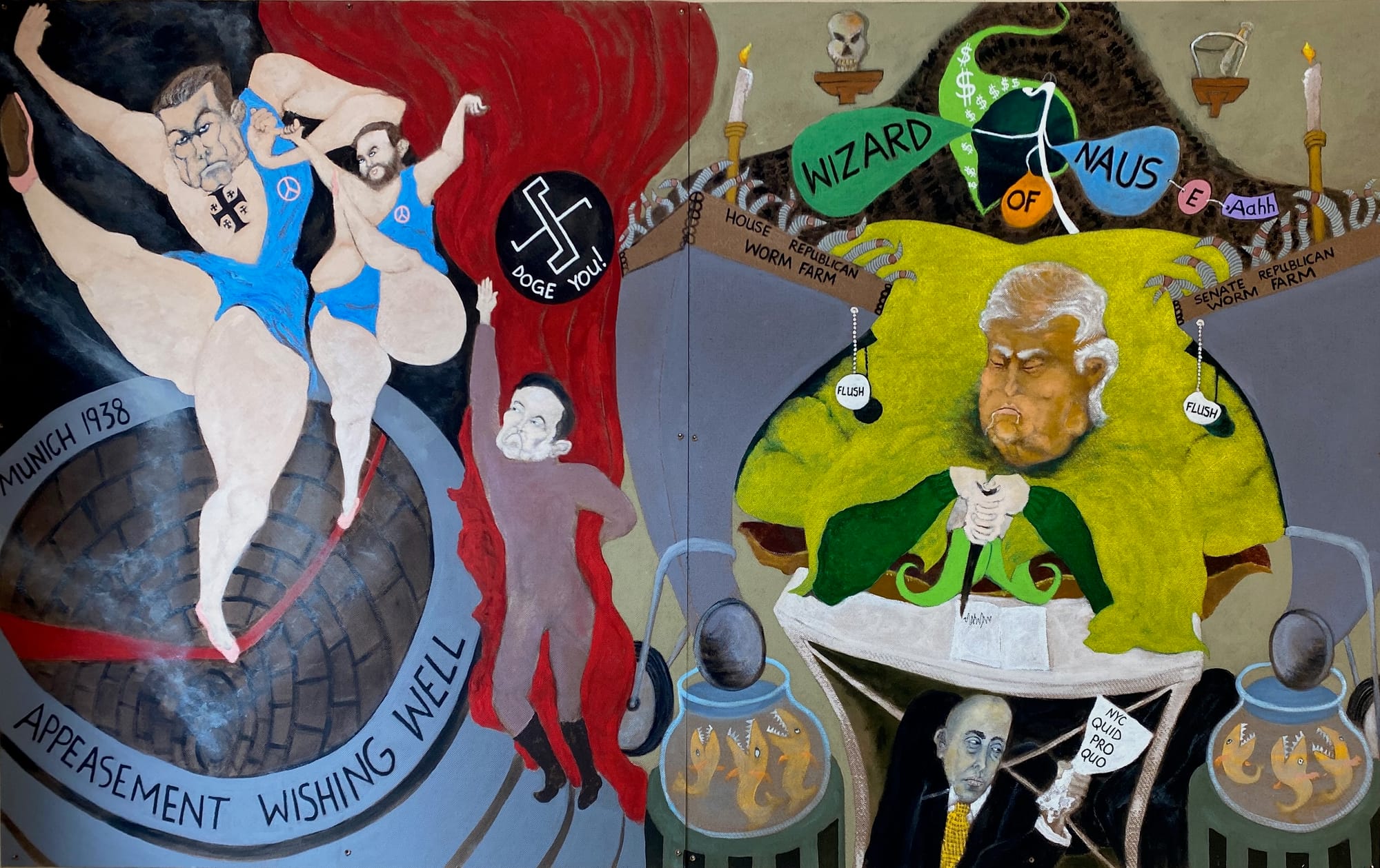 President Donald Trump’s various painted personae are as a flight attendant with Jeffrey Epstein ushering girls into a plane called Lolita, dressed as the Wizard of Oz (renamed the Wizard of Naus-E-Aaah), an actor on a stage giving scatalogical homage to Putin and Hitler, and a blubbery creature emerging from a golden toilet.