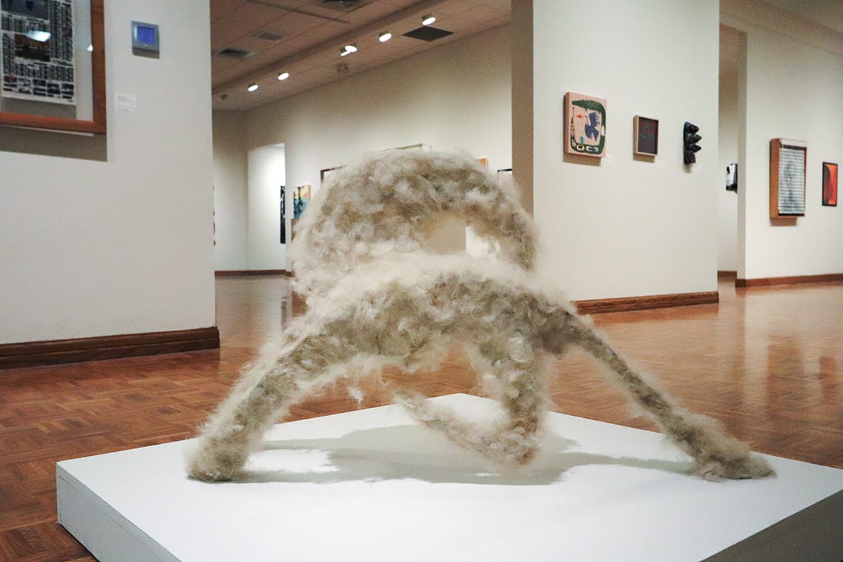 Left: Installation view of Elizabeth Nixon's "critter," 2023, Dog Hair, Wire, 2 by 4 by 2 feet. Photo courtesy of the Salina Art Center. Right: Installation view of Heather Schulte's "What we feel, we cannot say (RAGE, shame, GUILT)," 2022, cross stitch embroidery, 8 by 8 by 1 inch each. Photo by Chloe Lang for the SHOUT