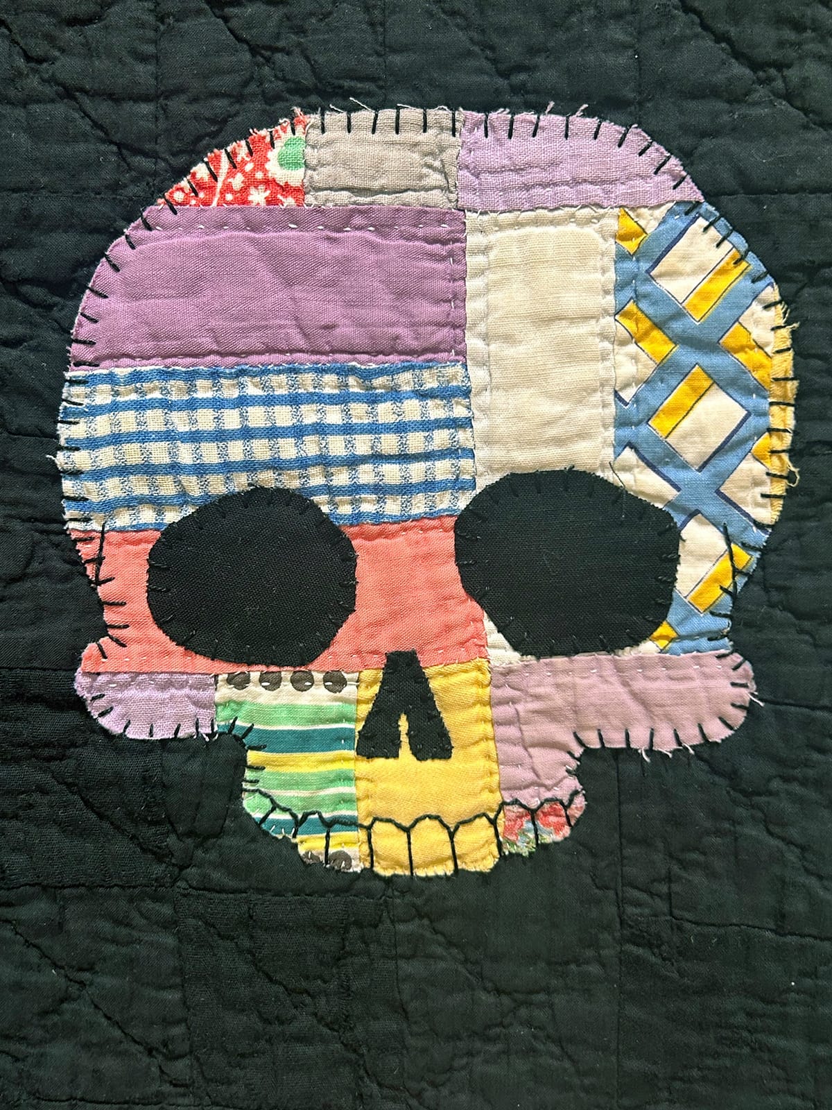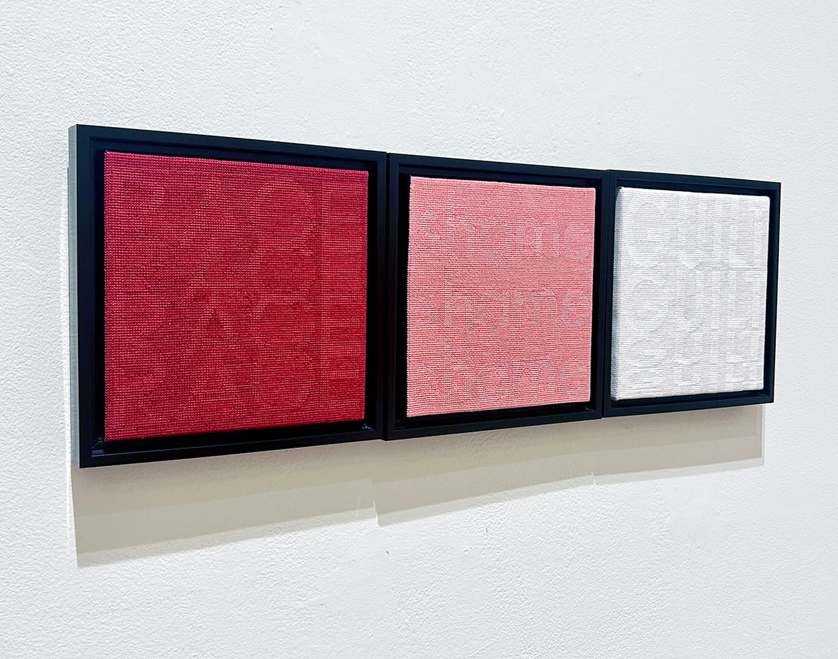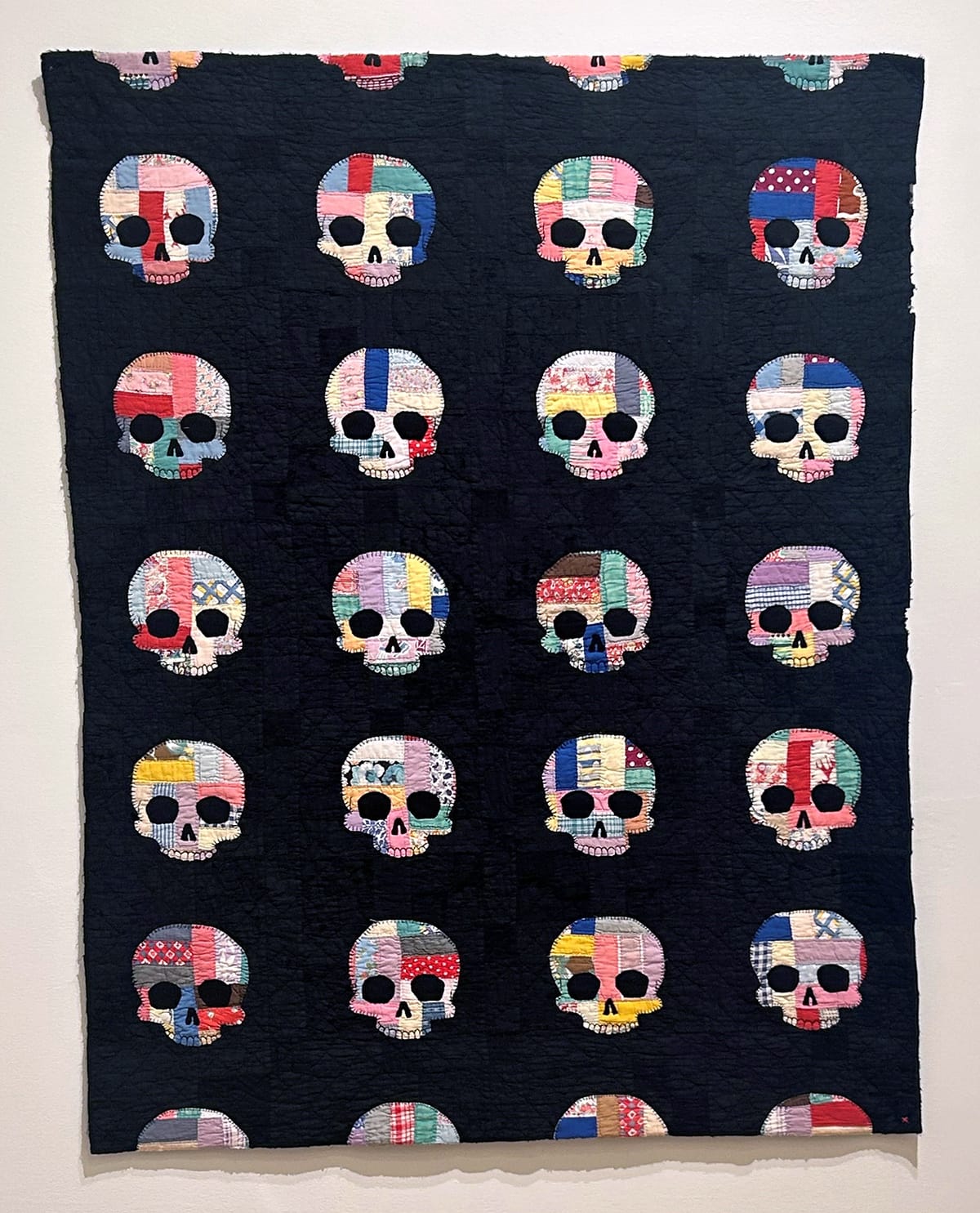 In the first gallery, craft as high-brow art dominates, whether in Maggy Rozycki Hiltner’s "Perpetual," an altered found quilt that features a striking design of twenty skulls, crafted from a variety of colorful fabrics creating a patchwork effect against a stark black backdrop; or Heather Schulte’s cross-stitch embroidery "What we feel, we cannot say (RAGE, shame, GUILT)," that emphasizes monochromatic and minimalist design, placing an emotional emphasis on the texture of the repeated text brought into being within each panel.