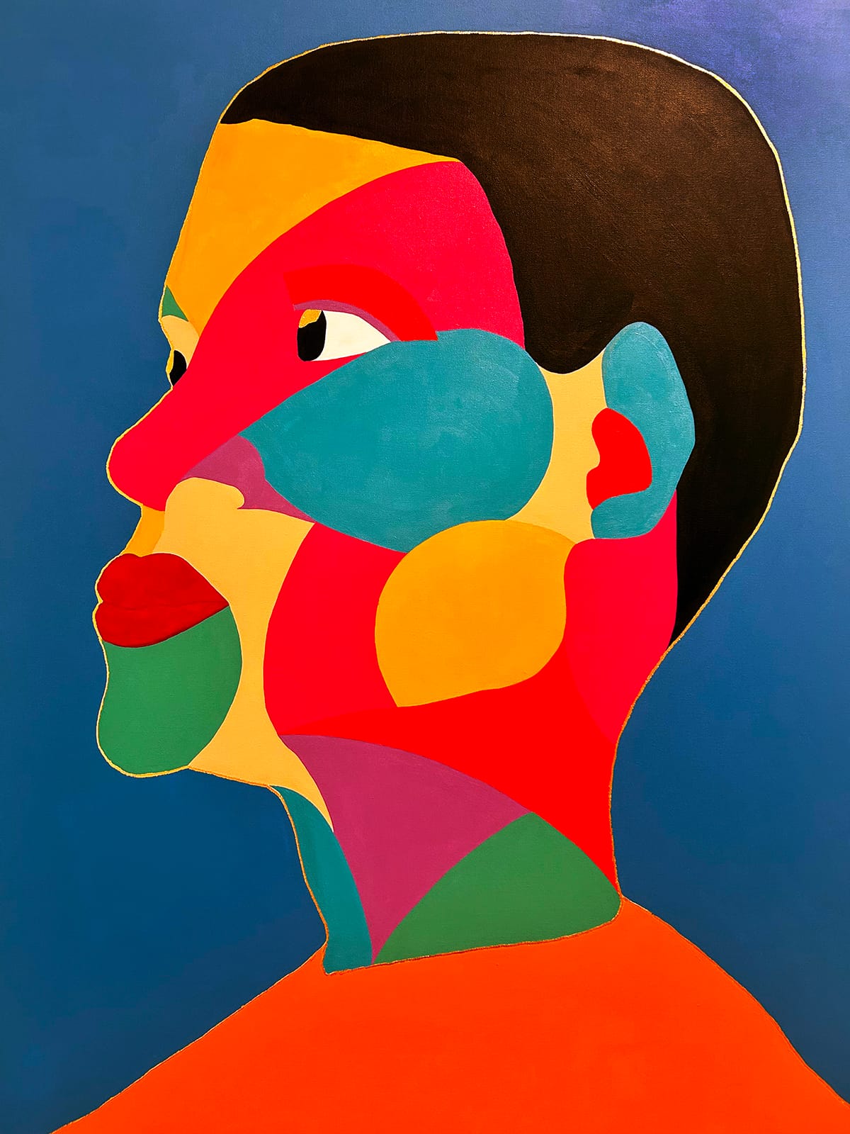 Across the gallery hangs a bold and bright contemporary portrait titled “Resplendent Resurgence” by Omaha, Nebraska-based artist Ang Bennett. Here the artist uses flat, vivid colors to create a patchwork effect within their subject’s face and neck, positioned against a solid blue background. The painting alludes to cartography, akin to the patchwork fields of the plains that one might witness from an aerial distance. Nicholas Kostnar employs a similar method of color blocking to depict form in his painting “Weak Antidote.” Kostner’s work, made in rural Kingman, Kansas, is abundant in both rhythm and balance, presenting psychological abstractions of surreal terrains.