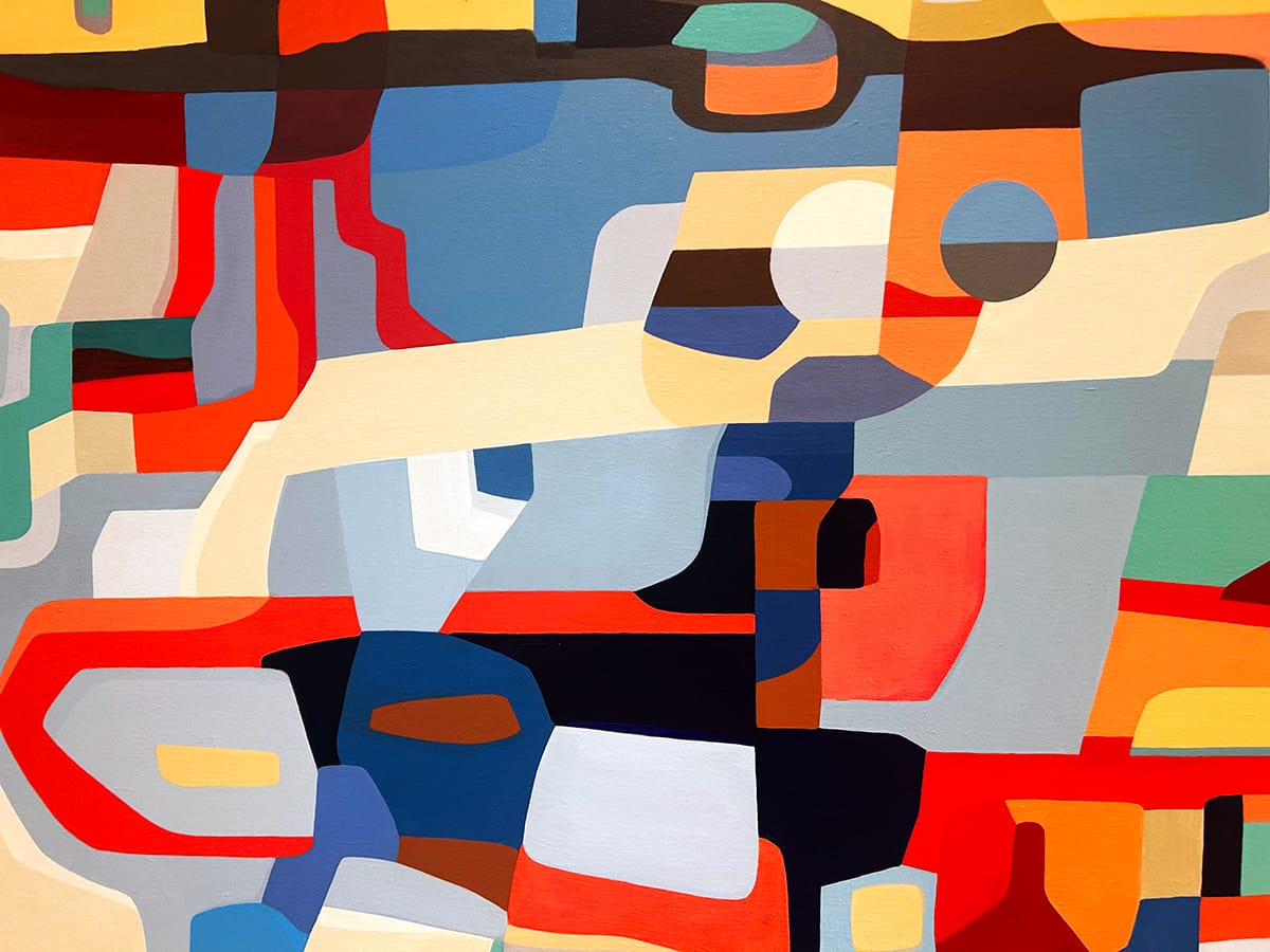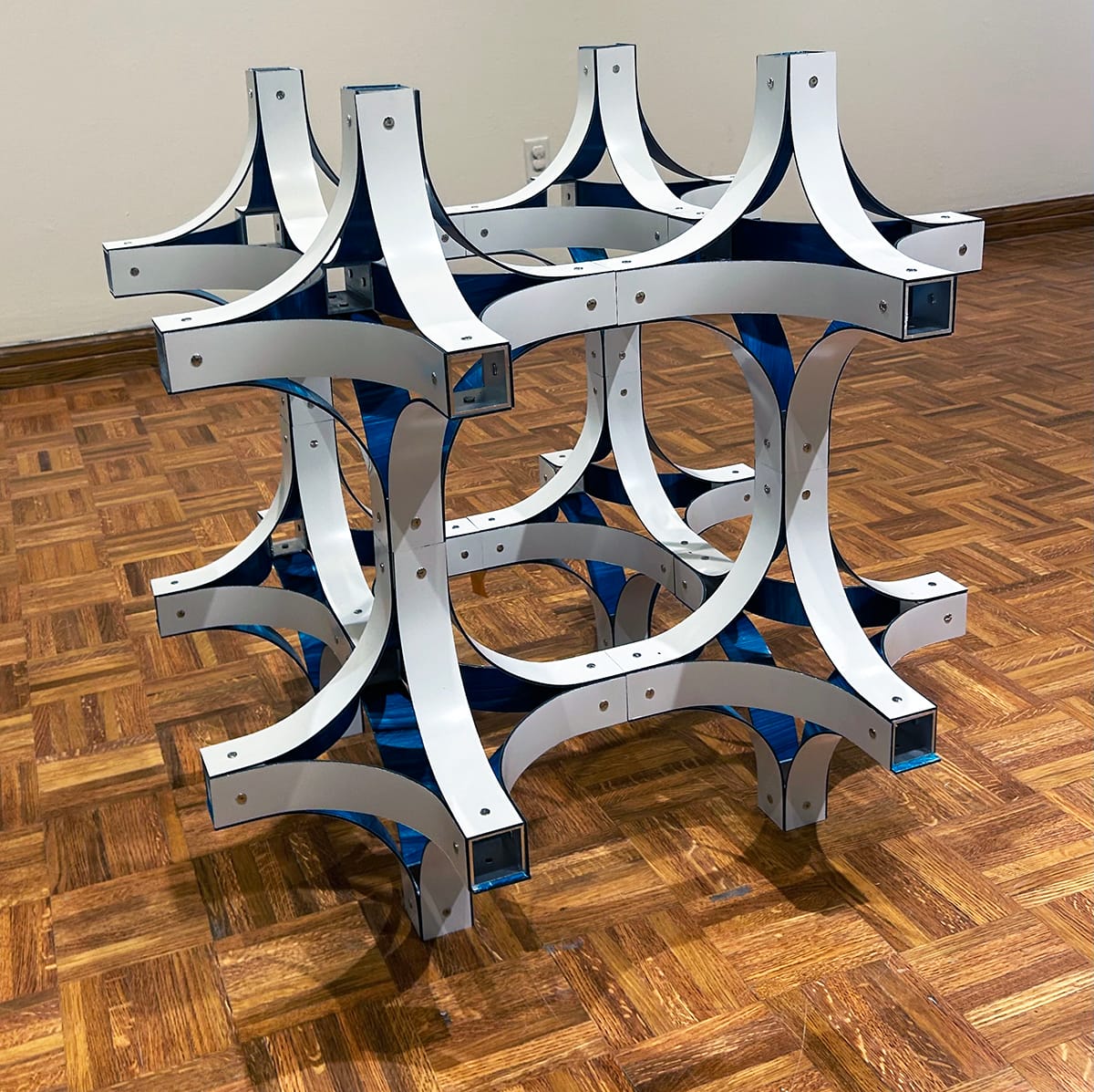 The exhibition concludes in a gallery brimming with material explorations in abstraction. Three strong sculptures stand in the center of the room, including a geometric work by Kansas City artist Cesar Lopez. The sculpture's design is reminiscent of a three-dimensional tessellation, where each unit contributes to a larger, cohesive whole. This modular approach evokes the spirit of modernist architectural principles, where form follows function, yet it transcends mere practicality through its aesthetic appeal.
