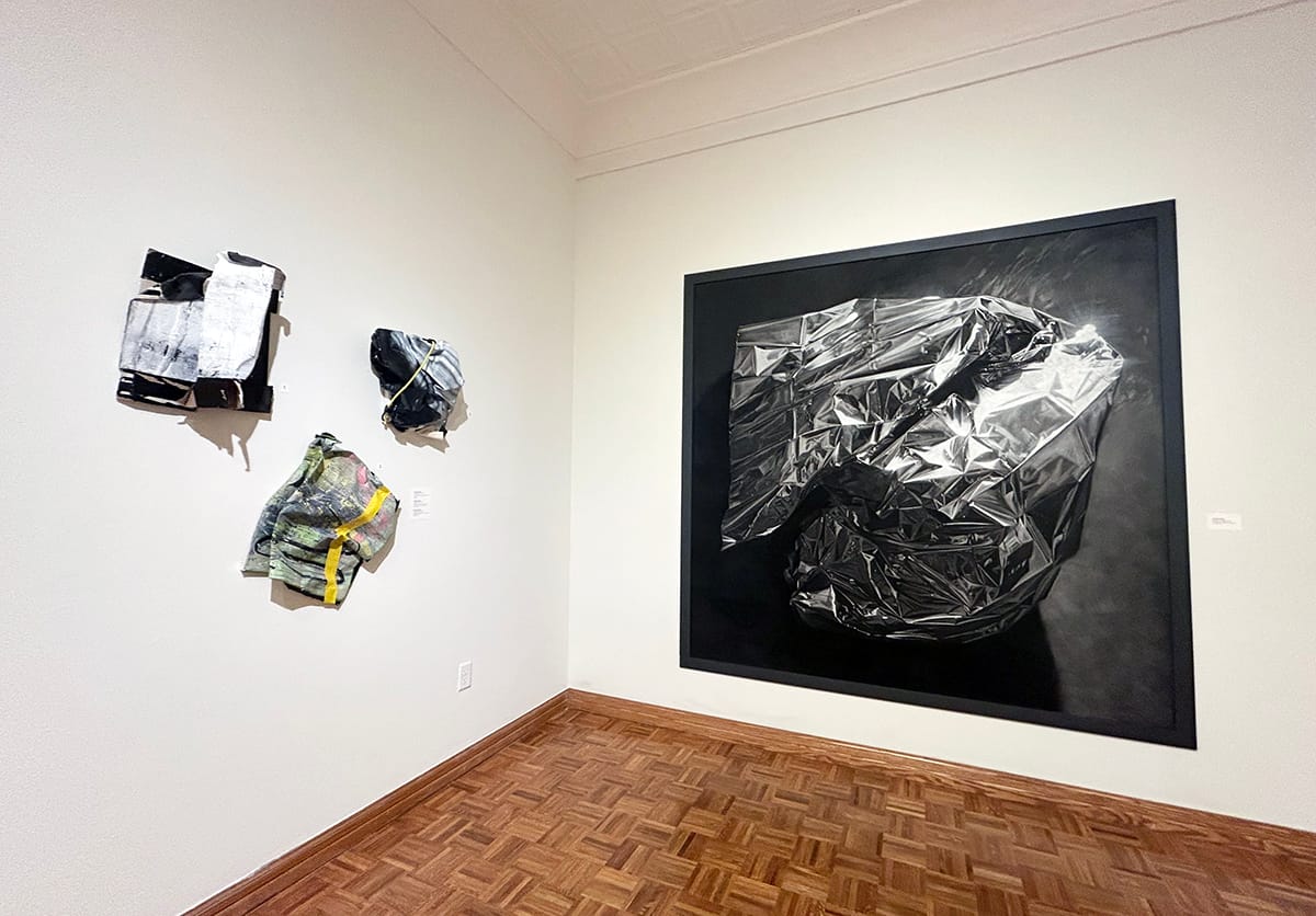 Anchoring the space at the corner are Matthew Hilyard and Shelby Shadwell’s works, arranged in a delightful conversation centering around concave and convex form. The interplay between the three-dimensional and two-dimensional is energizing. Hilyard’s manipulated canvases burst from their underlying stretcher bars, and Shadwell’s highly technical charcoal and pastel on polyester drawing of an emergency blanket is seemingly illuminated against a dark, somber background.