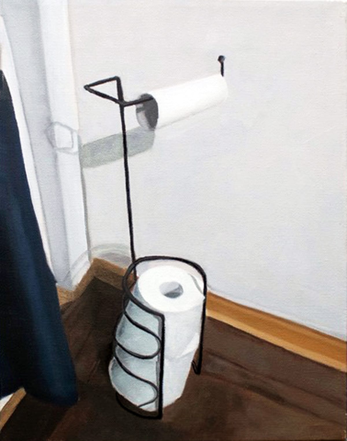 This exhibition often presents multiple works by each artist, which deepens the viewer's engagement and provides meaningful context. Lim Puoch's contemplative oil paintings, including "Pink Sink'' and "Rolls on Deck," offer intimate renderings of personal narratives within everyday contexts. In particular, the pink-tiled bathroom symbolizes more than just a color choice — it captures a cultural moment following World War II when optimism and prosperity dominated American suburbia, and the aspirations of the burgeoning middle classes’ desire for homes that were not only functional, but also stylish. Through advances in mass production, pink toilets, sinks, tiles, and bathtubs became commonplace in homes across America. In Puoch’s paintings, these quiet and private environments are captured amidst the hustle and bustle of daily existence, echoing the introspective themes Edward Hopper often explored in his paintings.