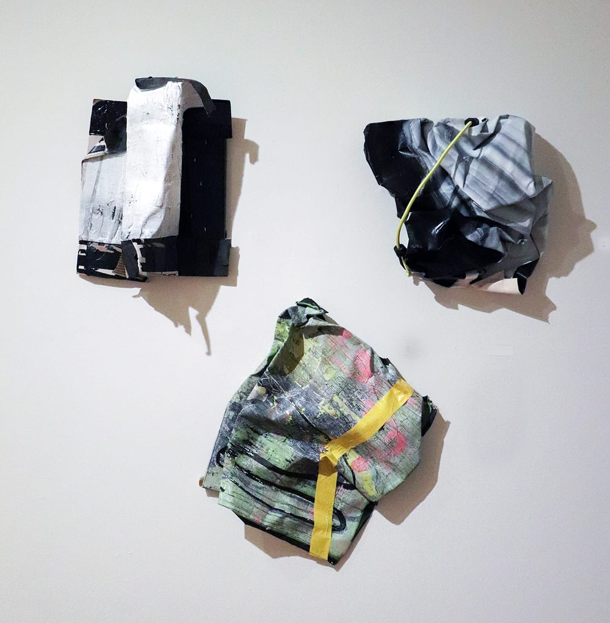 From top/left: Cesar Lopez's "Structural Unit: Cube," 2023, Aluminum composite material, aluminum, rivets, 40 by 40 by 40 inches. Installation view of three works by Matthew Hilyard: "#B336," 2023, acrylic/staples/spray enamel/shaped canvas, 20 by 15 by 9 inches; "#F248," 2023, acrylic/spray enamel/bungee cord/shaped canvas/wood stretcher, 21 by 15 by 9 inches; "How does it feel," 2023, duct tape/acrylic/spray enamel/tape/shaped canvas, 22 by 17 by 3 inches; and Shelby Shadwell, "Emergency Blanket 9," 2022, charcoal and pastel on polyester, 85 by 85 inches. Another view of Matthew Hilyard's works. Photos by Chloe Lang for the SHOUT