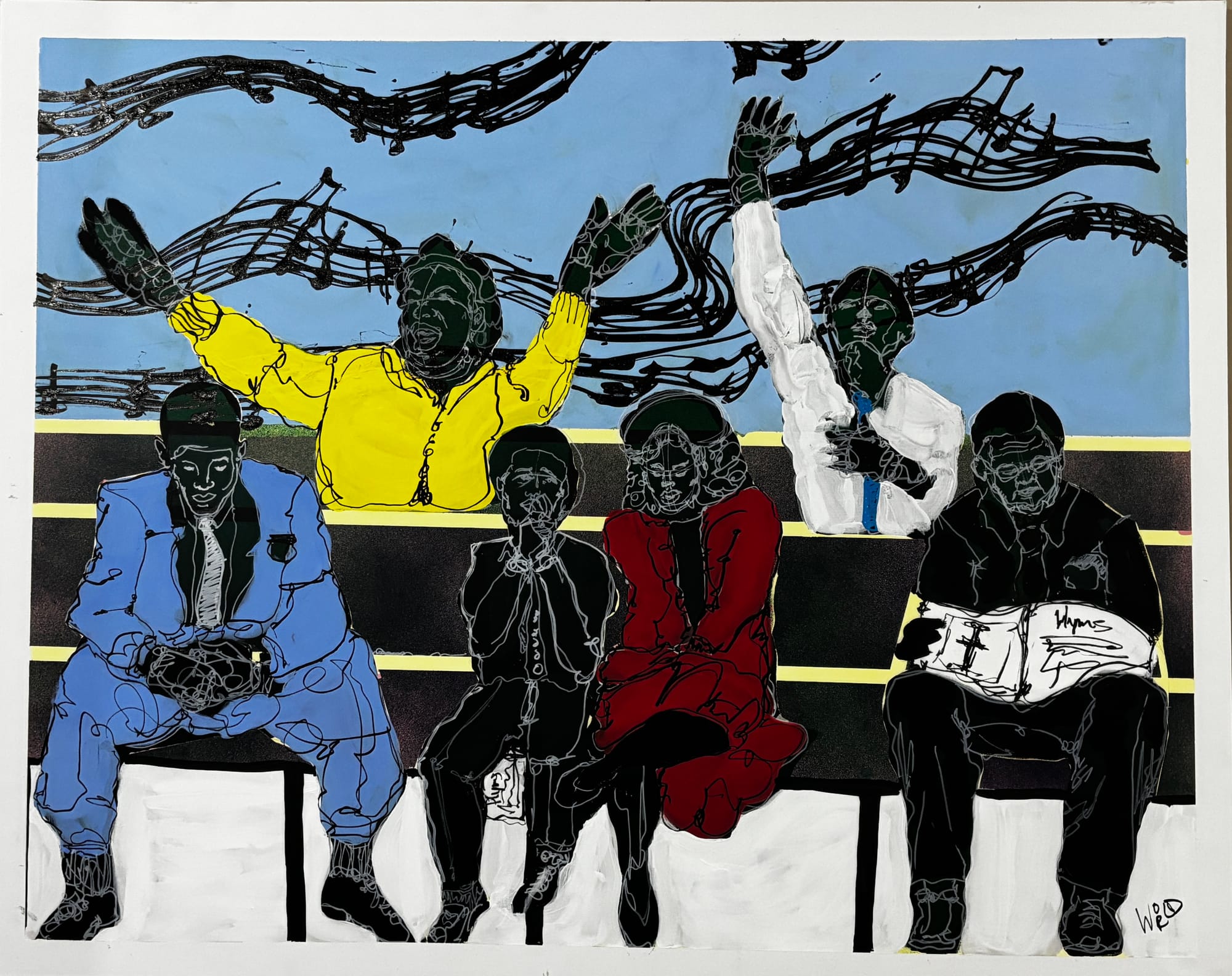 Morrow’s pieces “CD Ministry” and “Church Folk” focus on growing up in the Saint James Missionary Baptist Church, where he used to sing in the choir with his mom. He uses a bright and limited color palette to add exuberance to the soulful subjects of his scenes.