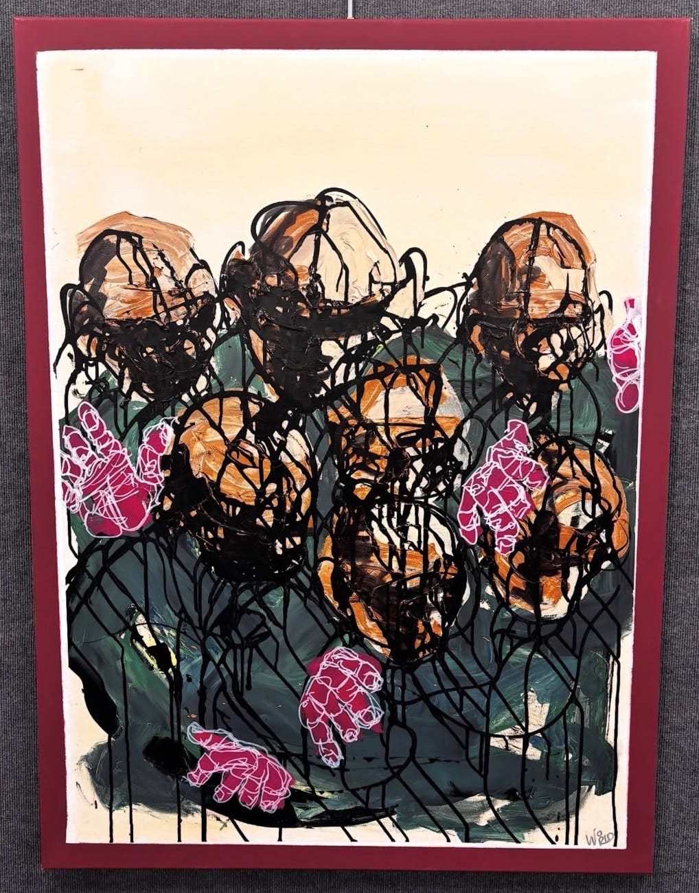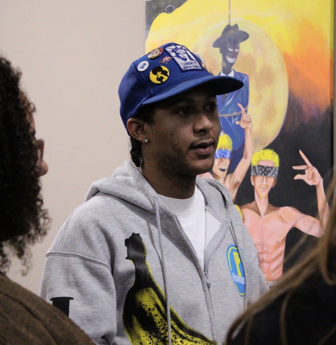 While visitors described some of the art as “feel-good,” the troubling side of Black history is also represented. In paintings like “Critique of Political Economy as a Shadow of Its Former Self” and “Pursuit of Happyness” by Jelani Billie-Soto, viewers come face-to-face with evil, including depictions of lynching and police brutality.