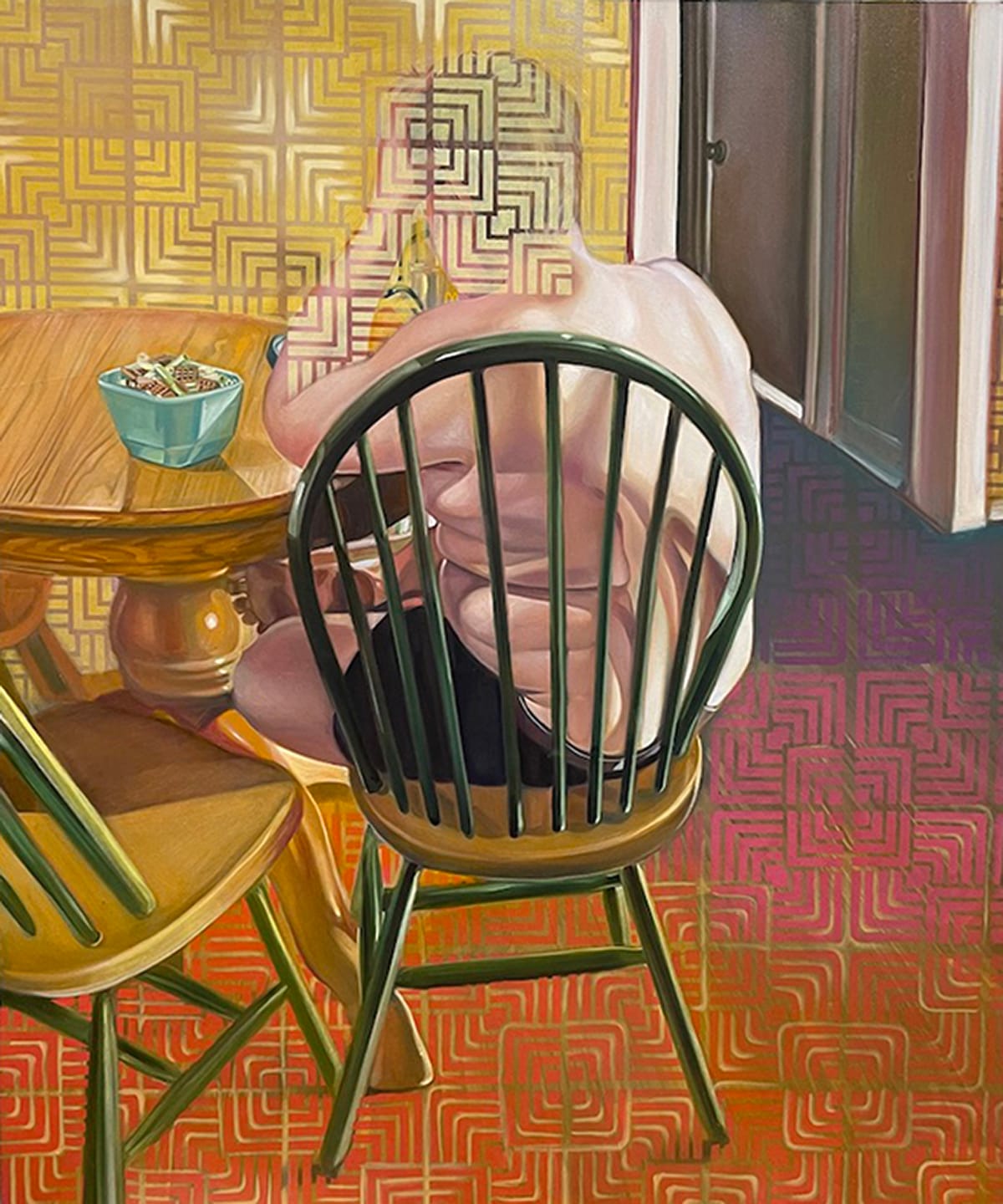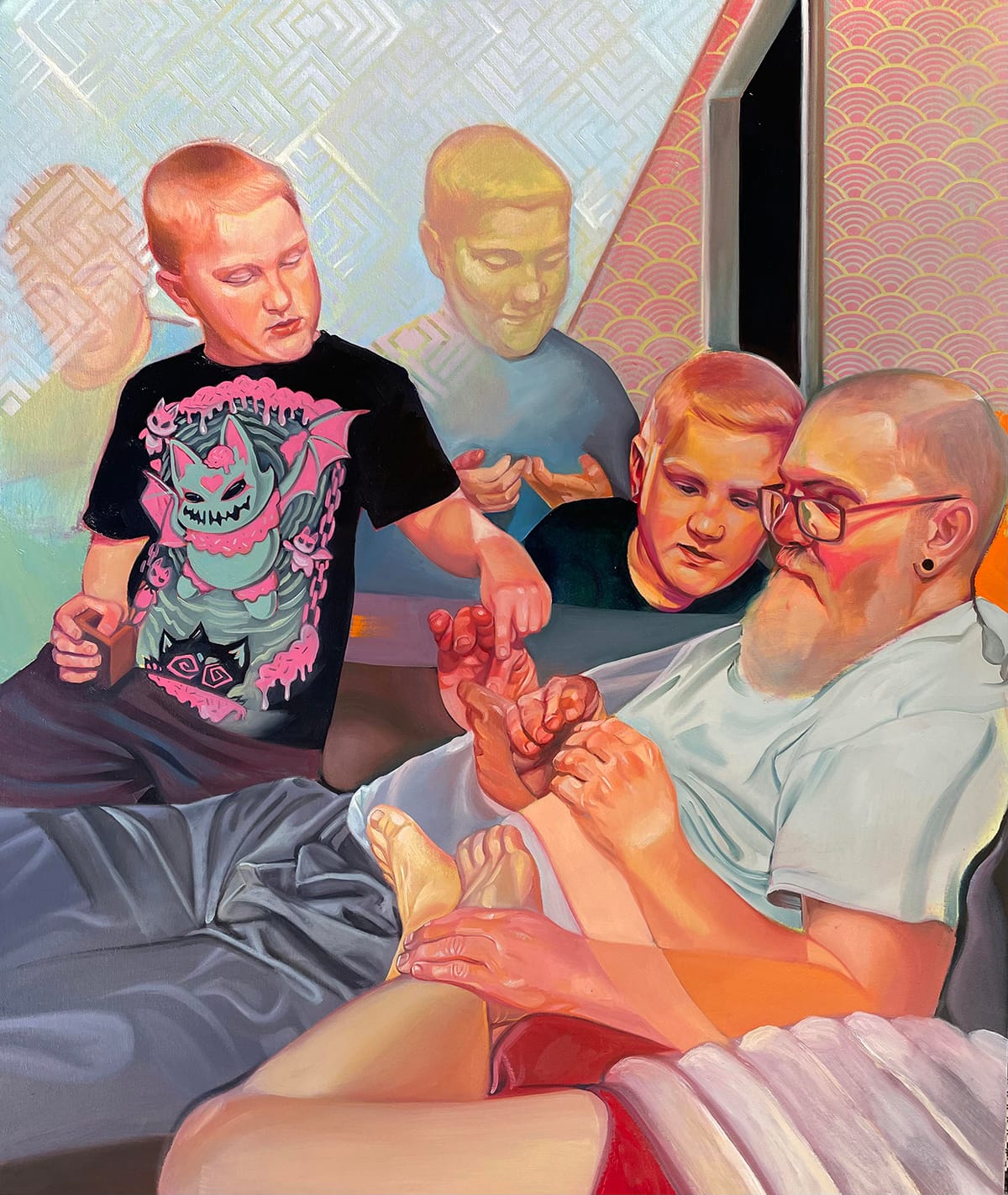 Finally, speculative though this is, I wonder if for Curtis, the idea that the world of a deeply loved person might be entirely inaccessible is more real and far less metaphorical than for most of us. She talks openly about the fact that both of her sons are autistic, and one of them, Fionn, the second person pictured multiple times in "Dissolution," is nonverbal. According to Curtis, she created "Fionn" based on a selfie her son took with her phone, leading the artist to wonder what he might have been thinking when he did so. In "ASMR," we see the flip side of that curiosity. This is a tender depiction of Fionn from the back, behind another patterned overlay, infused with the acceptance that he may live in a world inaccessible to others, but it’s a world of rich sensory pleasure.