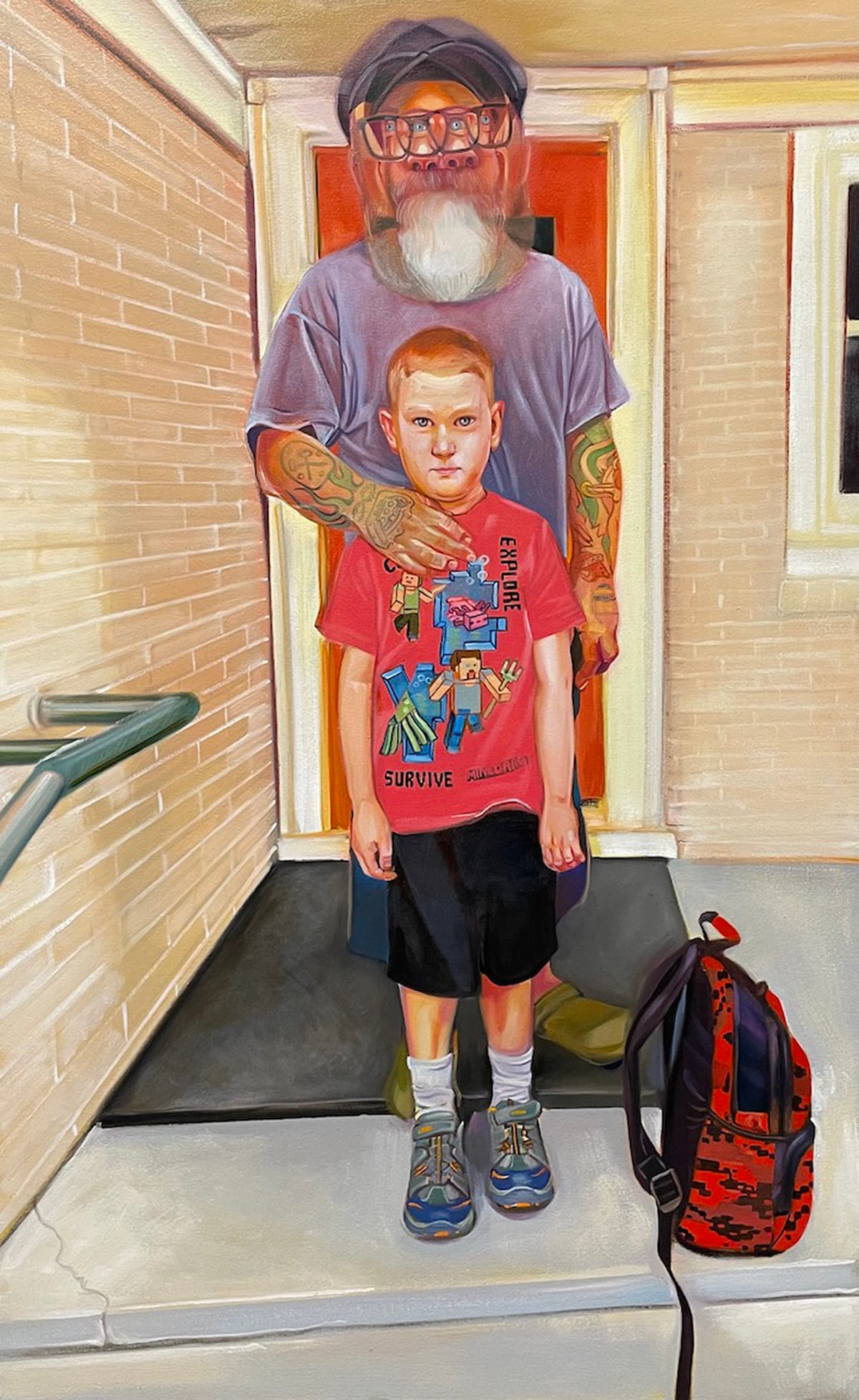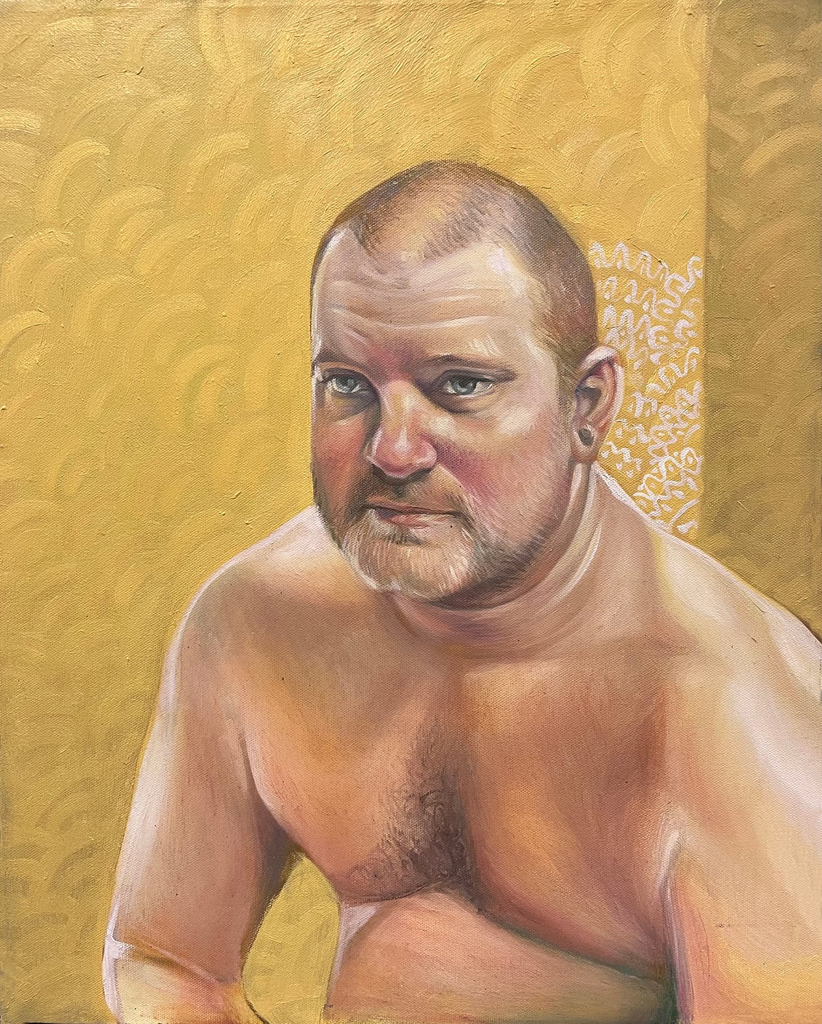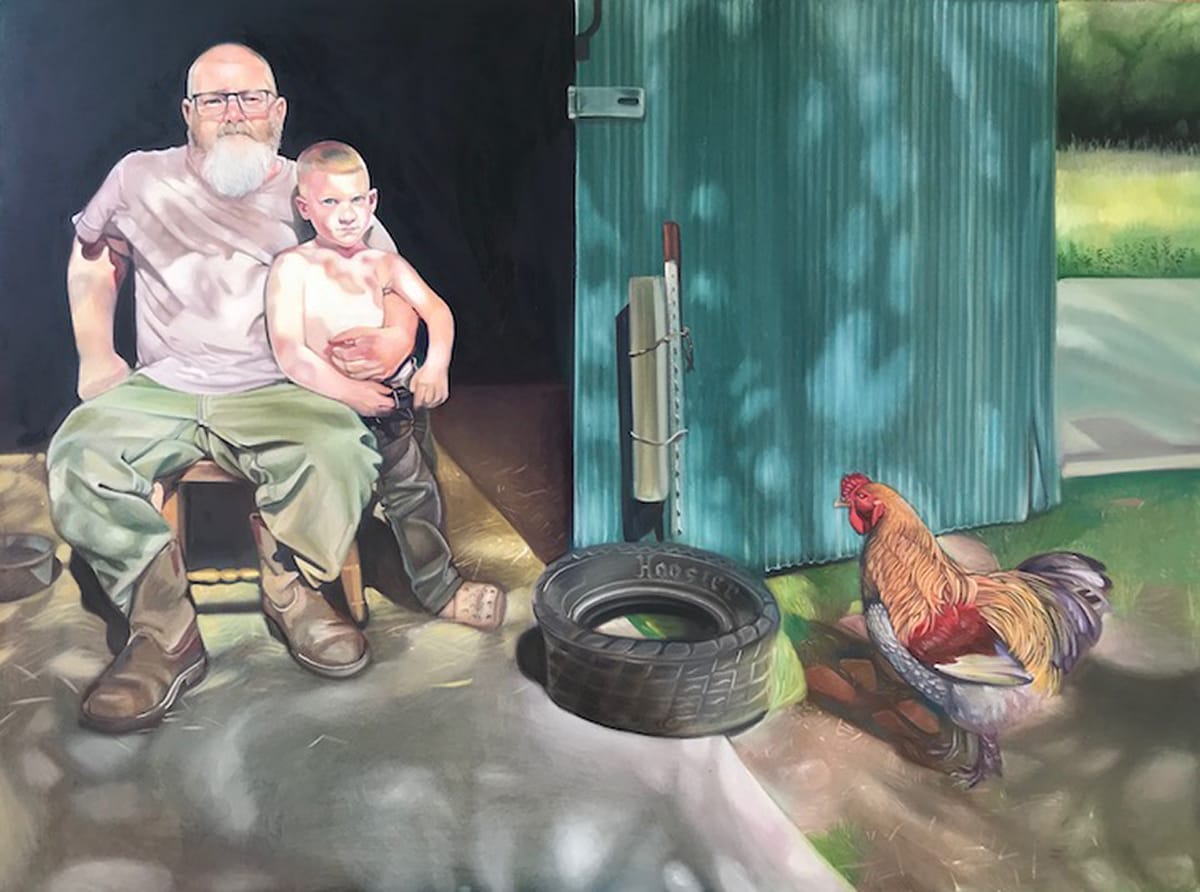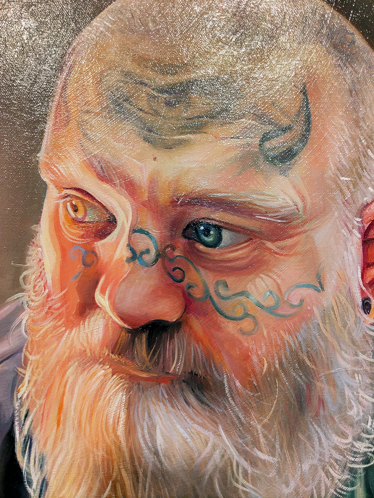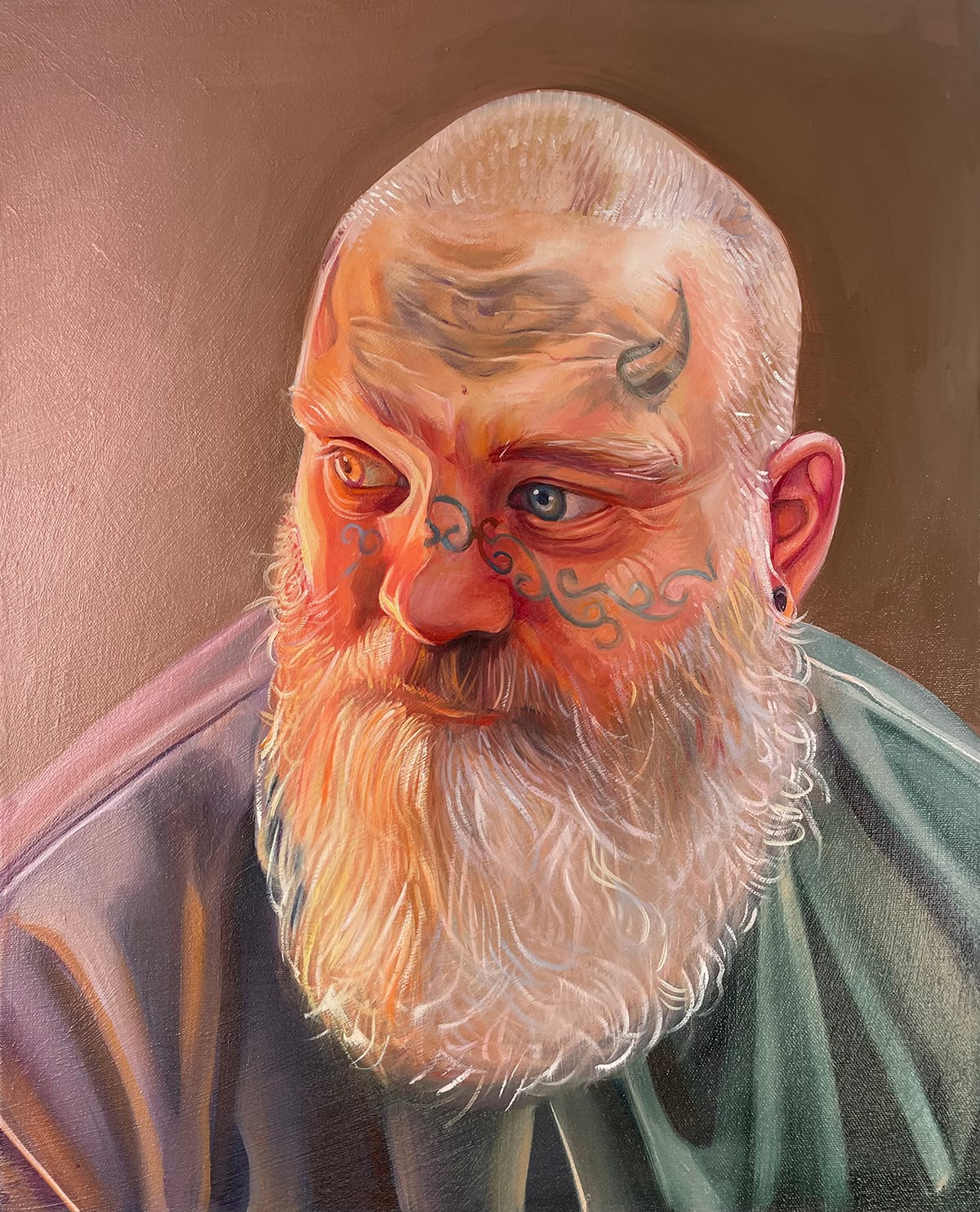 We see this in Curtis’ attempts to capture Frank not as a father, but a standalone person: first, in the 2010 portrait "Frank," then in a 2023 portrait with the same title, and finally in the 2024 painting "'A really nice guy'" (a phrase that in the context of romantic relationships is often followed by a “but”). There’s a big jump in the artist’s skill level from the first portrait to the second; it covers the distance from the artist learning to create a believable likeness in the first work to capturing in the second the wizened attitude of a person who has seen things, amplified here by the subject’s facial tattoos (all real). In the second painting, the choice of two different colors for both Frank’s eyes and shirt also becomes an artistic embellishment more subtle than placing little angels and devils on his shoulders.