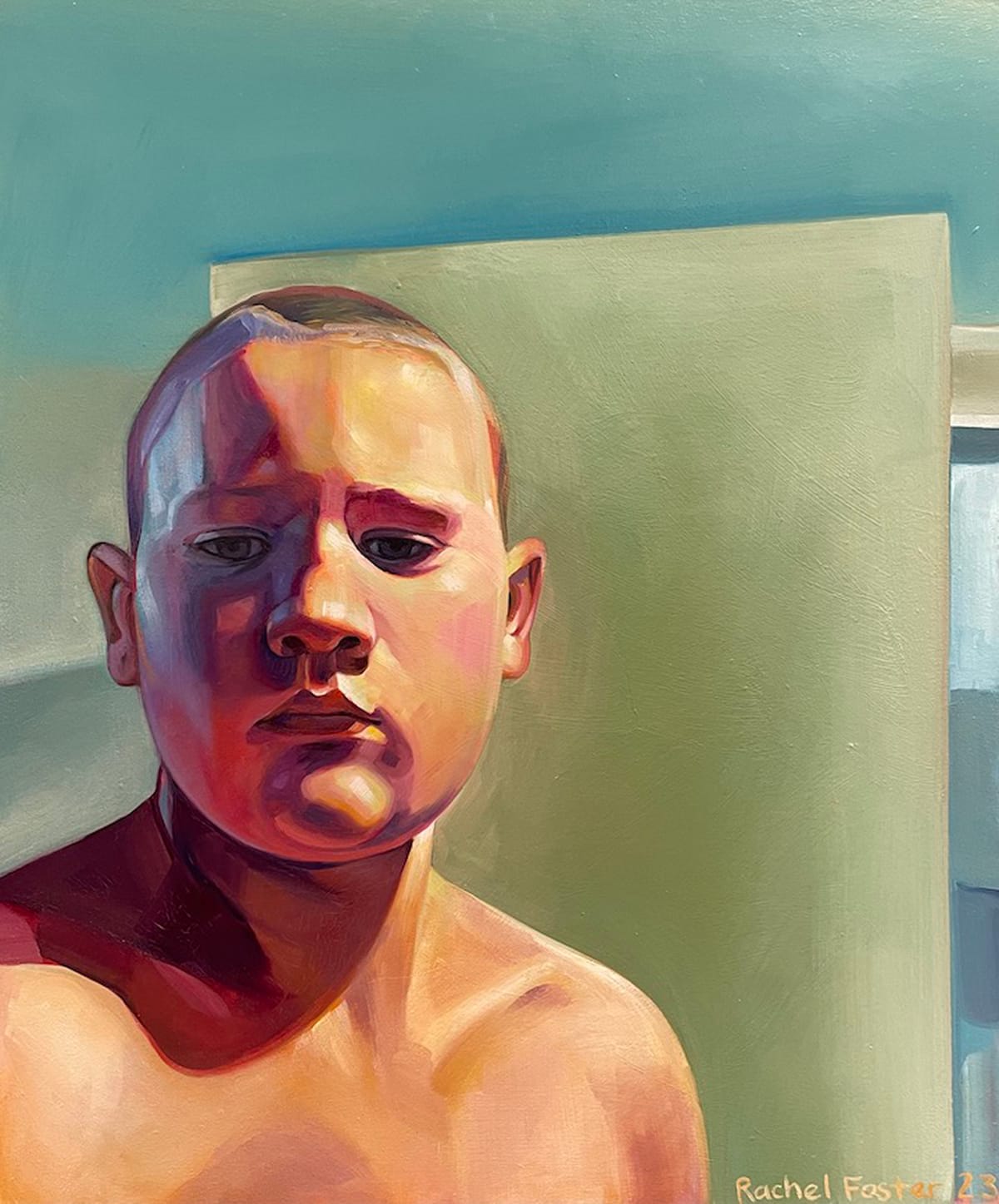 From top left: Rachel Curtis, "Frank (2010)," 2010, oil on canvas. Rachel Curtis, "Frank (2023)," 2023, oil on canvas, 20 by 16 inches. Images courtesy of the artist. Detail of "Frank (2023);" Rachel Curtis, “'A really nice guy,' (in progress)” 2024, oil on canvas, 22 by 30.5 inches. Photos by Ksenya Gurshtein for the SHOUT.