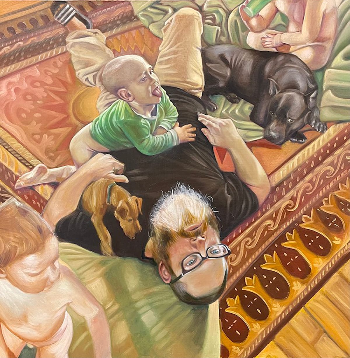 One of the subtle but significant things that the compositional choices and scale of these paintings highlight, more than a source photograph can, is the physicality of child rearing. In the paintings, Frank is always in close proximity to his sons, their bodies most often touching. As a parent of a 3-year-old whom I remind regularly that my body is not a toy or a jungle gym, I find the controlled chaos of human and animal bodies intertwined in motion, moving in and out of the frame and lounging atop the recumbent father in "Frank Falling" deeply poignant. So is the multivalence of the title: Is Frank falling down? Falling head over heels in love? Falling asleep? All three are plausible and would capture the mix of elation and exhaustion that often characterizes parenting.